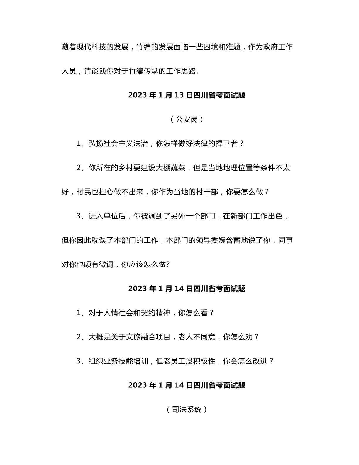 【实时真题】四川省公务员考试面试真题(2023年)2023年四川省公务员考试面试真题(2023.1)2023年1月13日四川省考面试题(乡镇岗)1、党的二十大提出守正创新,请你以“变与不变”为主题,发表一篇演讲。(答案参见:【面试热点】党的二十大会议精神——守正创新)2、互联网为电商发展提供了便利条件,近几年电商发展迅猛,你打算在村内发展电商,销售当地农产品,但是此项目在群众心目中不受欢迎,你该怎么办?3、竹编的历史可以追溯到两千三百多年前,古人用竹材编制劳动工具和生活用具。到唐代,竹编业已十分发达,日常
