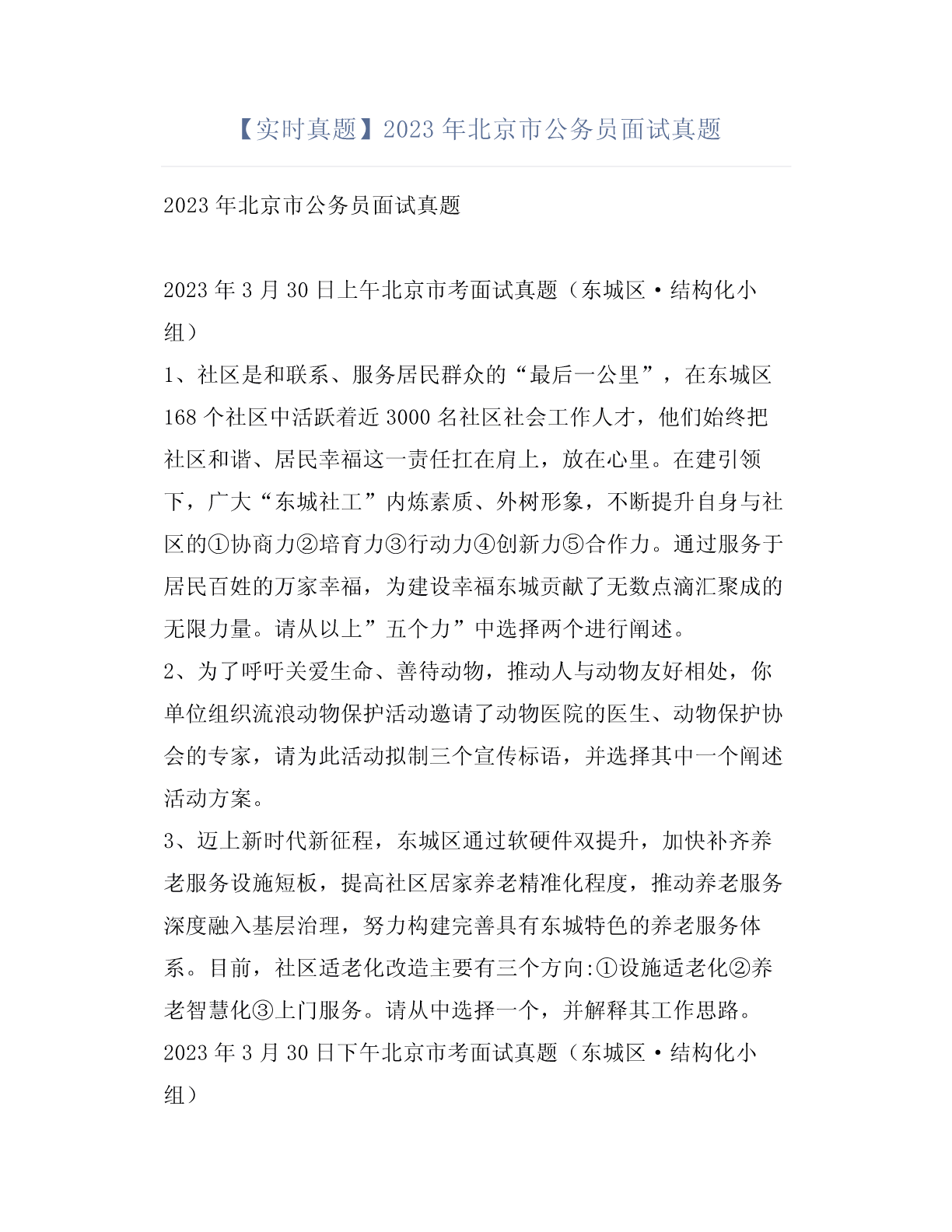 【实时真题】2023年北京市公务员面试真题2023年北京市公务员面试真题2023年3月30日上午北京市考面试真题(东城区·结构化小组)1、社区是和联系、服务居民群众的“最后一公里”,在东城区168个社区中活跃着近3000名社区社会工作人才,他们始终把社区和谐、居民幸福这一责任扛在肩上,放在心里。在建引领下,广大“东城社工”内炼素质、外树形象,不断提升自身与社区的①协商力②培育力③行动力④创新力⑤合作力。通过服务于居民百姓的万家幸福,为建设幸福东城贡献了无数点滴汇聚成的无限力量。请从以上”五个力”中选择两个