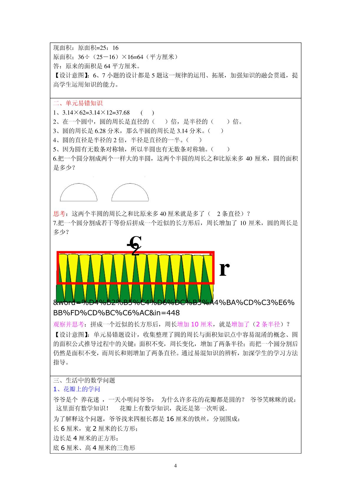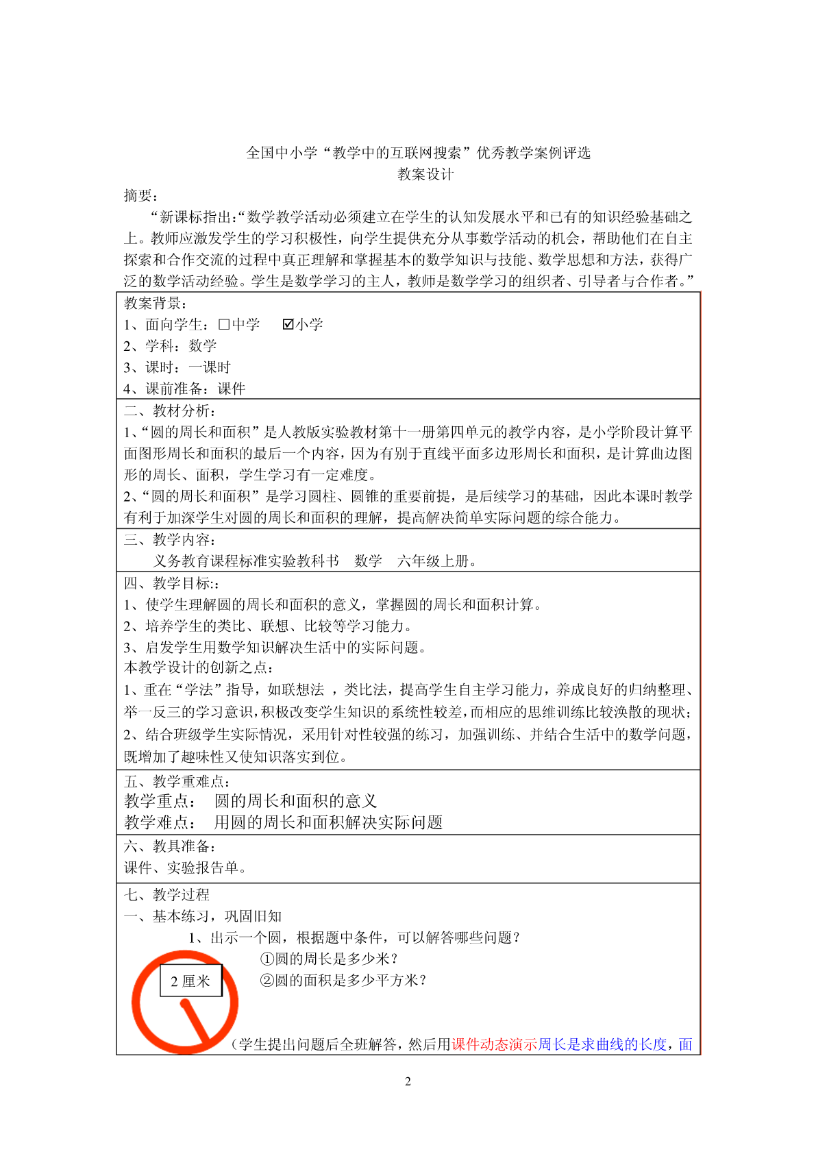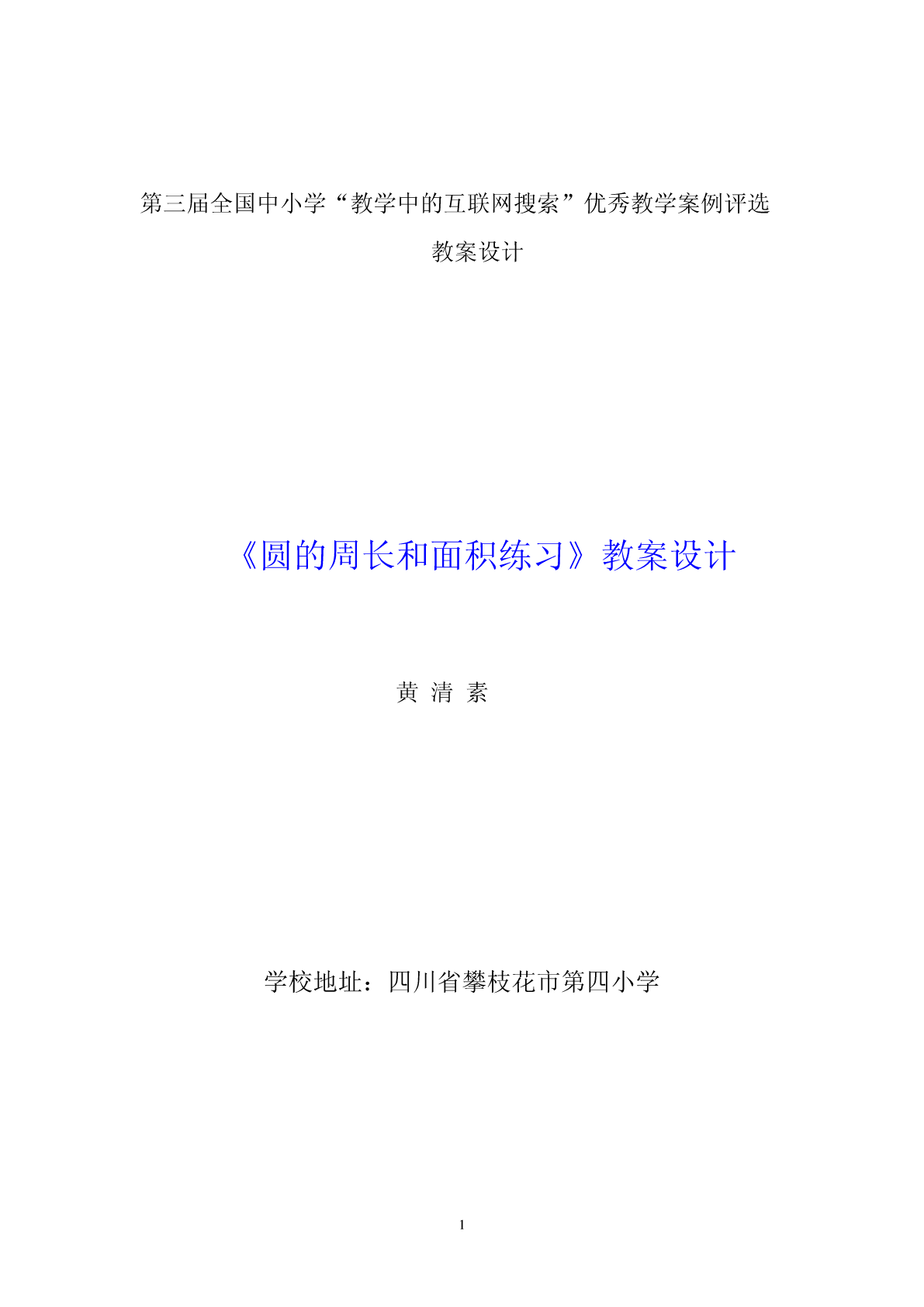 第三届全国中小学“教学中的互联网搜索”优秀教学案例评选教案设计《圆的周长和面积练习》教案设计黄清素学校地址:四川省攀枝花市第四小学1全国中小学“教学中的互联网搜索”优秀教学案例评选教案设计摘要:“新课标指出:“数学教学活动必须建立在学生的认知发展水平和已有的知识经验基础之上。教师应激发学生的学习积极性,向学生提供充分从事数学活动的机会,帮助他们在自主探索和合作交流的过程中真正理解和掌握基本的数学知识与技能、数学思想和方法,获得广泛的数学活动经验。学生是数学学习的主人,教师是数学学习的组织者、引导者与合作者
