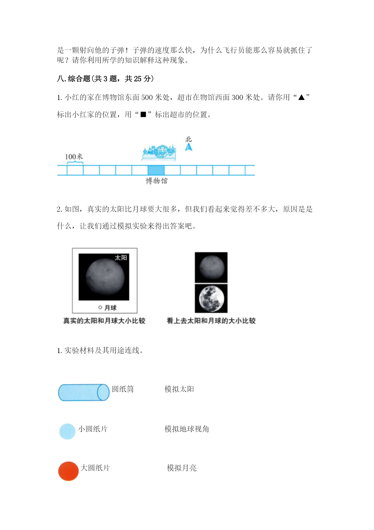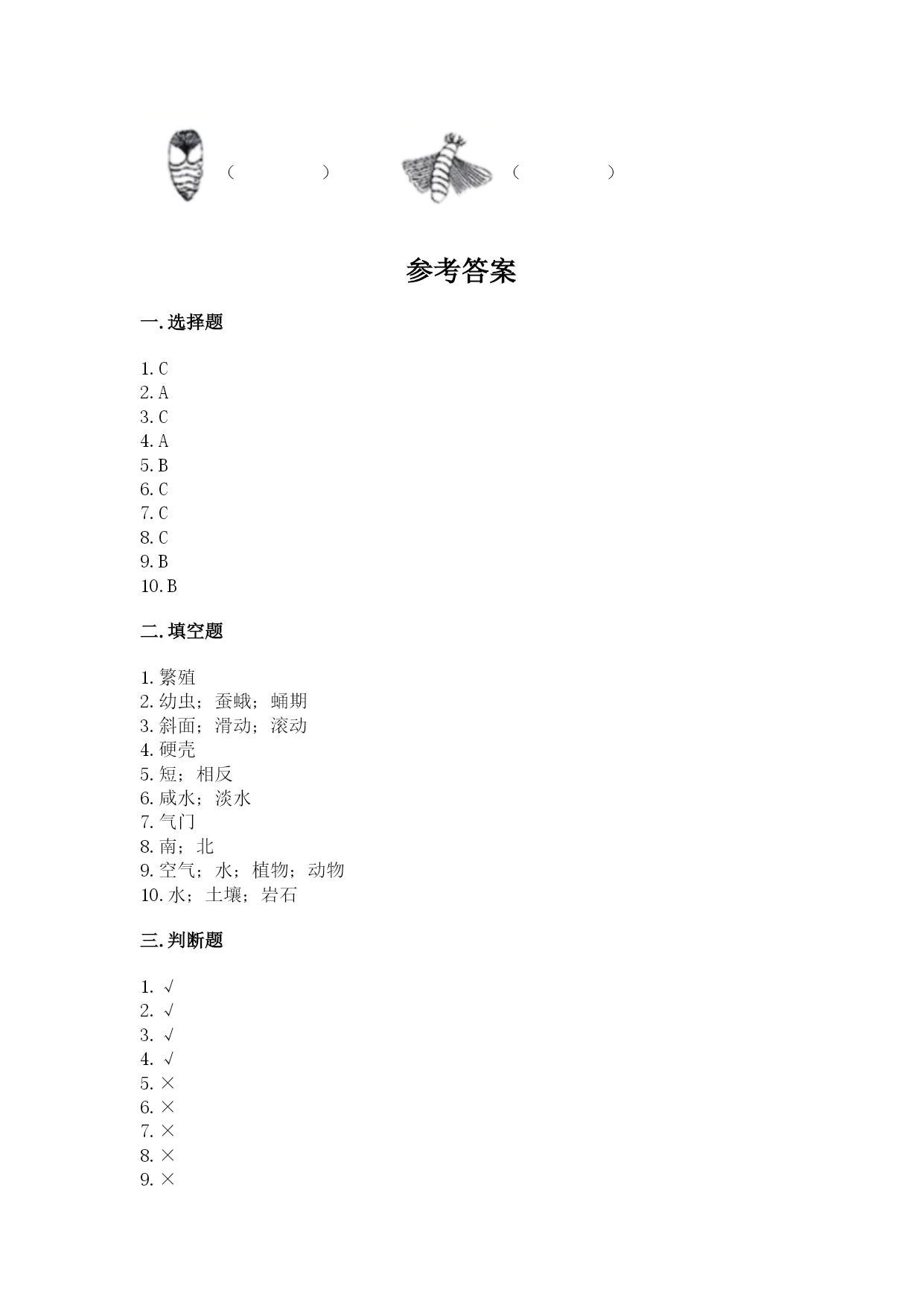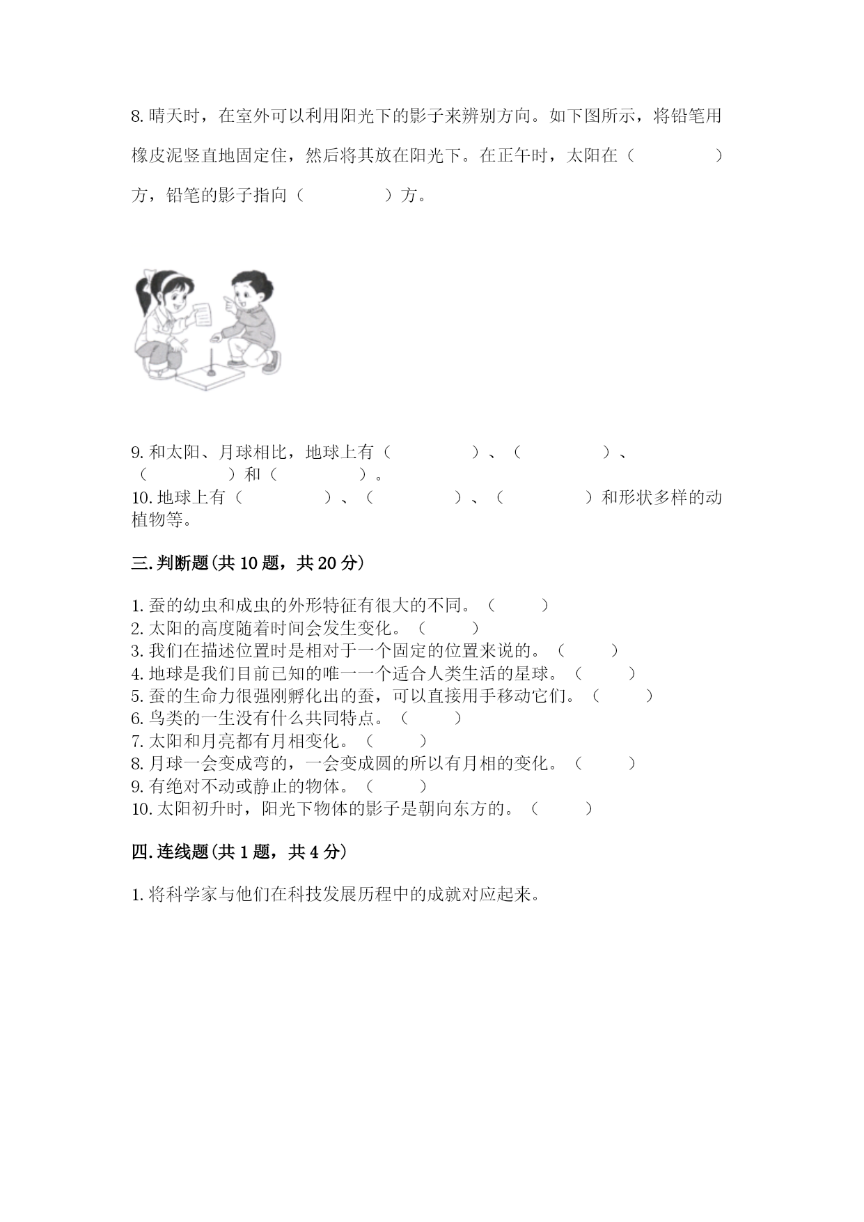 教科版科学三年级下册期末测试卷一.选择题(共10题,共20分)1.一个完整的月相周期的时间为()。A.一个星期B.一个月C.一年2.在太阳的光球层上,有一些旋涡状的气流,像是一个浅盘,中间下凹,我们称之为太阳黑子的原因是()。A.它本身是黑色的B.黑子本身并不黑,它的温度比周围要低一、二千摄氏度C.黑子本身并不黑,它的温度比周围要高一、二千摄氏度3.雄蛾具备下面()的特点。A.腹部小,触角黑色,爬得慢B.腹部小,触角灰色,爬得慢C.腹部小,触角黑色,爬得快4.利用手电筒和木圆柱模拟影子变化的实验中,手电筒