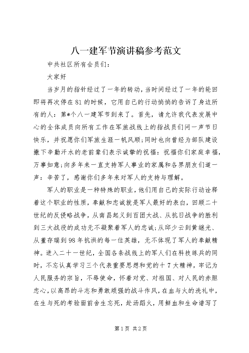 八一建军节演讲稿参考范文中共社区所有会员们:大家好当岁月的指针经过了一年的转动当时间经过了一年的轮回即将再次停在81的时候它用自己的行动悄悄的告诉了身边所有的人:第*个八一建军节到来了。首先请允许我代表发展中心的全体成员向所有工作在军旅战线上的指战员们问一声节日快乐并祝愿你们军旅生涯一帆风顺;同时也向曾经为部队建设撒下辛勤汗水的老前辈们表示诚挚的祝福:祝福你们家庭幸福万事如意;向多年来一直支持军人事业的家属和各界朋友们道一声:辛苦了感谢你们多年来对军人的支持与理解