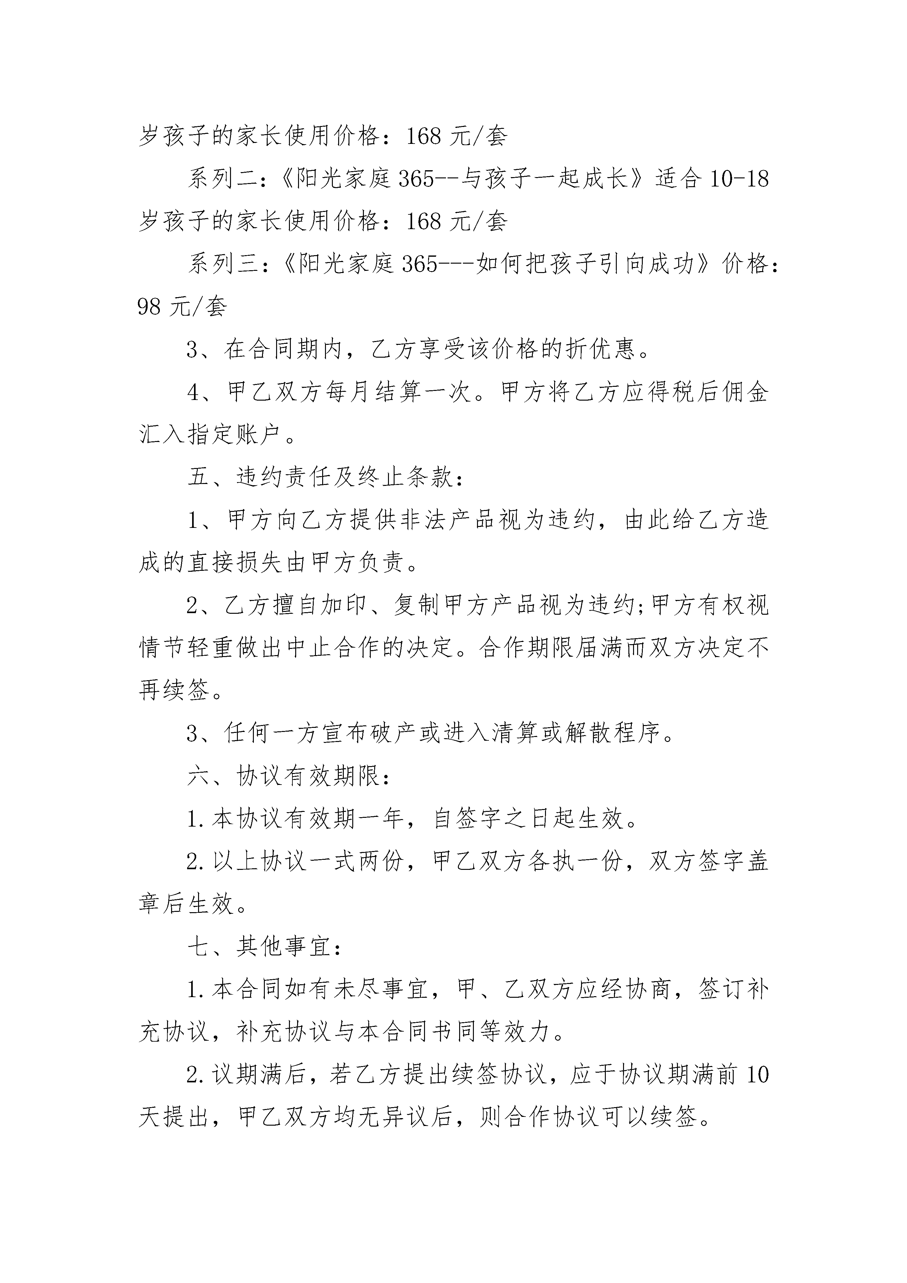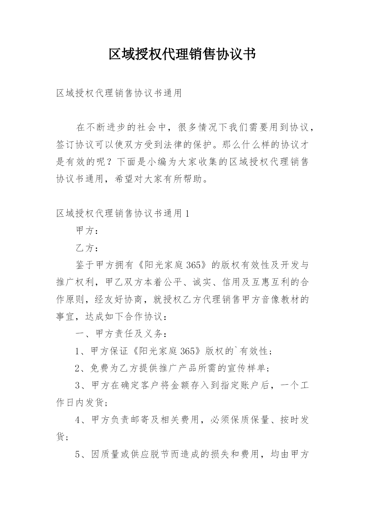 区域授权代理销售协议书区域授权代理销售协议书通用在不断进步的社会中,很多情况下我们需要用到协议,签订协议可以使双方受到法律的保护。那么什么样的协议才是有效的呢?下面是小编为大家收集的区域授权代理销售协议书通用,希望对大家有所帮助。区域授权代理销售协议书通用1甲方:乙方:鉴于甲方拥有《阳光家庭365》的版权有效性及开发与推广权利,甲乙双方本着公平、诚实、信用及互惠互利的合作原则,经友好协商,就授权乙方代理销售甲方音像教材的事宜,达成如下合作协议:一、甲方责任及义务:1、甲方保证《阳光家庭365》版权的`有效
