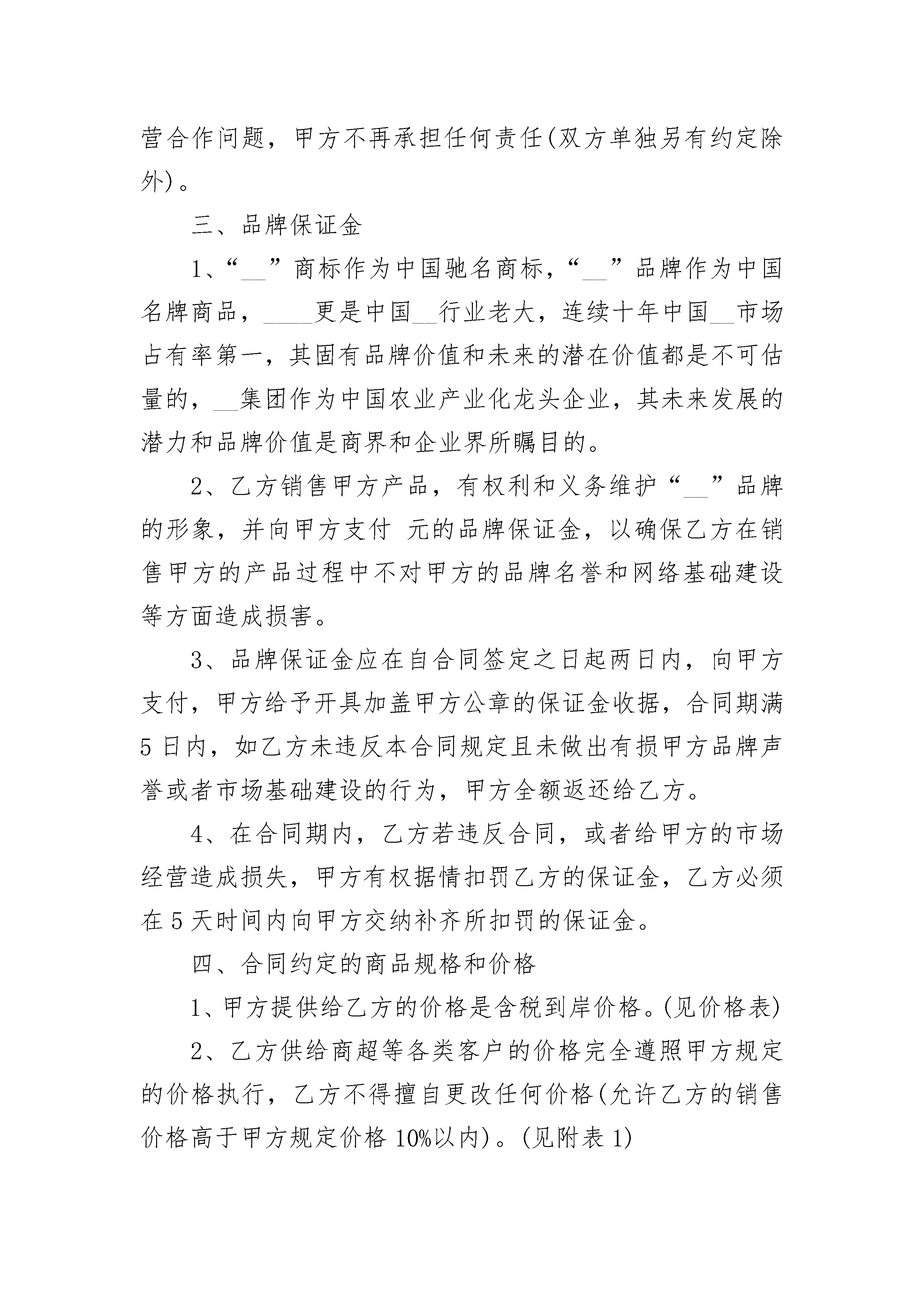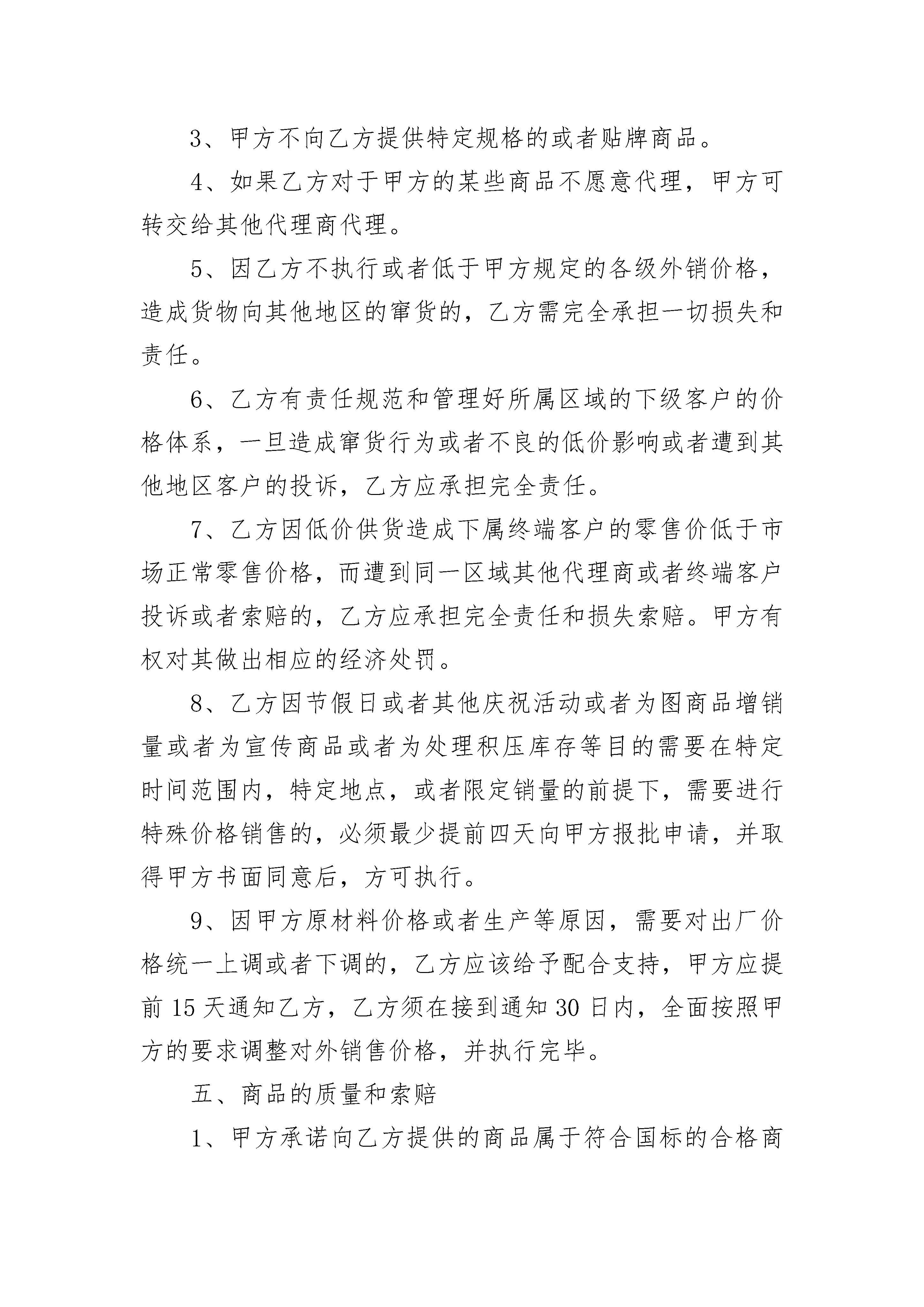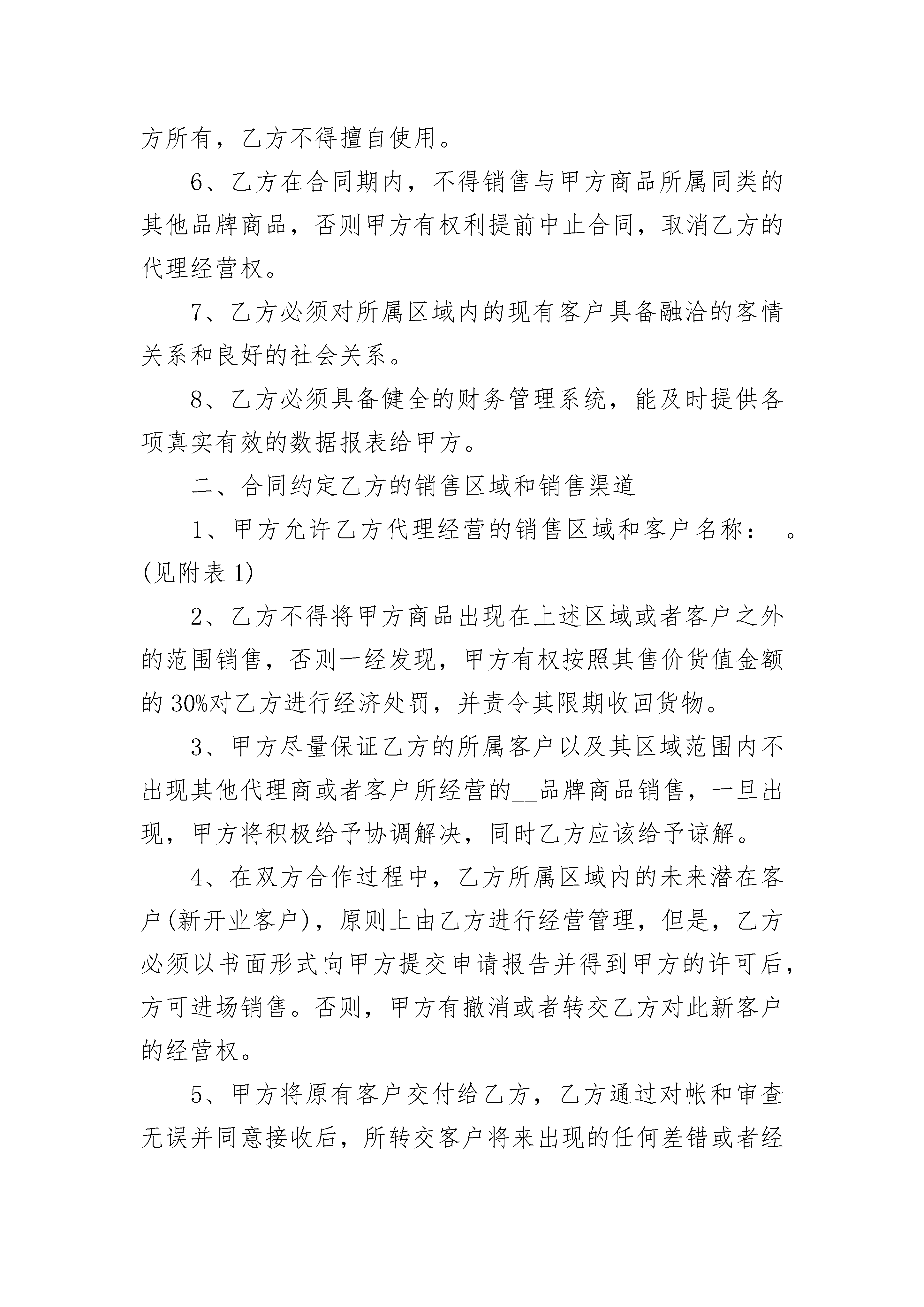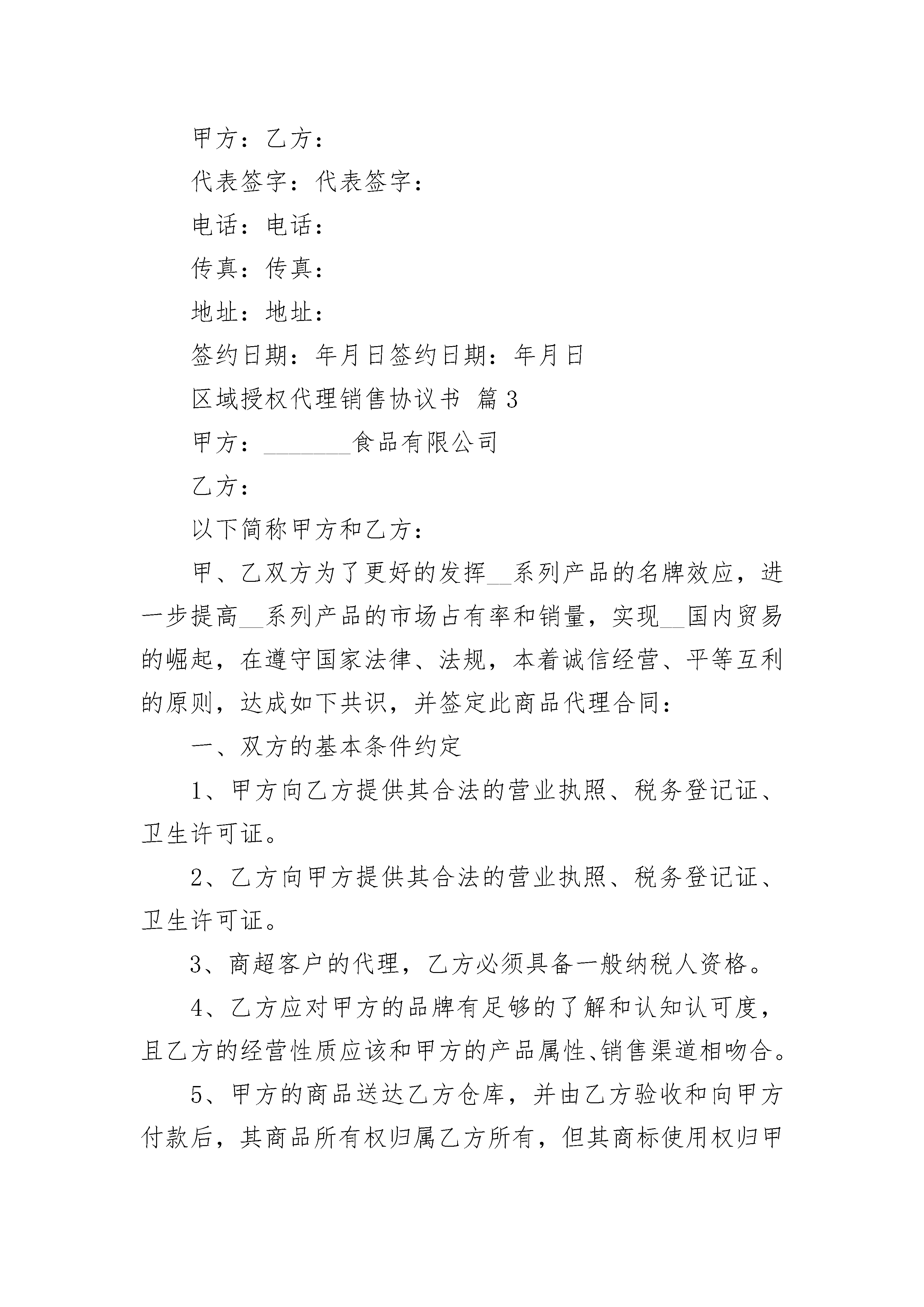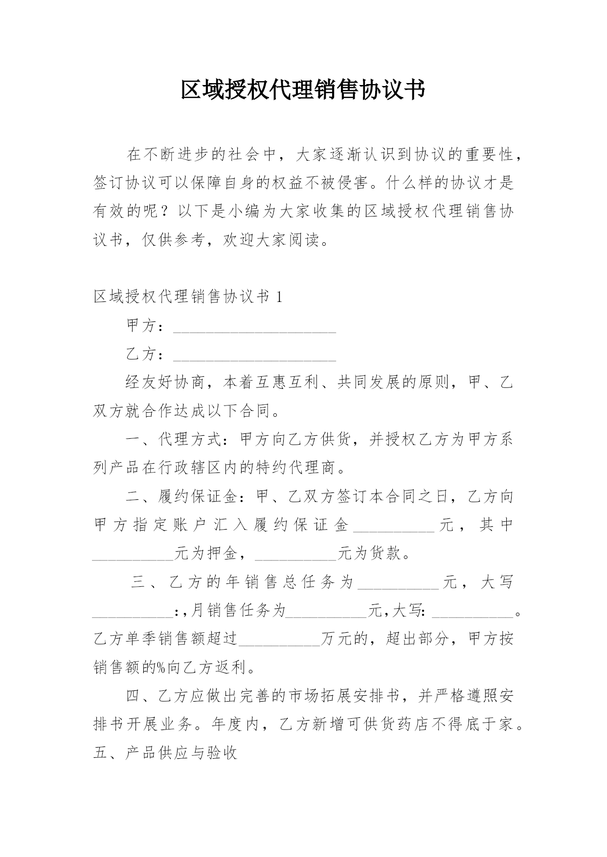 区域授权代理销售协议书在不断进步的社会中,大家逐渐认识到协议的重要性,签订协议可以保障自身的权益不被侵害。什么样的协议才是有效的呢?以下是小编为大家收集的区域授权代理销售协议书,仅供参考,欢迎大家阅读。区域授权代理销售协议书1甲方:____________________乙方:____________________经友好协商,本着互惠互利、共同发展的原则,甲、乙双方就合作达成以下合同。一、代理方式:甲方向乙方供货,并授权乙方为甲方系列产品在行政辖区内的特约代理商。二、履约保证金:甲、乙双方签订本合同之日