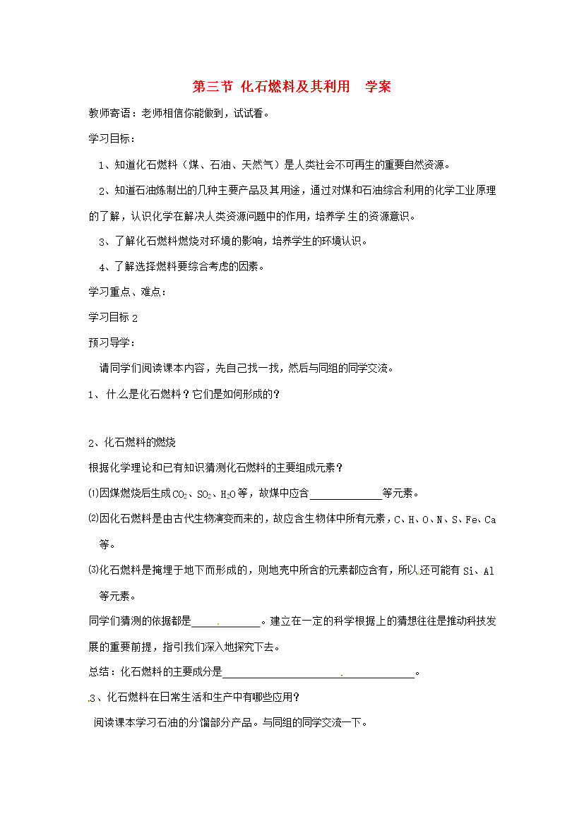 第三节化石燃料及其利用学案教师寄语:老师相信你能做到试试看。学习目标:1、知道化石燃料(煤、石油、天然气)是人类社会不可再生的重要自然资源。2、知道石油炼制出的几种主要产品及其用途通过对煤和石油综合利用的化学工业原理的了解认识化学在解决人类资源问题中的作用培养学生的资源意识。3、了解化石燃料燃烧对环境的影响培养学生的环境认识。4、了解选择燃料要综合考虑的因素。学习重点、难点:学习目标2预习导学:请同学们阅读课本内容先自己找一找然后与同组的同学交流。什么是化石燃料?它们是如何形成的?2、化石燃料的