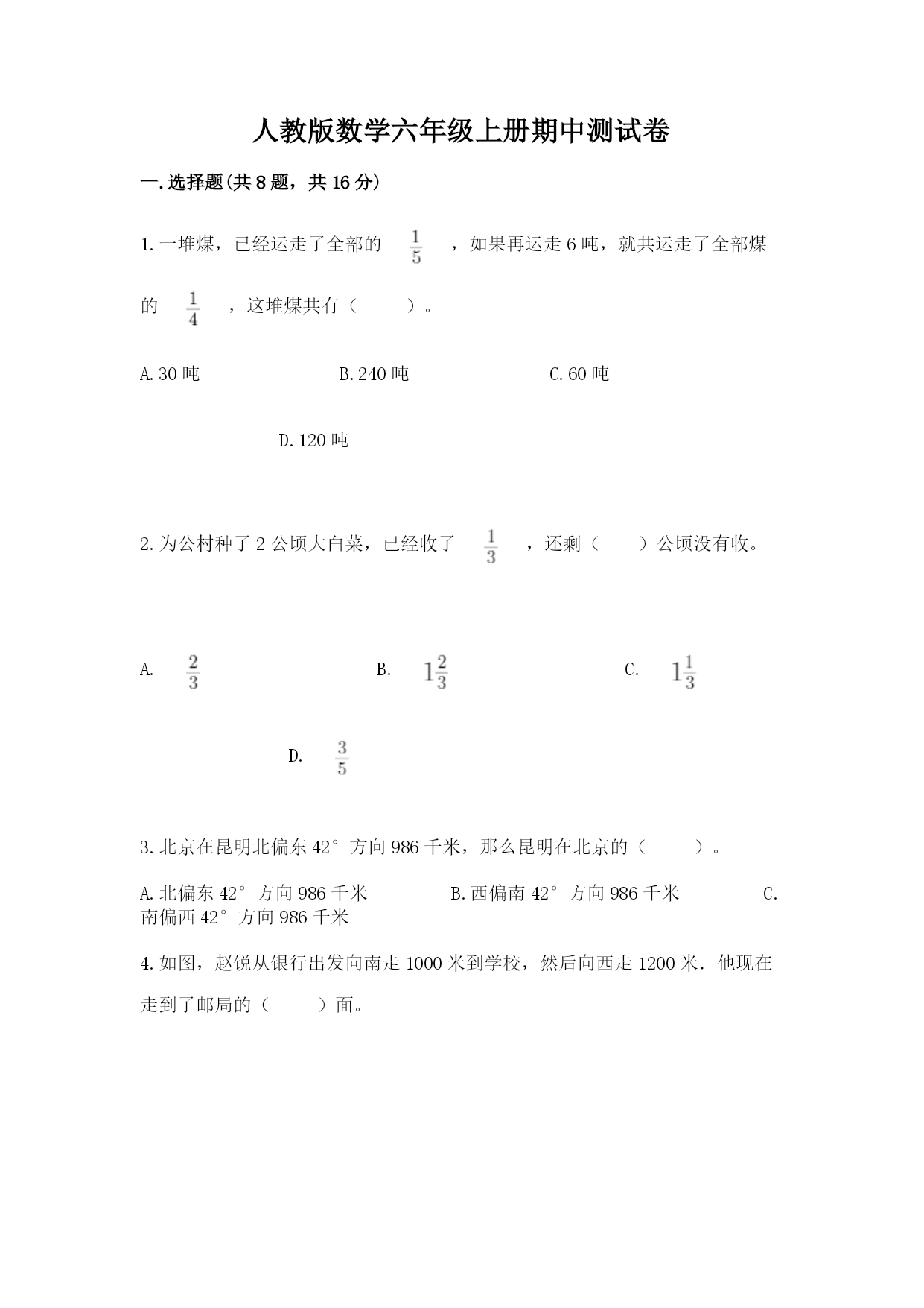 人教版数学六年级上册期中测试卷一.选择题(共8题,共16分)1.一堆煤,已经运走了全部的,如果再运走6吨,就共运走了全部煤的,这堆煤共有()。A.30吨B.240吨C.60吨D.120吨2.为公村种了2公顷大白菜,已经收了,还剩()公顷没有收。A.B.C.D.3.北京在昆明北偏东42°方向986千米,那么昆明在北京的()。A.北偏东42°方向986千米B.西偏南42°方向986千米C.南偏西42°方向986千米4.如图,赵锐从银行出发向南走1000米到学校,然后向西走1200米.他现在走到了邮局的()面。