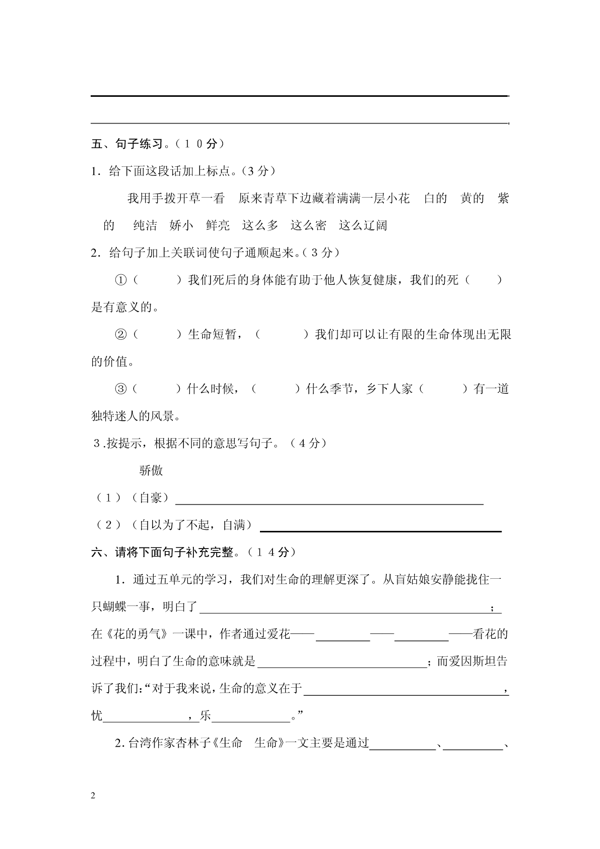 四年级5-6单元语文单元检测时间:100分钟班级姓名等级一、看拼音,写词语。(4分)ēfixiánɡïzhuzhuànɡāozàtāáfnhuâyàmo()()()()zhuānɡshìãhxiãîuzhâyānɡātioìdkuî()()()()二、请用“\”划去带点字中不正确的读音。(4分)1、安静的手指悄.(qiāoqiǎo)然合拢,竟然拢住了那只蝴蝶,真是一个奇迹!2、此刻安静的心上,一定划过一条美丽的弧.(húfú)线。3、在这个清香袅袅.(niǎoliǎo)的早晨,安静告诉我这样的道理。4、才