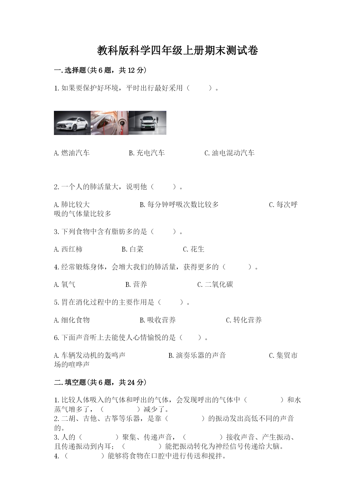 教科版科学四年级上册期末测试卷一.选择题(共6题,共12分)1.如果要保护好环境,平时出行最好采用()。A.燃油汽车B.充电汽车C.油电混动汽车2.一个人的肺活量大,说明他()。A.肺比较大B.每分钟呼吸次数比较多C.每次呼吸的气体量比较多3.下列食物中含有脂肪多的是()。A.西红柿B.白菜C.花生4.经常锻炼身体,会增大我们的肺活量,获得更多的()。A.氧气B.营养C.二氧化碳5.胃在消化过程中的主要作用是()。A.细化食物B.吸收营养C.转化营养6.下面声音听上去能使人心情愉悦的是()。A.车辆发动机