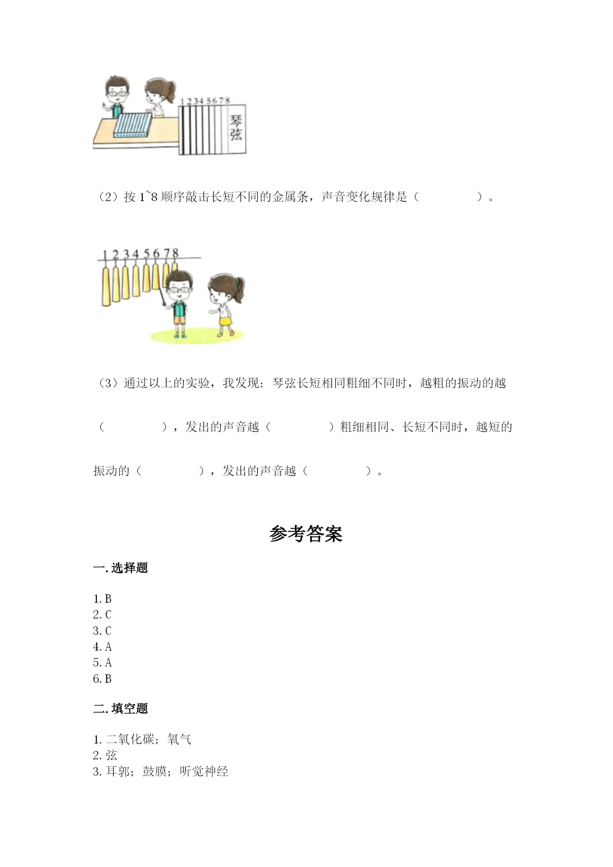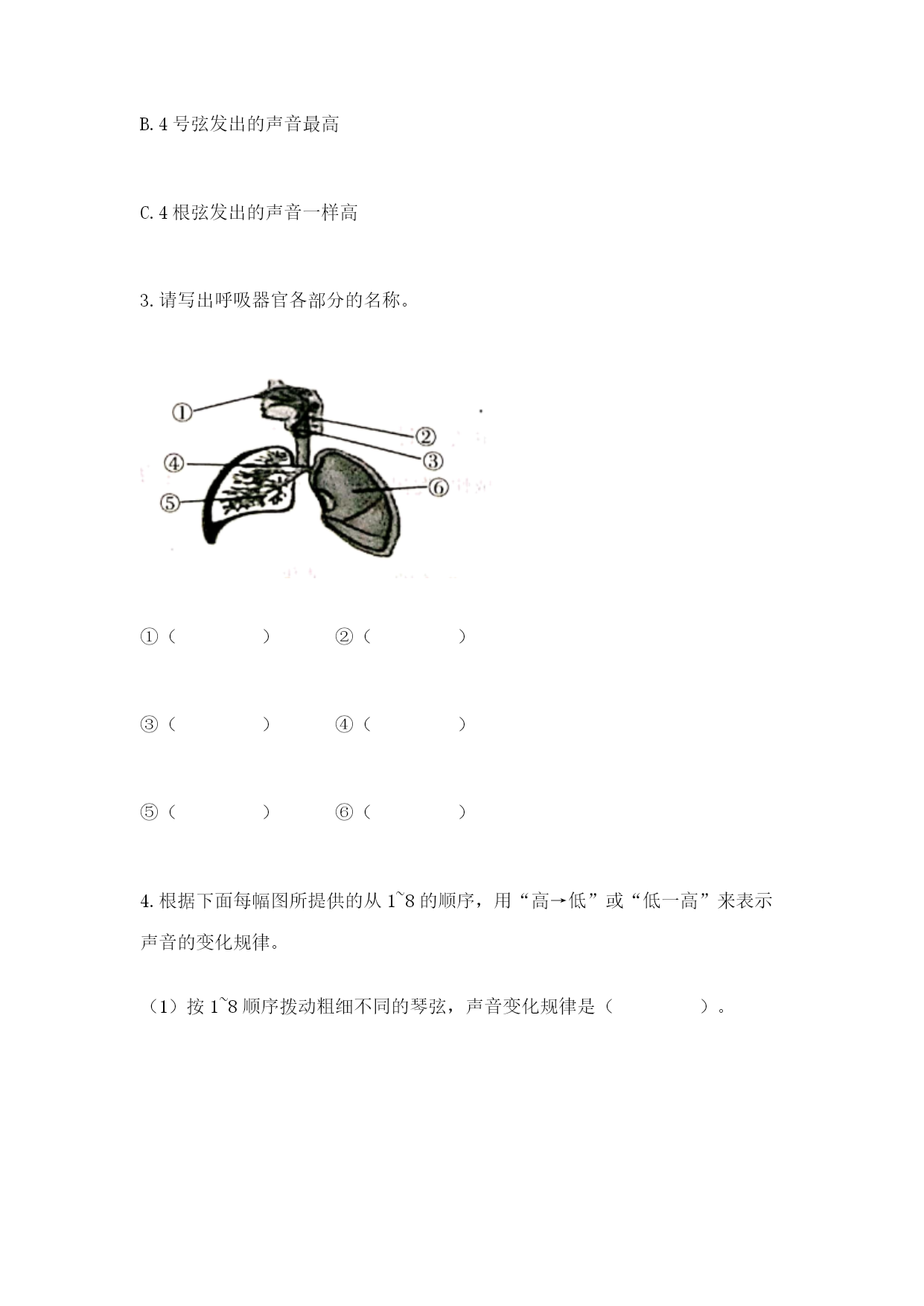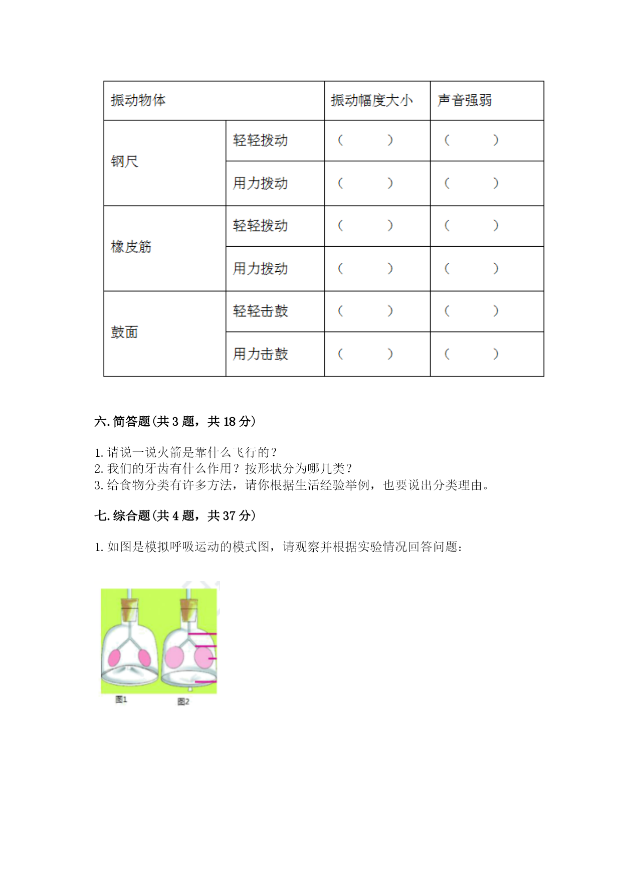教科版科学四年级上册期末测试卷一.选择题(共6题,共12分)1.你认为以下运动项目中,对提高肺活量最有效的项目是()。A.体操B.跳高C.游泳2.在《风桥夜泊》中有这样的诗句:“姑苏城外寒山寺,夜半钟声到客船。”钟声是通过()传播到船舱内诗人的耳中的。A.传声B.导电C.通风3.从实验可知,呼气和吸气过程中,发生气体交换的主要器官是()。A.气管B.肺C.膈肌4.骑车上坡的时候很费力,下坡的时候不用蹬车,可以滑行下来。坡度越大,我们滑行的距离越()。A.近B.远C.无法判断5.一呼一吸算呼吸()。A.一次