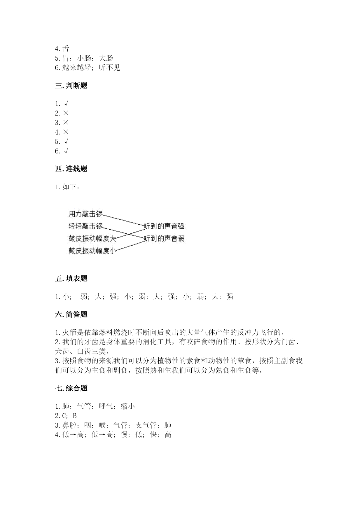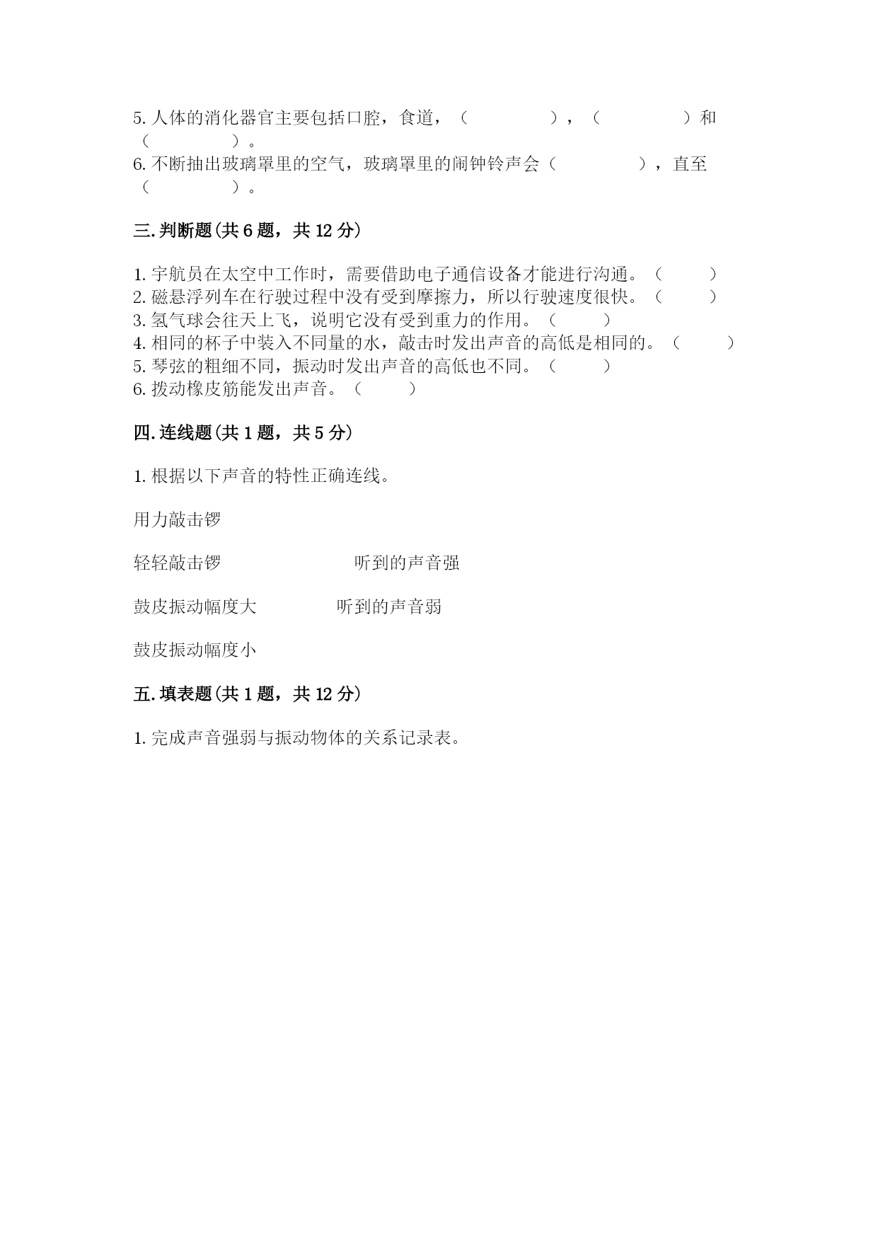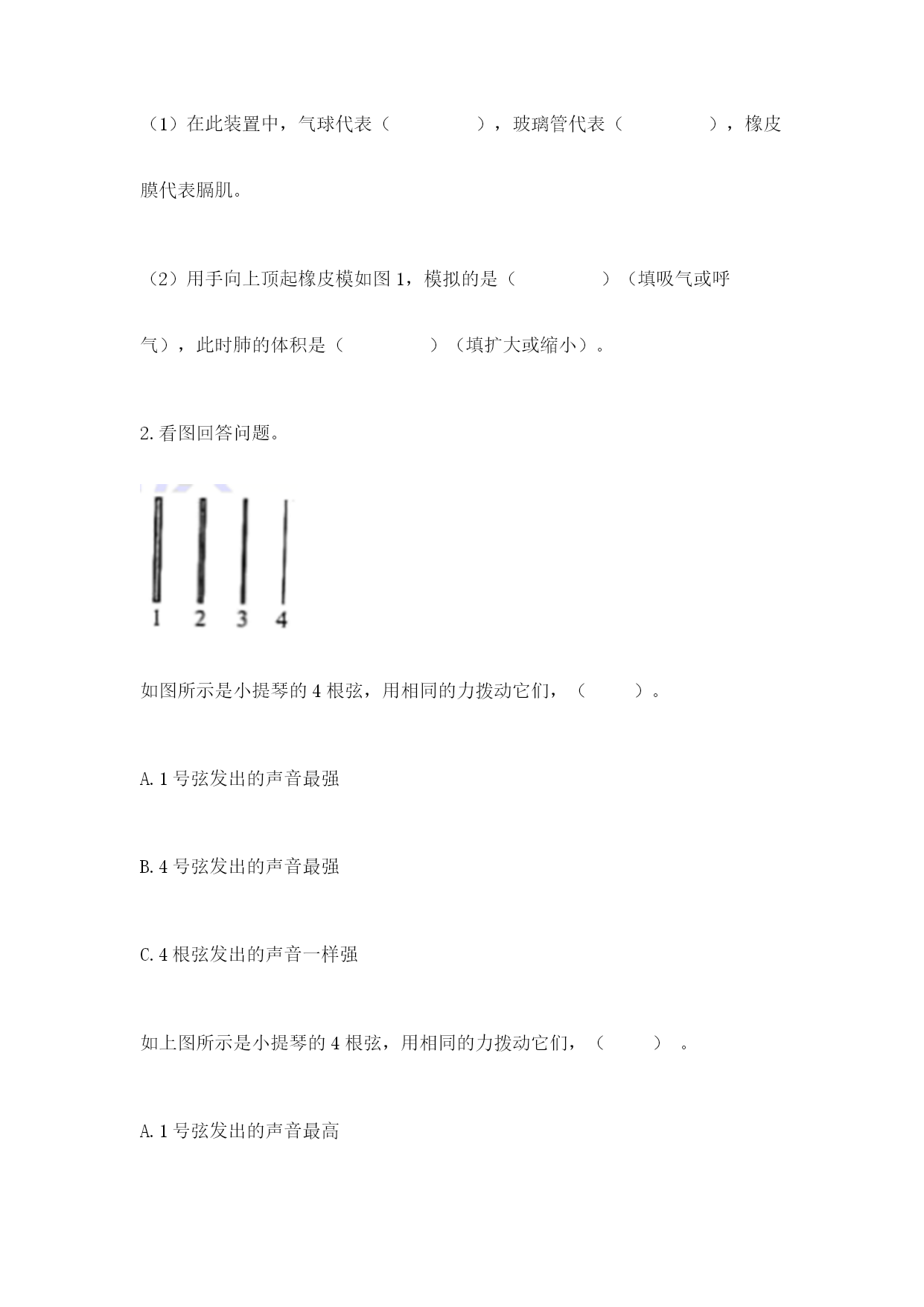 教科版科学四年级上册期末测试卷一.选择题(共6题,共12分)1.你认为以下运动项目中,对提高肺活量最有效的项目是()。A.体操B.跳高C.游泳2.在《风桥夜泊》中有这样的诗句:“姑苏城外寒山寺,夜半钟声到客船。”钟声是通过()传播到船舱内诗人的耳中的。A.传声B.导电C.通风3.从实验可知,呼气和吸气过程中,发生气体交换的主要器官是()。A.气管B.肺C.膈肌4.骑车上坡的时候很费力,下坡的时候不用蹬车,可以滑行下来。坡度越大,我们滑行的距离越()。A.近B.远C.无法判断5.一呼一吸算呼吸()。A.一次