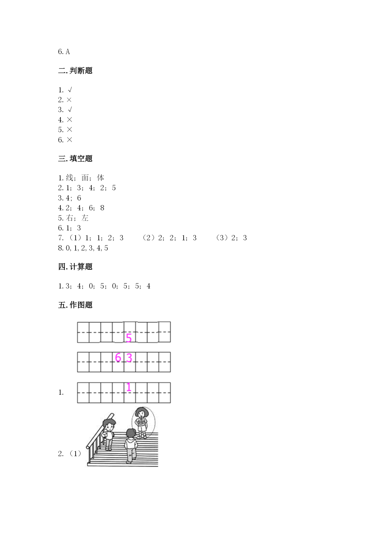 一年级上册数学期中测试卷一.选择题(共6题,共12分)1.()可以立起来,还可以滚动。A.B.C.2.光头强的家在第()层。A.4B.7C.93.少的是()。A.B.4.下图的物体中,为正方体图形是()。A.B.C.D.5.()条线最长。A.B.C.6.哪幅图画中的花朵开得多?()A.B.C.二.判断题(共6题,共12分)1.长方体就是正方体。()2.4只鸭子,游走了1只,还剩下3只。()3.苹果比梨多,梨就比苹果少。()4.羽毛球是球体。()5.比5大1的数是4,比5小1的数是6。()6.下面这些图形都