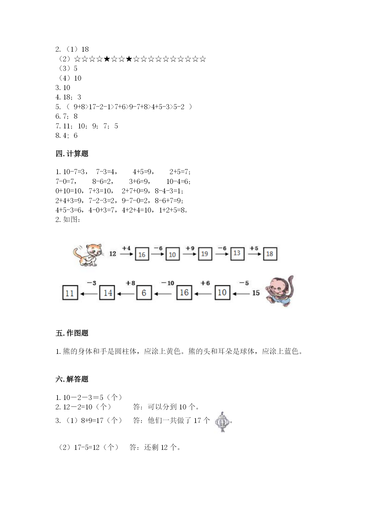 小学数学一年级上册期末测试卷一.选择题(共6题,共12分)1.妈妈钱包里的钱花出去的和剩下的同样多,花出去的是9元,妈妈原来有()。A.9元钱B.10元钱C.17元钱D.18元钱2.最大的是()。①②③A.①B.②C.③3.放学回家时的队伍中,从前往后数,小林排第9个,从后往前数,小林排第4个,这支队伍一共有()个人。A.13B.12C.114.15大比19小的数有()。A.16B.14C.15,16D.16,17,185.大象在猴子的()边。A.左B.右C.下6.下面图中,有()个长方体。A.1B.2C