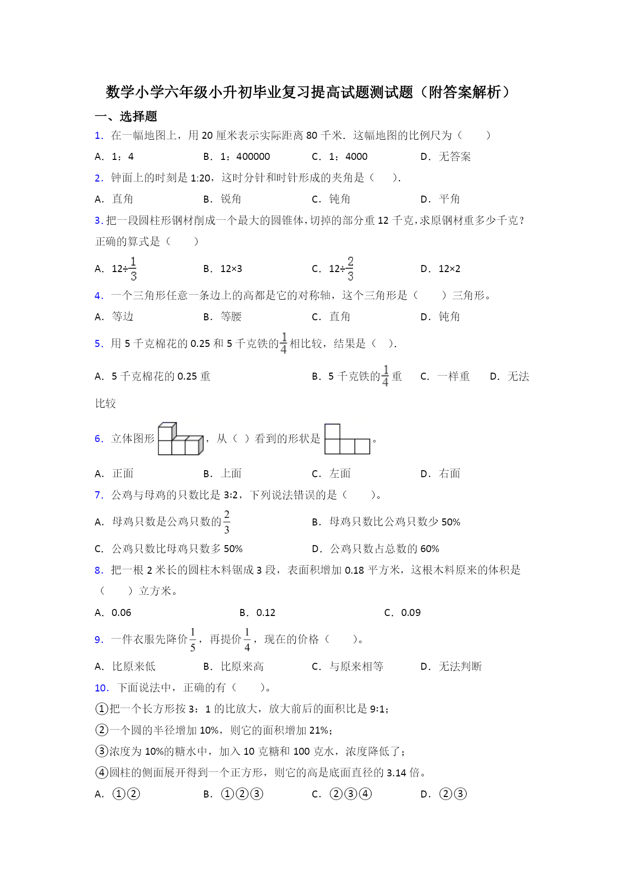数学小学六年级小升初毕业复习提高试题测试题(附答案解析)一、选择题1.在一幅地图上,用20厘米表示实际距离80千米.这幅地图的比例尺为()A.1:4B.1:400000C.1:4000D.无答案2.钟面上的时刻是1:20,这时分针和时针形成的夹角是().A.直角B.锐角C.钝角D.平角3.把一段圆柱形钢材削成一个最大的圆锥体,切掉的部分重12千克,求原钢材重多少千克?正确的算式是()A.12÷B.12×3C.12÷D.12×24.一个三角形任意一条边上的高都是它的对称轴,这个三角形是()三角形。A.等边B