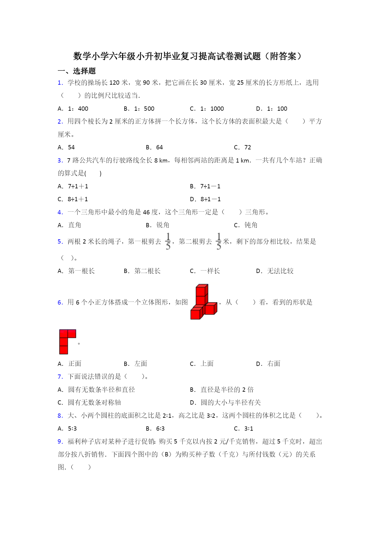 数学小学六年级小升初毕业复习提高试卷测试题(附答案)一、选择题1.学校的操场长120米,宽90米,把它画在长30厘米,宽25厘米的长方形纸上,选用()的比例尺比较适当.A.1:400B.1:500C.1:1000D.1:1002.用四个棱长为2厘米的正方体拼一个长方体,这个长方体的表面积最大是()平方厘米。A.54B.64C.723.7路公共汽车的行驶路线全长8km,每相邻两站的距离是1km.一共有几个车站?正确的算式是()A.7÷1+1B.7÷1-1C.8÷1+1D.8÷1-14.一个三角形中最小的角是