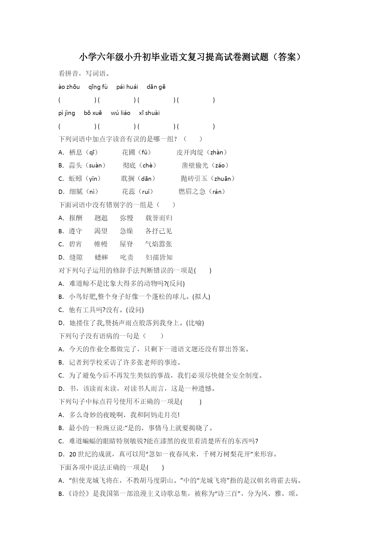 小学六年级小升初毕业语文复习提高试卷测试题(答案)[001].doc