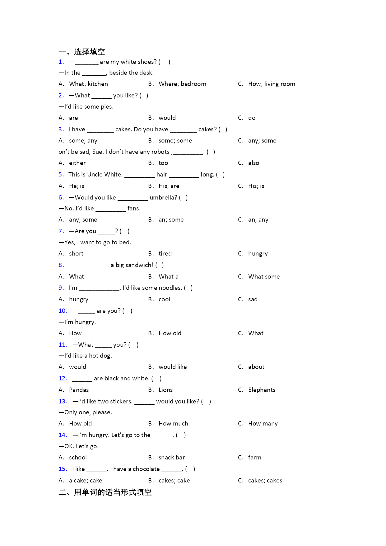 一、选择填空1.—_______aremywhiteshoes?()—Inthe_______,besidethedesk.A.What;kitchenB.Where;bedroomC.How;livingroom2.—What______youlike?()—I’dlikesomepies.A.areB.wouldC.do3.Ihave________cakes.Doyouhave________cakes?()A.some;anyB.some;someC.any;someon’tbesad,Sue.I