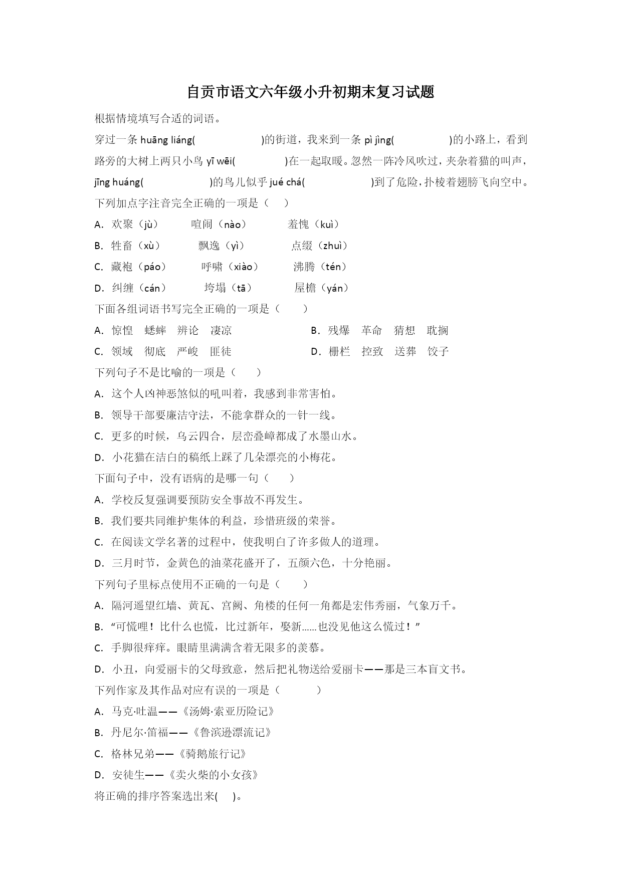 自贡市语文六年级小升初期末复习试题根据情境填写合适的词语。穿过一条huāngliáng()的街道,我来到一条pìjìng()的小路上,看到路旁的大树上两只小鸟yīwēi()在一起取暖。忽然一阵冷风吹过,夹杂着猫的叫声,jīnghuáng()的鸟儿似乎juéchá()到了危险,扑棱着翅膀飞向空中。下列加点字注音完全正确的一项是()A.欢聚(jù)喧闹(nào)羞愧(kuì)B.牲畜(xù)飘逸(yì)点缀(zhuì)C.藏袍(páo)呼啸(xiào)沸腾(tén)D.纠缠(cán)垮塌(tā)屋檐(yán)