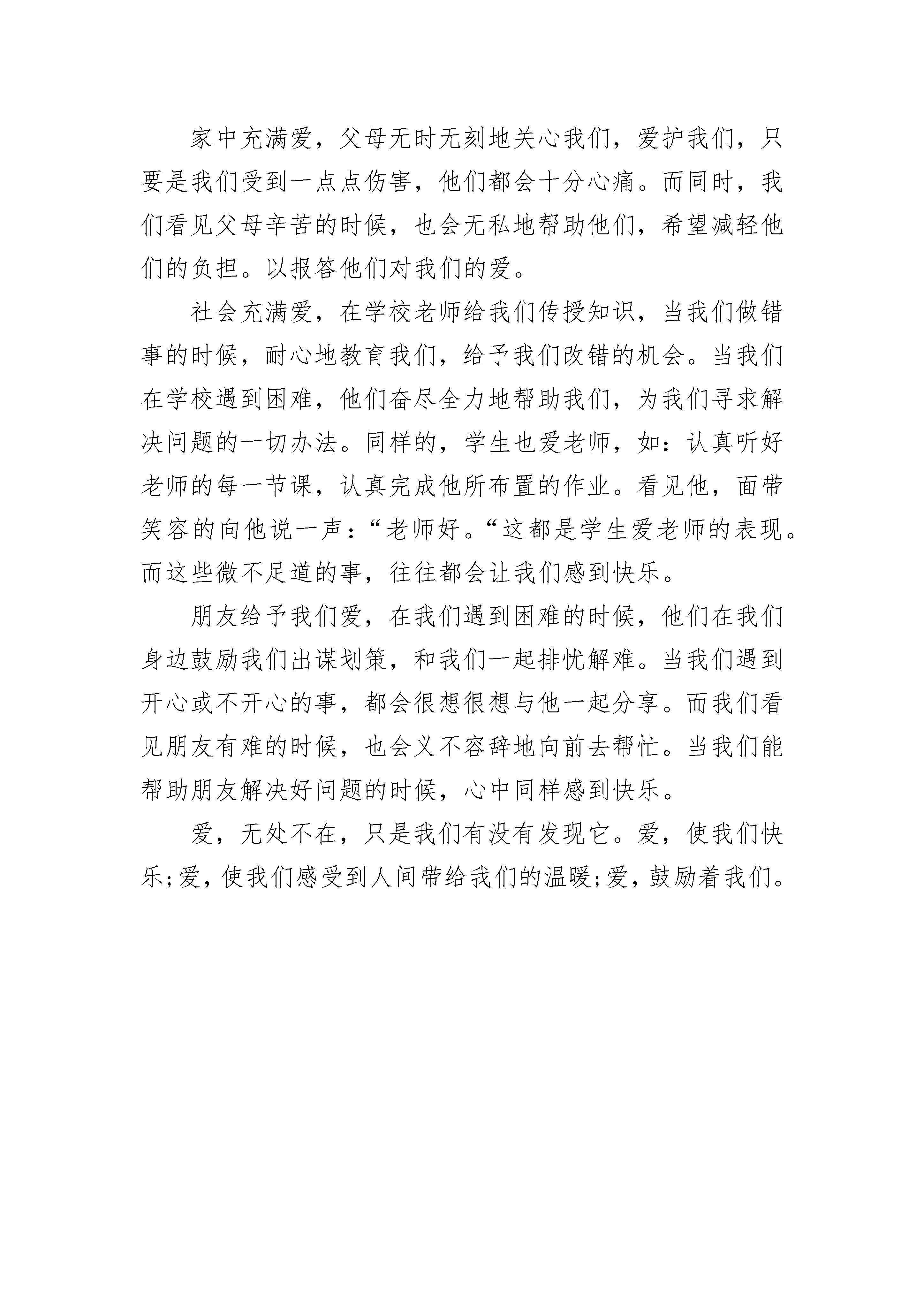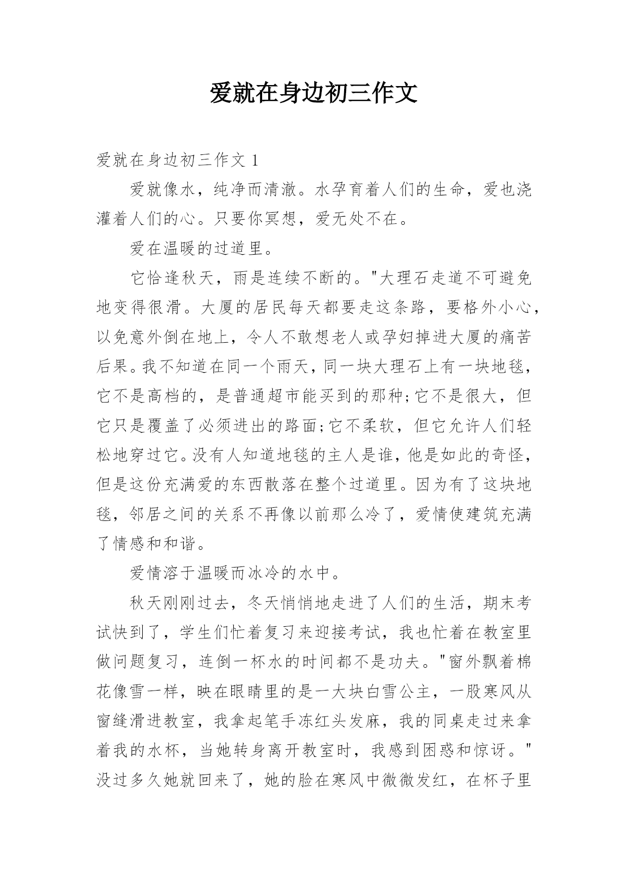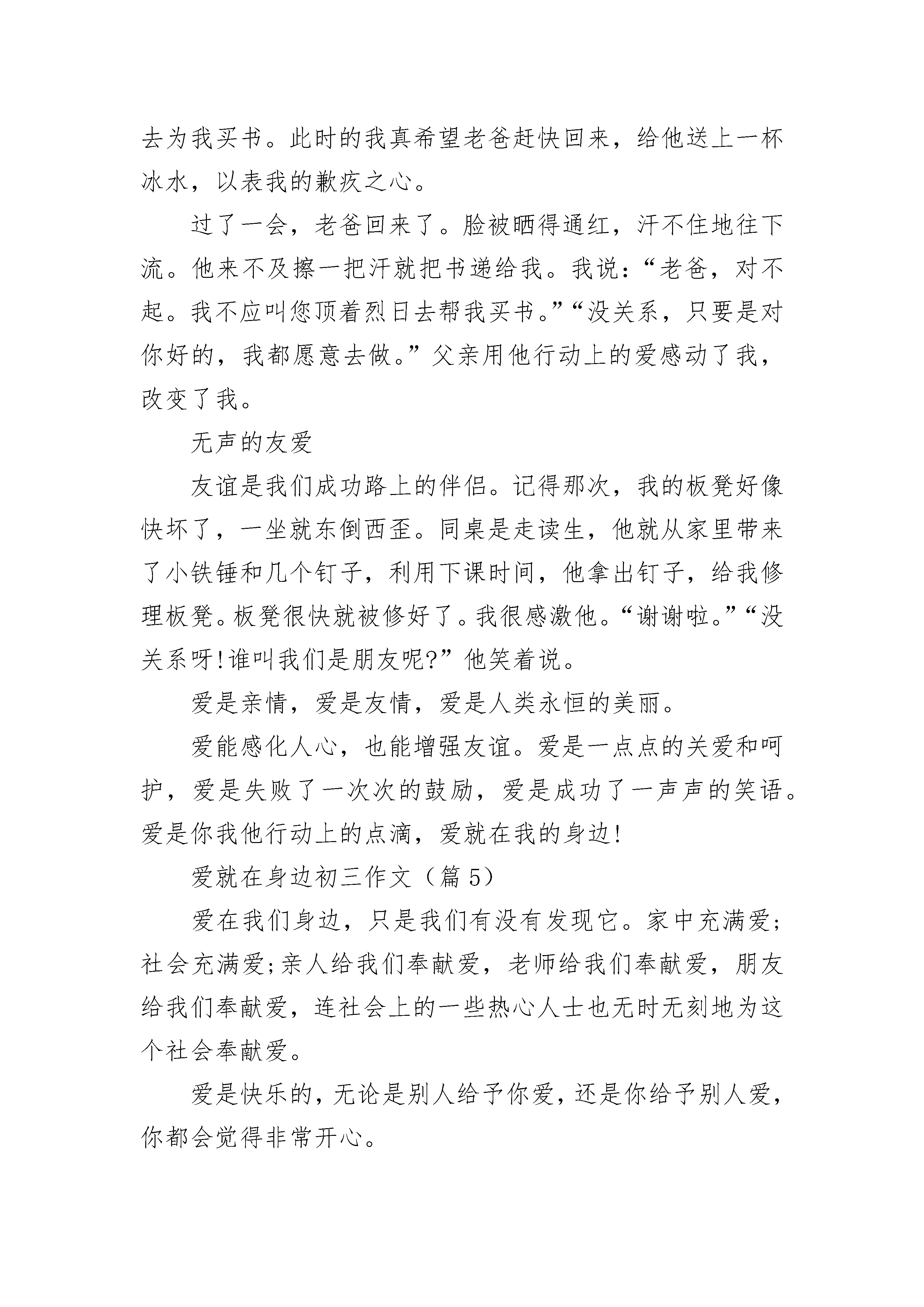 爱就在身边初三作文爱就在身边初三范文1:其实爱就在身边爱——遍布天下,世界无处不在的就是爱。同学;你发现爱了么?你感受到爱了么?如果你回答有,那你就是幸福的,因为你可以体会唉的关怀,享受到爱的温暖,领会到爱的真谛。如果你回答的是没有,那我断定你的人生是没有色彩的,是枯燥无味的,是如同嚼蜡的。因为你远离了爱。爱其实就在身边,只是你缺少一双发现爱的眼睛。一颗体会爱的心灵。爱有时只要你肯歪下头,转下身就可以发现的,同学、朋友;我发现爱了,你们呢??朋友的鼓励是爱,考试的失利,困难的面前,朋友的一声声鼓励,安慰,