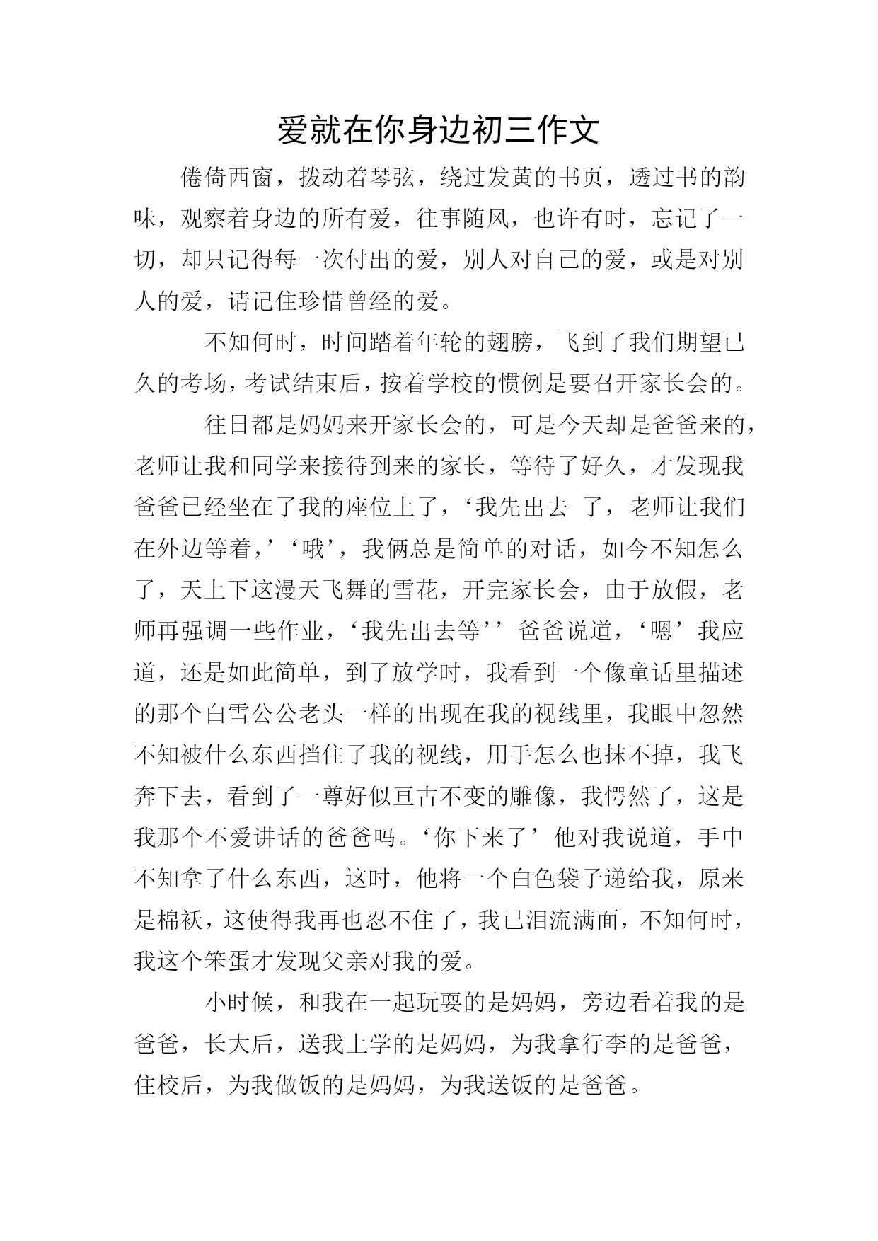 爱就在你身边初三作文倦倚西窗,拨动着琴弦,绕过发黄的书页,透过书的韵味,观察着身边的所有爱,往事随风,也许有时,忘记了一切,却只记得每一次付出的爱,别人对自己的爱,或是对别人的爱,请记住珍惜曾经的爱。不知何时,时间踏着年轮的翅膀,飞到了我们期望已久的考场,考试结束后,按着学校的惯例是要召开家长会的。往日都是妈妈来开家长会的,可是今天却是爸爸来的,老师让我和同学来接待到来的家长,等待了好久,才发现我爸爸已经坐在了我的座位上了,‘我先出去了,老师让我们在外边等着,’‘哦’,我俩总是简单的对话,如今不知怎么了,