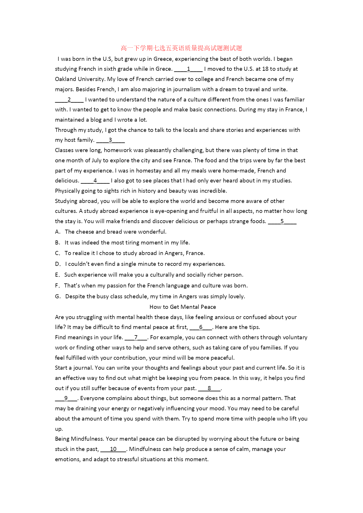高一下学期七选五英语质量提高试题测试题[001].doc