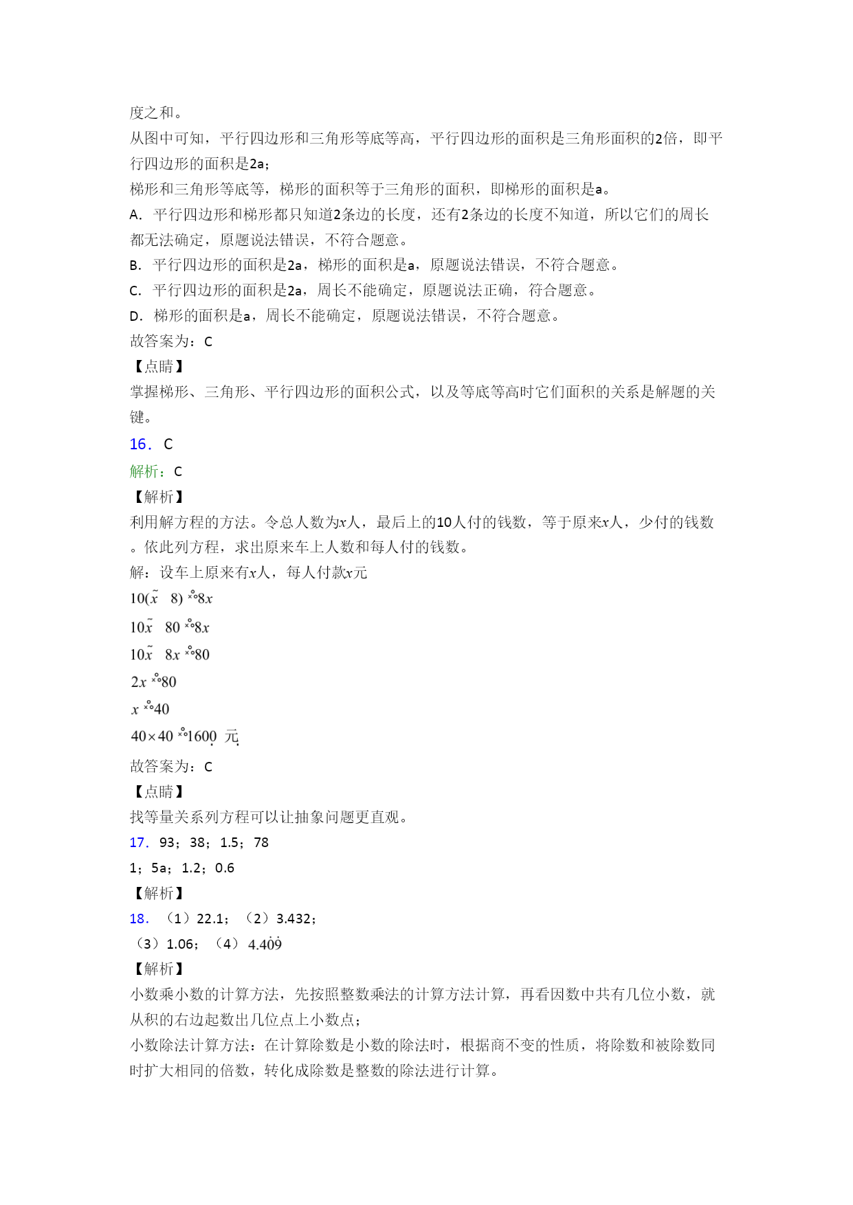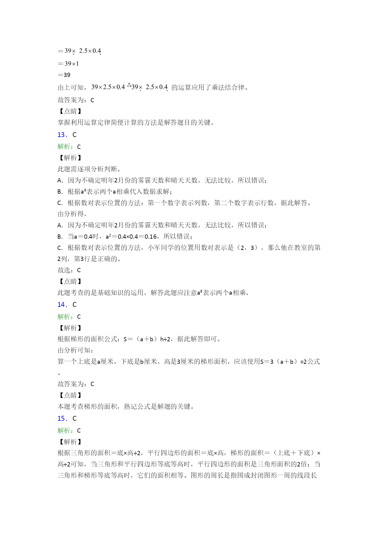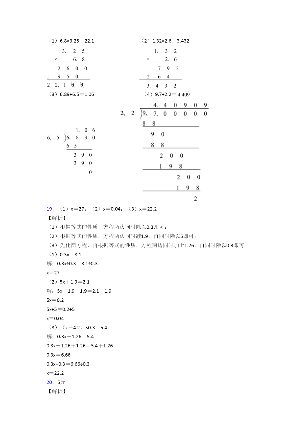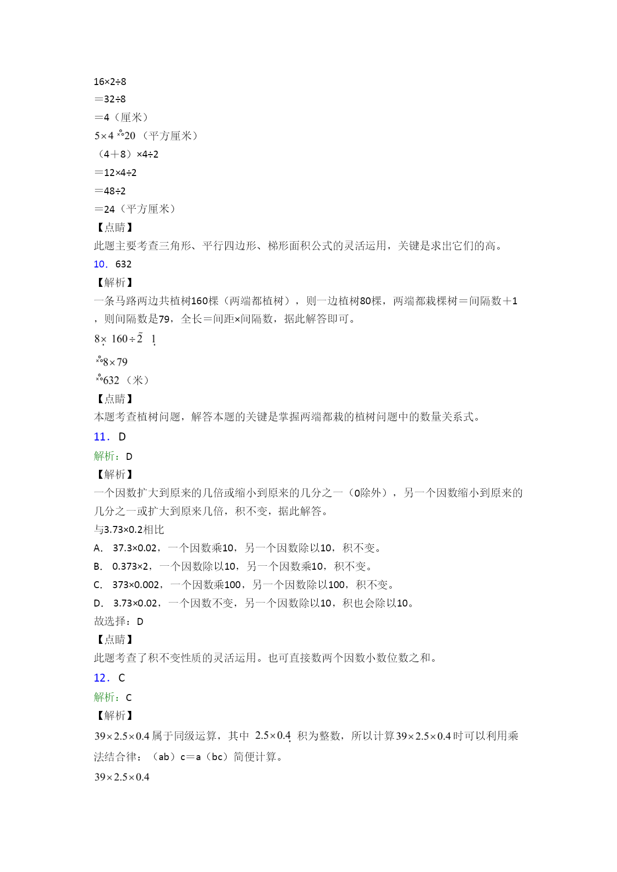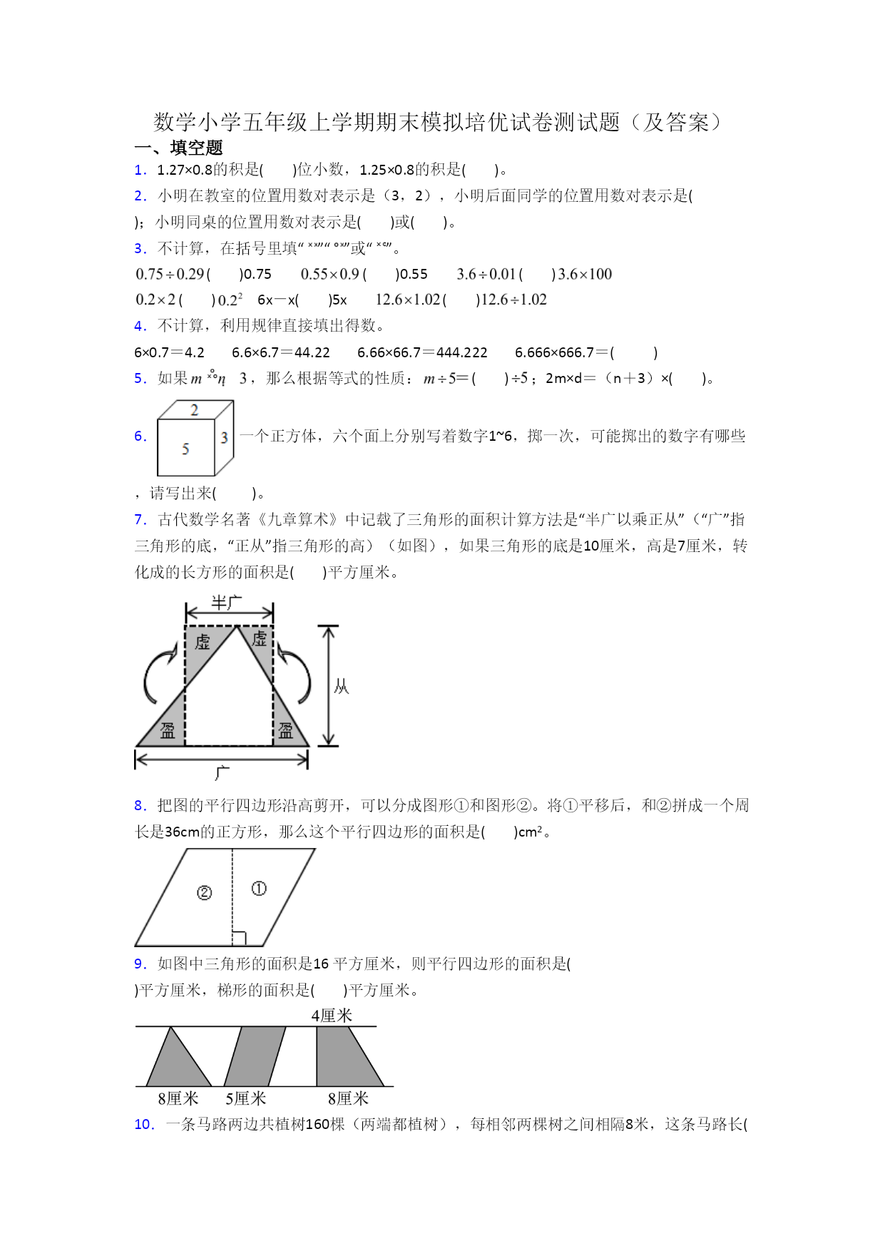 数学小学五年级上学期期末模拟培优试卷(及答案)一、填空题1.5.03×0.07的积是()位小数。2.电影票上的“7排13座”简记作(7,13),那(12,9)表示()排()座。3.根据相关研究,室内景点人均活动面积低于1平方米,室外景点人均活动面积低于0.75平方米时,就有发生踩踏事故的危险。在一个郊外戏台前,有一片上底是30米,下底是50米、高是40米的梯形室外场地,为保证安全,这片场地最多只能容纳()人同时看戏。4.先观察前面四个算式,找出规律,再填空。0.1×8+0.1=0.91.2×8+0.2=9