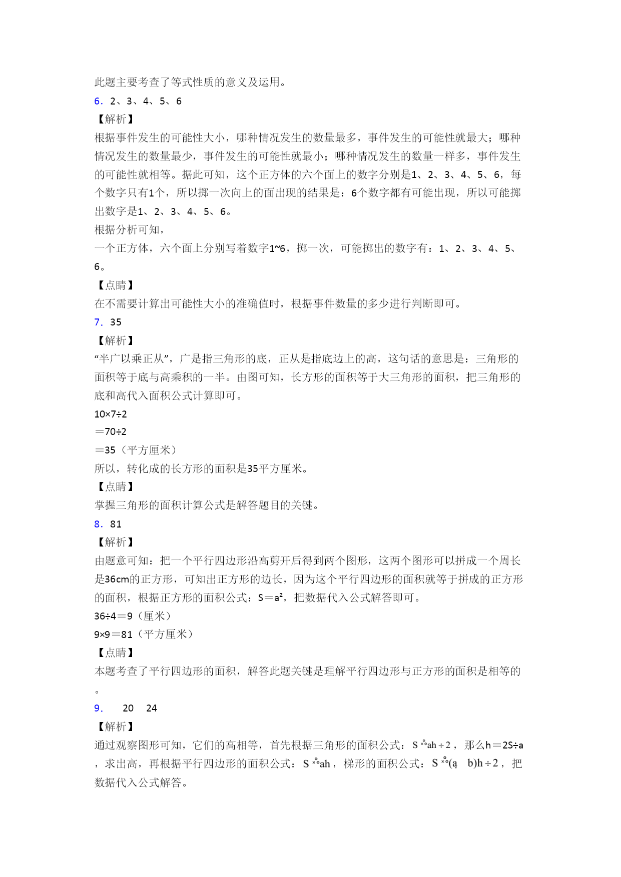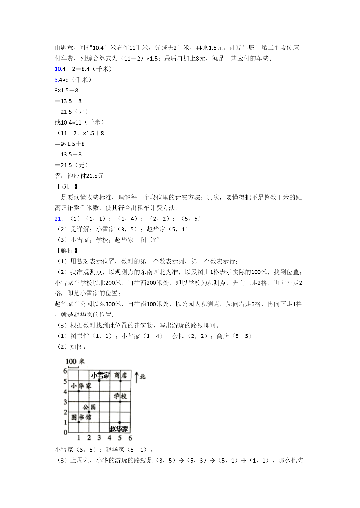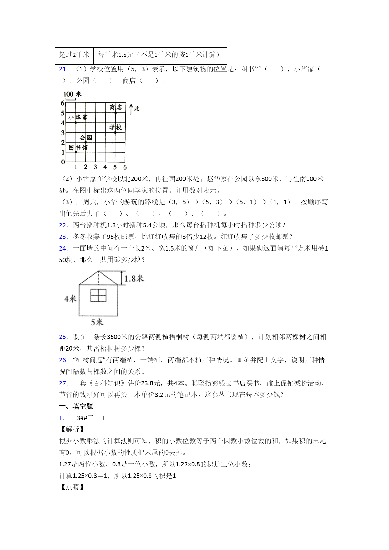小学五年级上学期期末数学模拟培优试卷测试题一、填空题1.1.23×1.3的积是()位小数。2.明明在教室的位置用数对表示为(3,5),欣欣在明明的右边,和明明是同桌,欣欣在教室的位置用数对表示为()。3.周末,妈妈带小芳去植物园玩。导航地图上显示的步行路线是6km,预计用时1.2小时。预计平均每小时步行()km,预计平均步行1km用()小时。4.根据172×33=5676,直接写出下面算式的积:17.2×33=()17.2×3.3=()17.2×0.33=()5.盲盒里有15个玻璃球,红色2个,绿色8个,