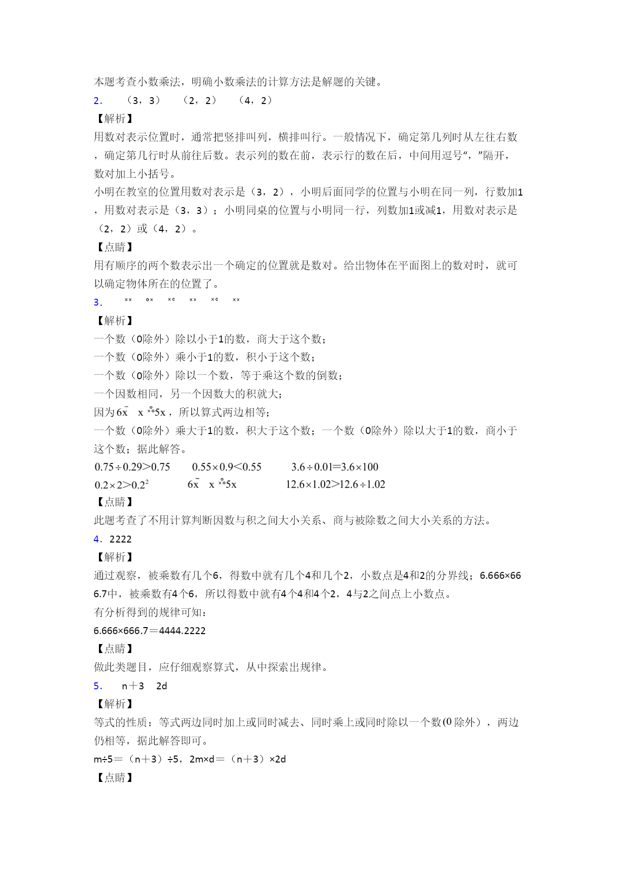 数学小学五年级上学期期末模拟培优试卷测试题(及答案)一、填空题1.1.27×0.8的积是()位小数,1.25×0.8的积是()。2.小明在教室的位置用数对表示是(3,2),小明后面同学的位置用数对表示是();小明同桌的位置用数对表示是()或()。3.不计算,在括号里填“”“”或“”。()0.75()0.55()()6x-x()5x()4.不计算,利用规律直接填出得数。6×0.7=4.26.6×6.7=44.226.66×66.7=444.2226.666×666.7=()5.如果,那么根据等式的性质:()