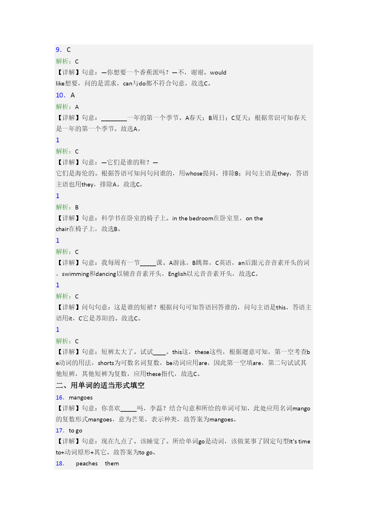 一、单项选择1.—Whose______arethese?()—They’remycousin’s.A.shortsB.shortC.dress2.Iusuallyplayfootball________four________theafternoon.()A.at;inB.at;onC.in;at3.Hi,Bobby.Let’slistentosomeEnglish.句中三个斜体单词划线部分发音与众不同的是:()A.HiB.listenC.English4.Ihavea_______lessontoda