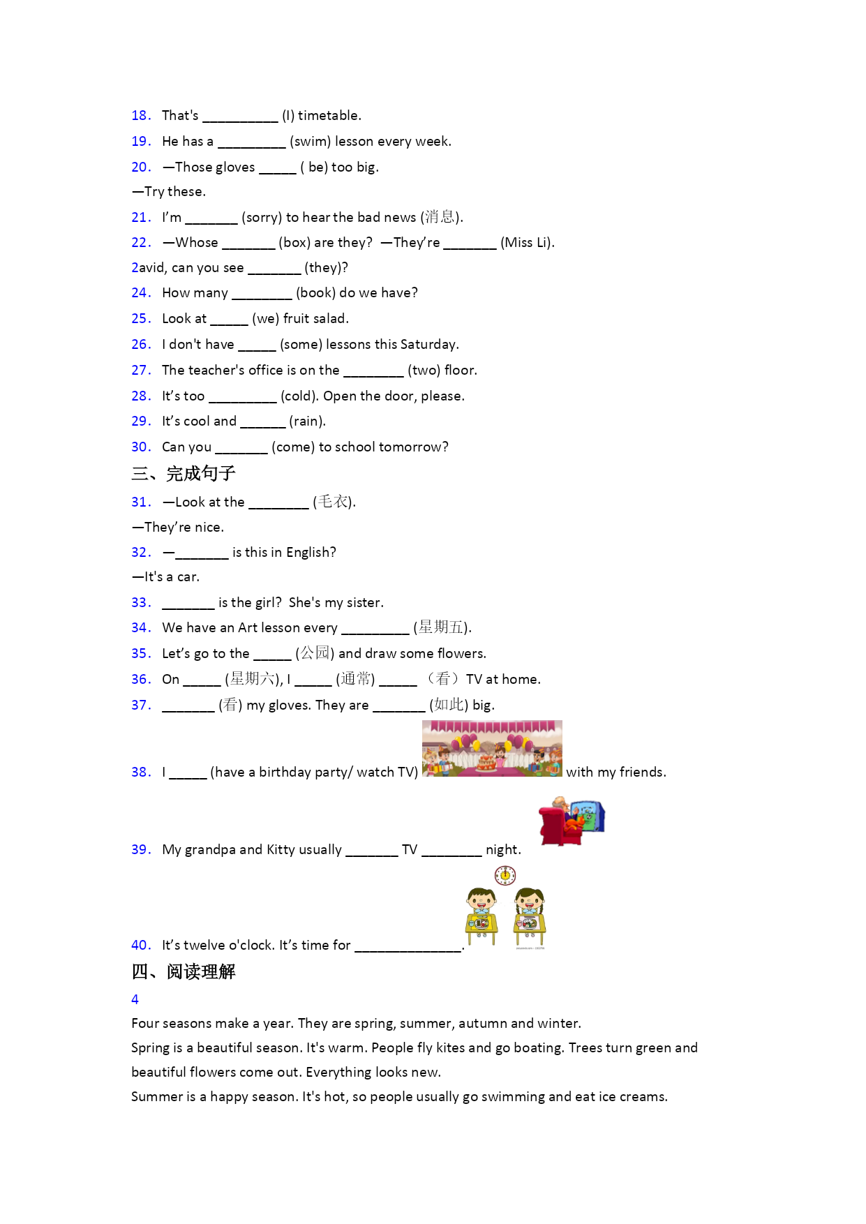 一、单项选择1.I______anewsweaterandLiuTao_______anewcoat.()A.have;haveB.has;haveC.have;has2.That________ashirtandthese________shorts.()A.is;isB.are;isC.is;are3.Iusuallygetup_______seven_______Sundaymorning.()A.at;inB.at;onC.in;in4.—_______crayonsarethese?()—The