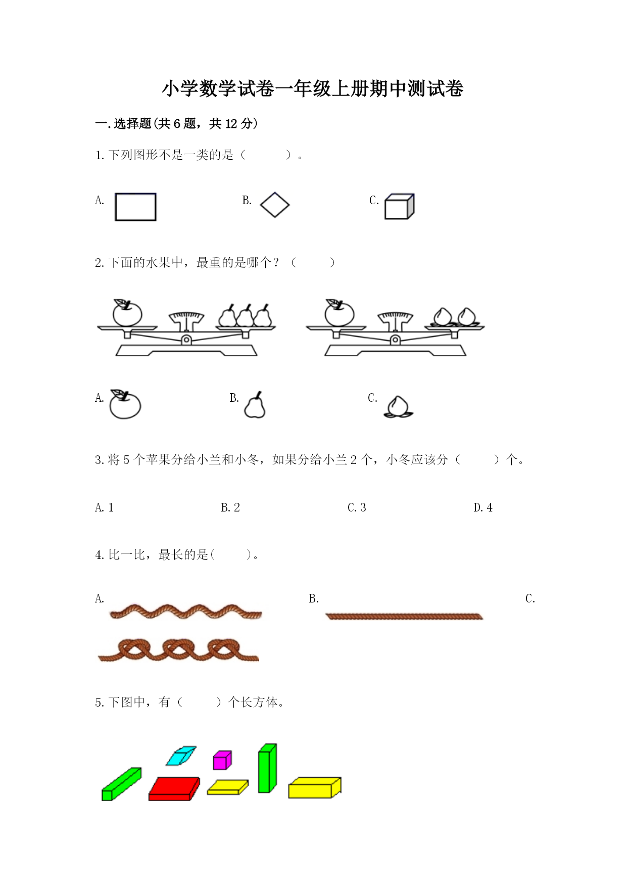 小学数学试卷一年级上册期中测试卷一.选择题(共6题,共12分)1.下列图形不是一类的是()。A.B.C.2.下面的水果中,最重的是哪个?()A.B.C.3.将5个苹果分给小兰和小冬,如果分给小兰2个,小冬应该分()个。A.1B.2C.3D.44.比一比,最长的是()。A.B.C.5.下图中,有()个长方体。A.7B.6C.5D.46.看图选数。()A.1B.2C.3二.判断题(共6题,共12分)1.比多2个。()2.下图可列式为5-4=1。()3.苹果比梨多,梨就比苹果少。()4.下面的物体都是长方体。(