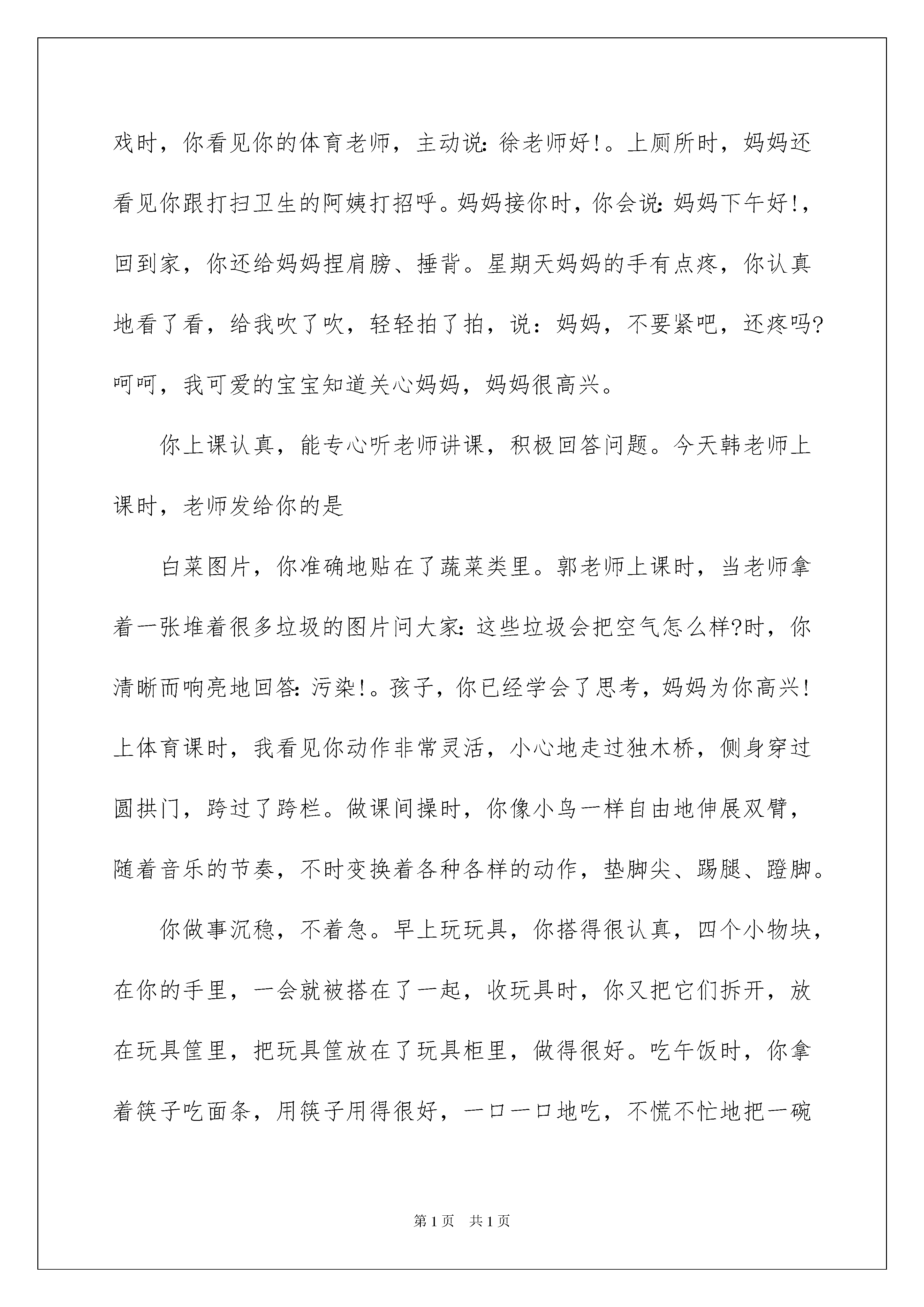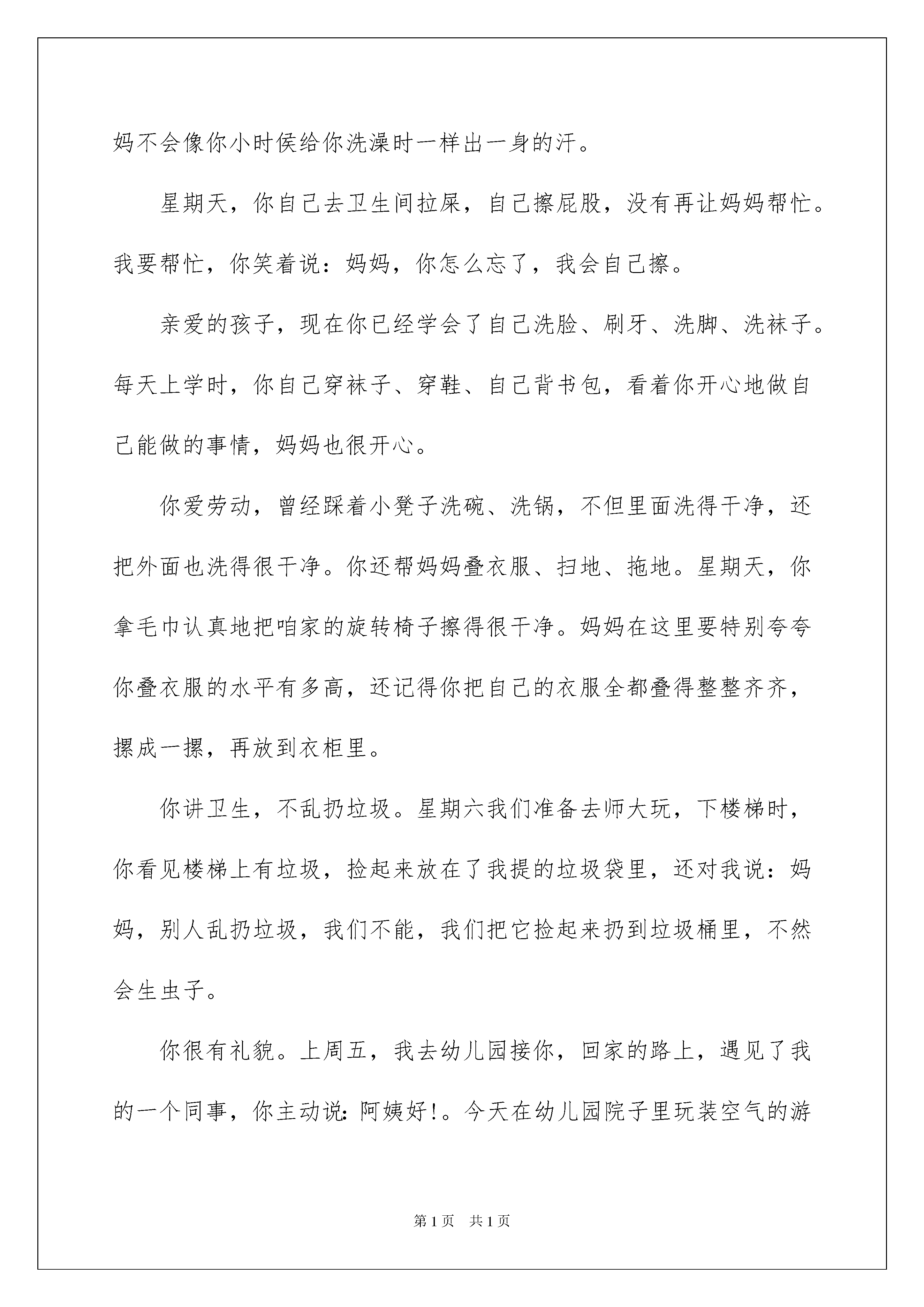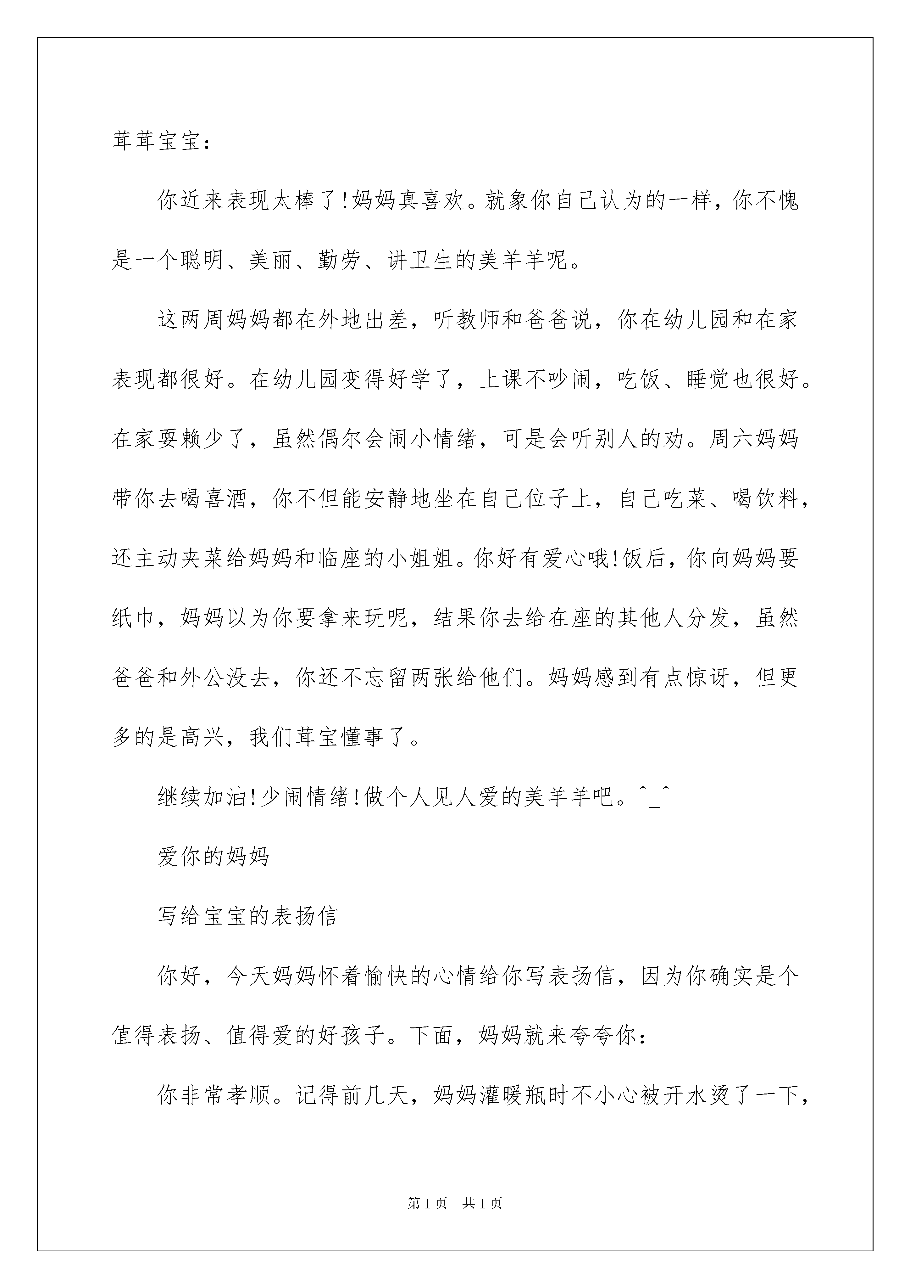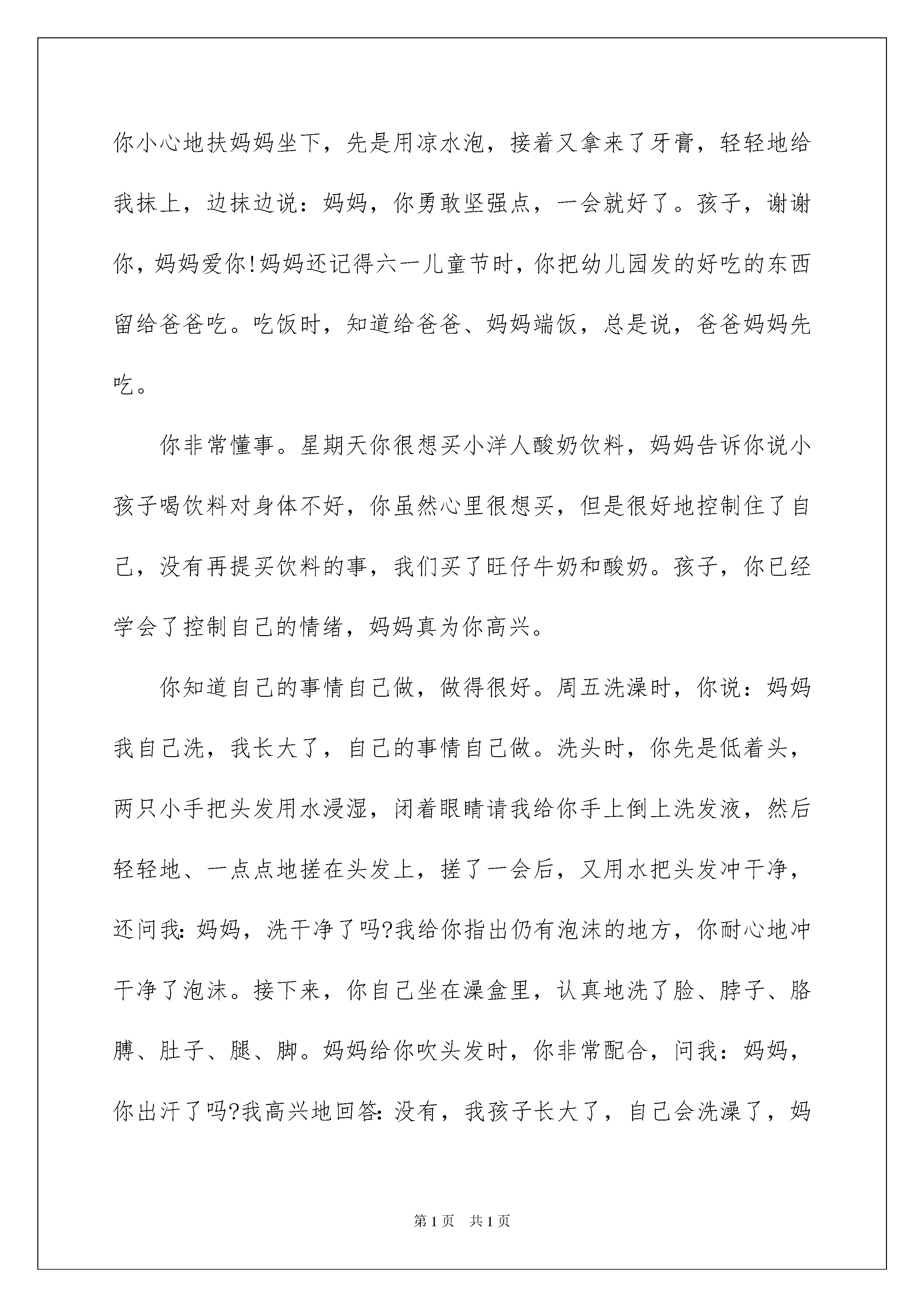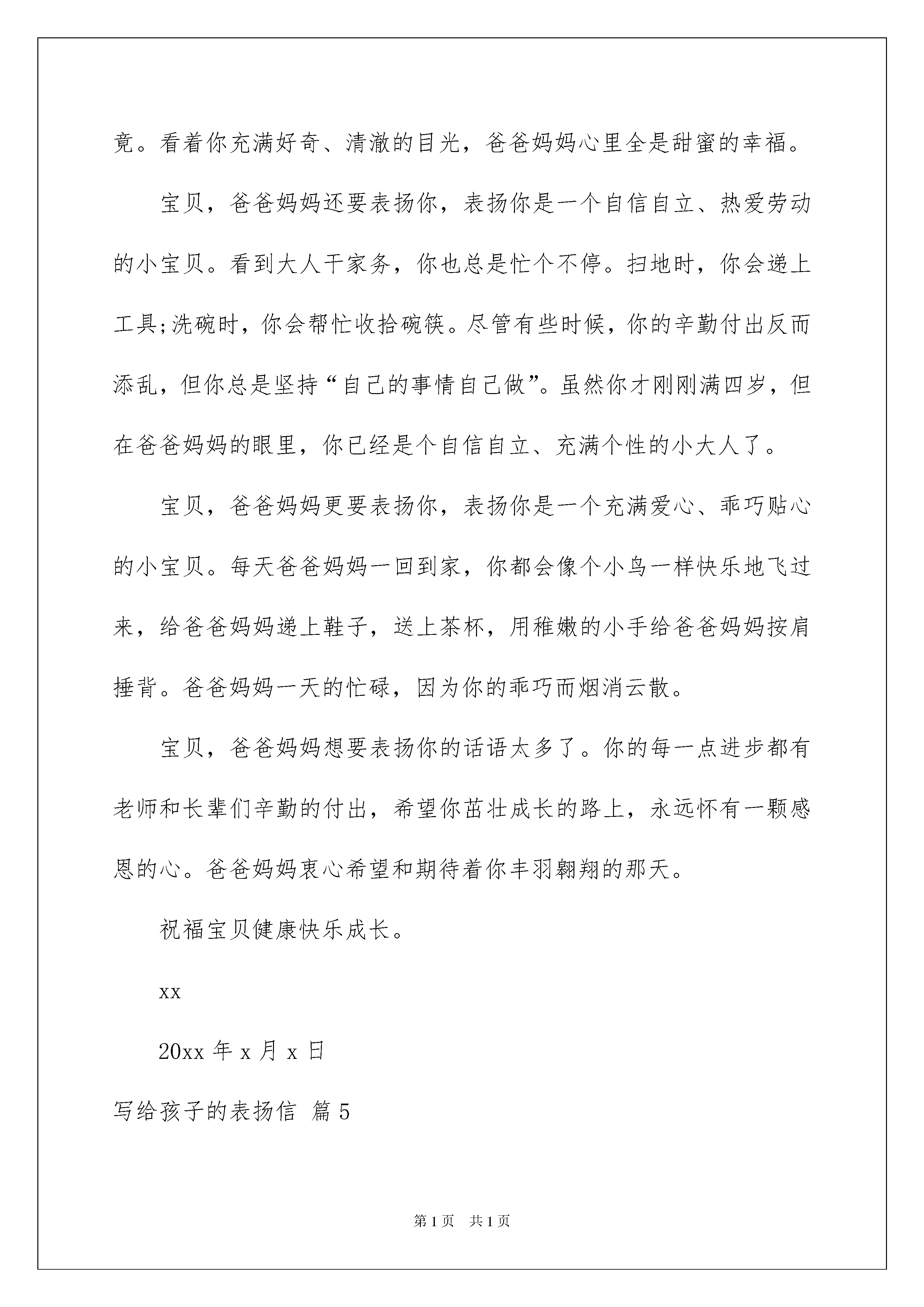 2022写给孩子的表扬信集锦八篇写给孩子的表扬信集锦八篇在当下社会,越来越多人会去使用表扬信,表扬信是对他人的行为表示赞扬的信函。大家知道表扬信的格式吗?下面是我为大家整理的写给孩子的表扬信8篇,仅供参考,希望能够帮助到大家。写给孩子的表扬信篇1亲爱的多多小朋友:你好!今天,你收到了来自妈妈的表扬信,你是不是感到很意外呢?想一想,这段时间你做过什么?都有哪些收获?玩滑板车,开始的时候,一步也不敢动,想放弃,不玩了,妈妈告诉你,别怕,一步一步地走,走的多了,就会跑的很快!对吧宝贝?虽然你还比不上别的小朋友那样脚步如飞,但因为你的坚持,所以你学的很快。每一个小孩子不是刚生下来就什么都会的,只要他肯努力,乌龟也能超过骄傲的兔八哥。在小区的健身场所爬高,看到别的小朋友爬,你也想爬,但是你站上去,却害怕了。第一天晚上,你只爬了一层,就要下来,第二天晚上,你居然爬到了四层,你一层一层地突破,其实是突破了你自己,突破了自己,你就会超越自己,不是在别人的赞美声中表现自己,而是要用自己的努力来证实自己。打篮球,开始的时候,一个也拍不了,但是练的多了,你就能拍好多下,而且拍的越来越高,每一天,都有新的进步。在小广场上遇到你的同学,球被他们抢走了,你站着不动,妈妈告诉你,球就是用来抢着玩的,一个人玩没意思,小朋友们一起玩,抢来抢去,玩的才开心。你终于感受到大家一起玩的快乐,你甚至把每天晚上去找同学玩说成“朋友大会”,这是多么美好的词语啊,相信每一个人都会羡慕的。还有一件事情,让妈妈颇为感触,那就是每一天,你都用心地去养你的泥鳅、田螺、河蚌,还养你的蝌蚪,一天天观察蝌蚪从长出小腿到褪去尾巴,变成小蛤蟆的模样,然后把他们放出来。你去鱼市场捡来别人从鱼里挑出来的海马、海螺、海星、这样那样的虾兵蟹将,晒干,像标本一样挂在墙上,你说那是你的宝贝,是你的海底世界。每天,你去研究他们,整理他们,并招呼别人一起去分享你的喜悦。开始的时候妈妈不以为然,后来才发现,你真的已经很用心地积累了一个微型的海底世界,那里寄托着你对大自然的热爱和好奇。宝贝,这段时间,你表现出了你的勇敢和执着,你表现出你崭新的一面,你从不愿和别人沟通,变得喜欢朋友,你从不喜欢叫人,变得比以前有礼貌。你热爱读书,书带给你以这个世界上无限的美丽和新鲜,让你了解天地万物的神奇之处,让知识充实着你的脑海,滋养着你的身心。这都是你用努力换来的成绩。是的,宝贝,妈妈从来都不承认你的懦弱和胆小,妈妈从来都觉得我的宝贝是最勇敢最努力最有爱心的男子汉。加油吧亲爱的宝贝,加油啊,所有的小朋友们,你们都是最棒的!此致敬礼!爱你的妈妈X年X月X日写给孩子的表扬信篇2提笔的瞬间,宝宝入园时的种种表现,一一浮现在眼前,带给我的那份惊喜与感动,让我都无法用语言一一表述出来,在孩子面前任何的语言都显得过于苍白。从不想去幼儿园到现在高高兴兴的去幼儿园,而且学会了与人分享,不论是精神还是物质上。还学到了好多常识,告诉我着火了要打119,遇到坏人要找警察叔叔,喜欢给爸妈讲故事,喜欢帮爸妈做事情。作为家长,我们感到非常的高兴,也对老师的付出表示由衷的感谢。宝宝带给我很多惊喜与感动,幼儿园的老师们也带给我很多惊喜与感动,我感动于老师每天早上笑的问候,我感动于老师们每天的细心照料,我感动于每次活动时老师们的精心准备。但是,宝宝也有一些表现不太好的地方,经常会骄傲了,写作业不是很认真了,但我们发现他和以前相比有了一些进步和提高,我们觉得宝宝在各位老师的帮助下,慢慢开始长大了。总之,宝宝进步很多,就不一一举例了。希望以后在各位老师的指导下,认真学习,和每一个小朋友友好相处,做一个自尊,自信,自强的小朋友。写给孩子的表扬信篇3翔翔,你真的长大了:你会站在姥姥身后,用小手轻轻的给姥姥捶背;你会帮妈妈端来洗脚水给妈妈洗脚;碰到好吃的东西,你知道给每个人都分一份;妈妈回到家,你会拿出特意给妈妈留得糍粑;现在的你都能帮妈妈端饭、拖地、洗衣服、晒衣服了;碰到好玩的`玩具,可以和小朋友一块玩;玩完玩具,能主动把玩具收拾好;从外面回来,能够自觉地洗手;晚上睡觉前能自己洗脸、刷牙、洗脚、洗屁股,周末会乖乖地让妈妈给你剪指甲;全家人很高兴你能有这样的进步,我们相信,越来越长大的你,会给我们更多地惊喜!写给孩子的表扬信篇4亲爱的小宝贝:时间过的真快啊,一转眼,你都已经过了四岁的生日,成了中班的小朋友了。看着你一天天地长大,一天天地懂事,一天天地让我们刮目相看,一天天地带给我们幸福和惊喜,爸爸妈妈心里真是高兴。一想到你,爸爸妈妈的耳边就回响着你快乐的笑声,心里就洒满了灿烂的阳光。宝贝,爸爸妈妈要表扬你,表扬你是
