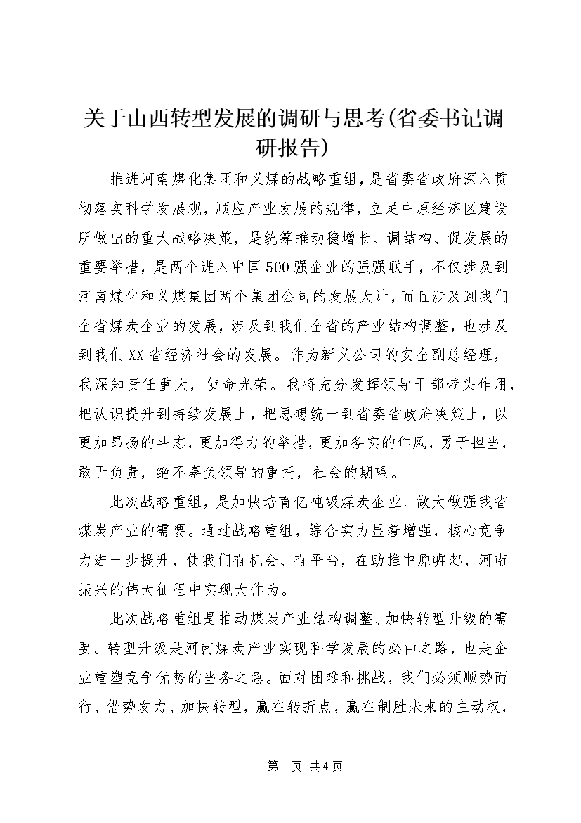 关于山西转型发展的调研与思考(省委书记调研报告)推进河南煤化集团和义煤的战略重组是省委省政府深入贯彻落实科学发展观顺应产业发展的规律立足中原经济区建设所做出的重大战略决策是统筹推动稳增长、调结构、促发展的重要举措是两个进入中国500强企业的强强联手不仅涉及到河南煤化和义煤集团两个集团公司的发展大计而且涉及到我们全省煤炭企业的发展涉及到我们全省的产业结构调整也涉及到我们XX省经济社会的发展。作为新义公司的安全副总经理我深知责任重大使命光荣。我将充分发挥领导干部带头作用把认识提升到持续发