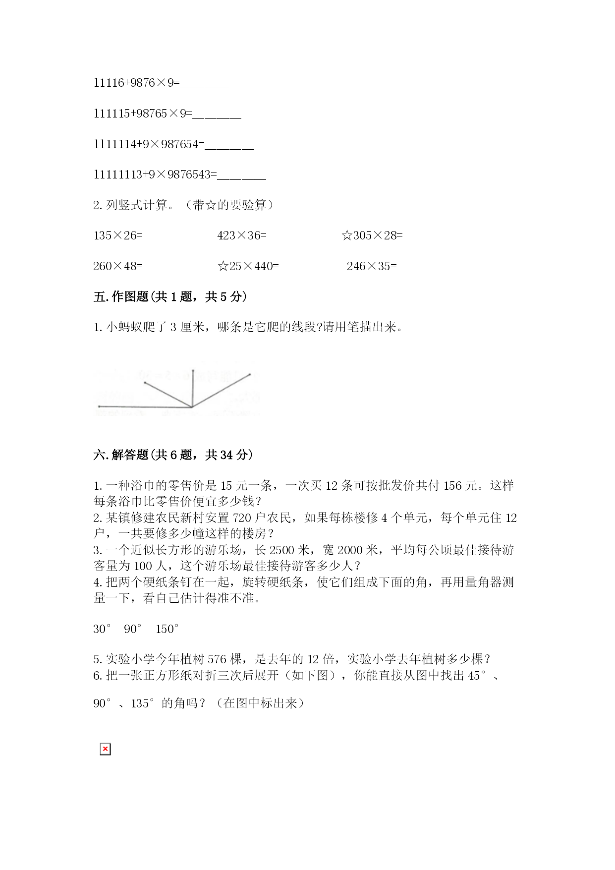 人教版小学数学四年级上册期末测试卷一.选择题(共6题,共12分)1.像0、1、2、3、4…这样的数,都是()。A.计数单位B.位数C.自然数D.数字2.下列几个角中,最大的是()。3.强强每分钟能打95个字,570个字强强要打()分钟。A.7B.8C.6D.94.小王22分钟写了198个字,去问他每分钟写()个字。A.7B.8C.6D.95.下面算式中,()的得数小于5000。A.240×18B.159×50C.302×196.数一数如图中有()条线段。A.1条B.4条C.9条D.10条二.判断题(共6题