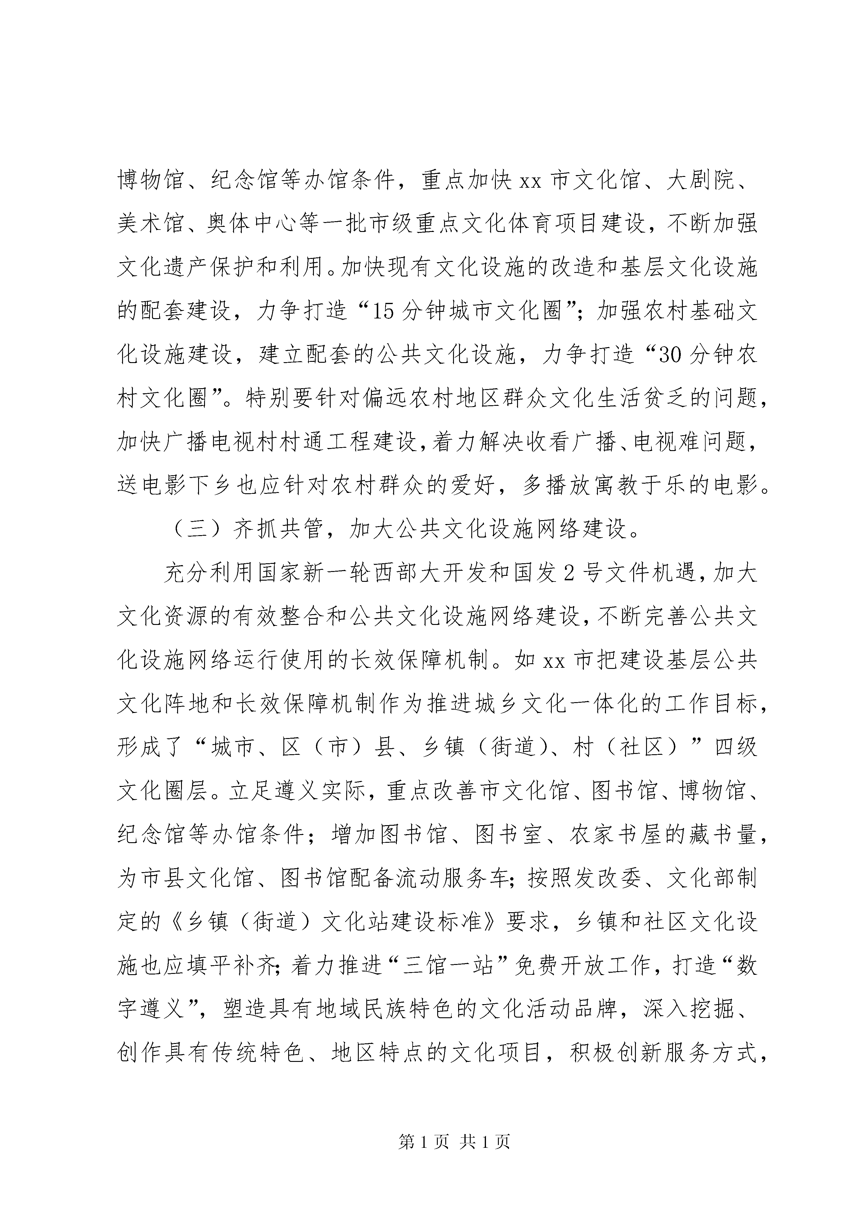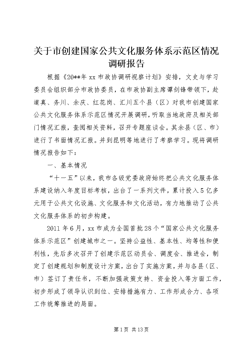 关于市创建国家公共文化服务体系示范区情况调研报告根据《20**年xx市政协调研视察计划》安排文史与学习委员会组织部分市政协委员在市政协副主席谭剑锋带领下赴道真、务川、余庆、红花岗、汇川五个县(区)对我市创建国家公共文化服务体系示范区情况开展调研听取当地政府及相关部门情况汇报查阅相关资料召开专题座谈会。其余县(区、市)进行了书面情况汇报。并到昆明等地进行了考察学习。现将调研情况报告如下:一、基本情况“十一五”以来我市各级党委政府始终把公共文化服务体系建设纳入年度