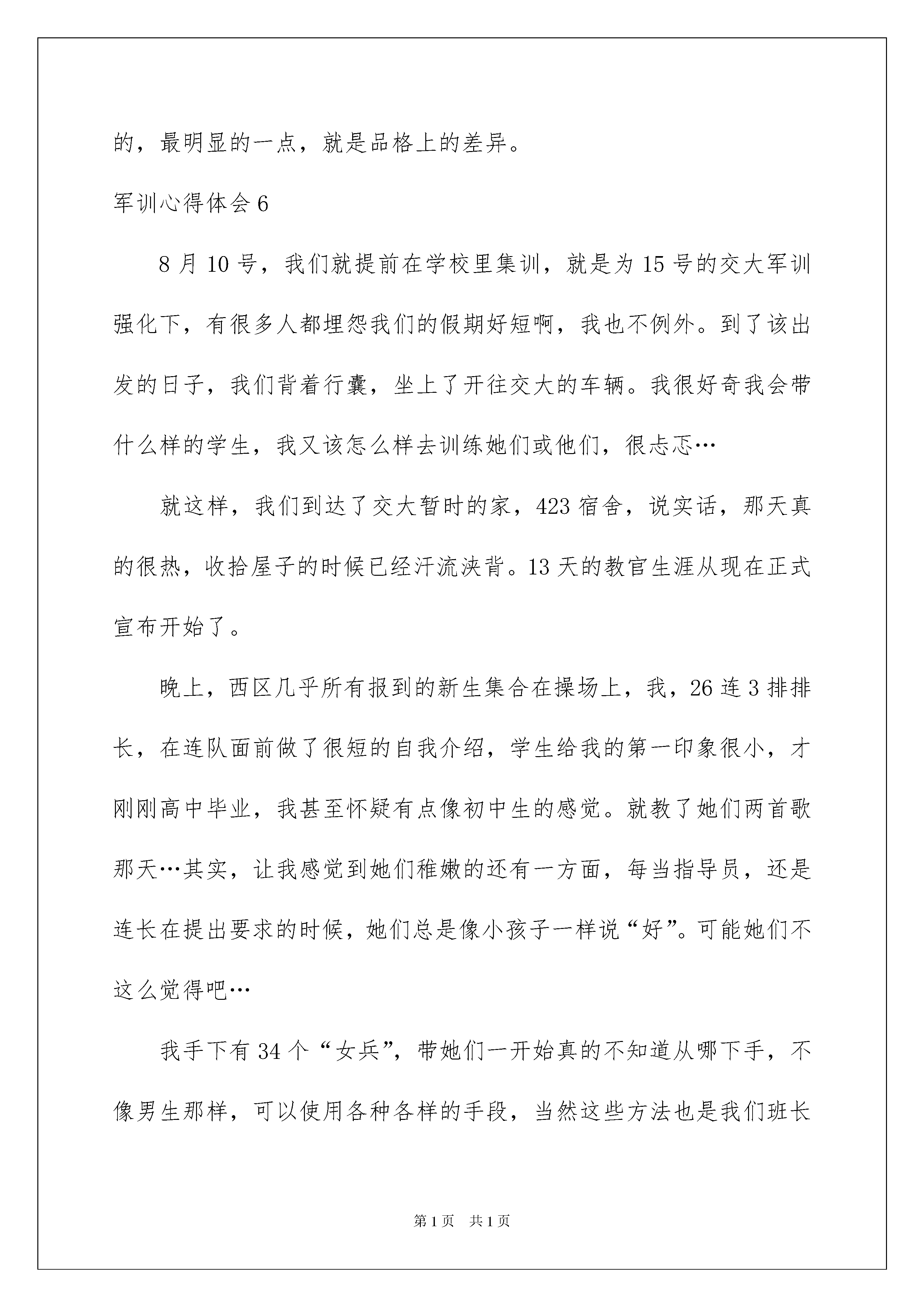 此资料由网络收集而来,如有侵权请告知上传者立即删除。资料共分享,我们负责传递知识。20XX年精选军训心得体会军训是很苦很累的,却又是很充实的。下面是小编搜集整理的2019年精选军训心得体会,欢迎阅读。军训心得体会一十五天军训结束了在这十五里,我们有喜,有泪,有欢,有苦真乃五味具全了。军训让我们洗涤去许多的酸甜苦辣,我愿意记得这些军训中的生活将是我生命中的美好回忆。军训的日子就把自己当部队的军人看待了,在这里有中命令是绝对的服从,在这里有种纪律叫:绝对严明。虽然条条框框,却把人