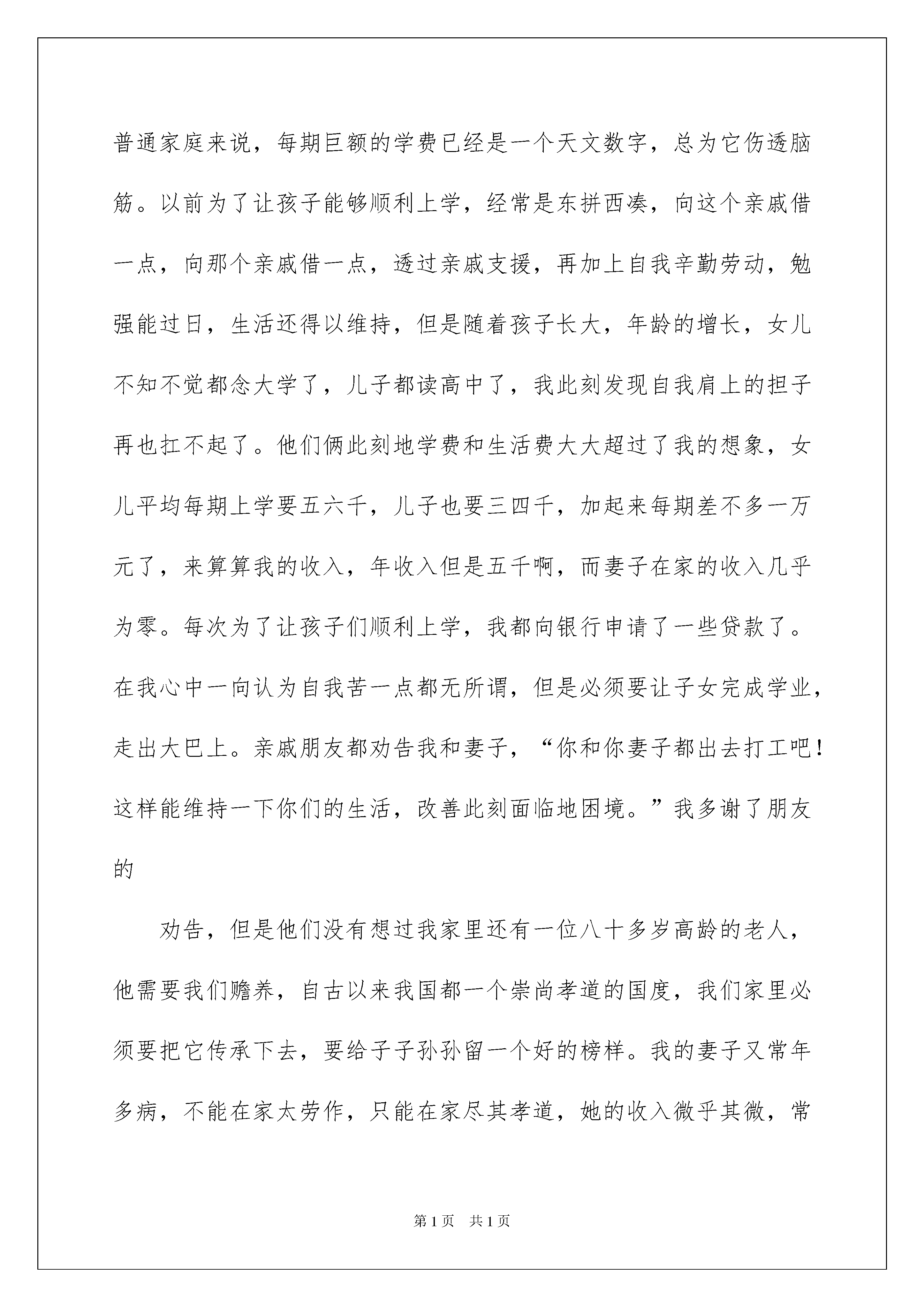 农村低保申请书集锦15篇农村低保申请书1尊敬的领导:人系20某某级某某学生某某,因家庭经济困难,特申请贫困补助。我家住某某,家乡是一个生活简单的边远山区。父母皆为农民。父亲患有严重的腿病,不能干体重活;妹妹和弟弟正在上高中,一家五口人生活的重担全都落在母亲一个人微弱的肩膀上,加上近几年为了盘我们姐弟三人读书,欠下了近8万余元的外债,目前连正常的生活开支都十分困难。为了能缓解家庭经济负担,为了能顺利完成学业,我带着弟妹曾尝试着在假期打工,养成勤劳的品格和简朴的生活习惯,但微薄的收入,对于超负荷的家庭经济状况