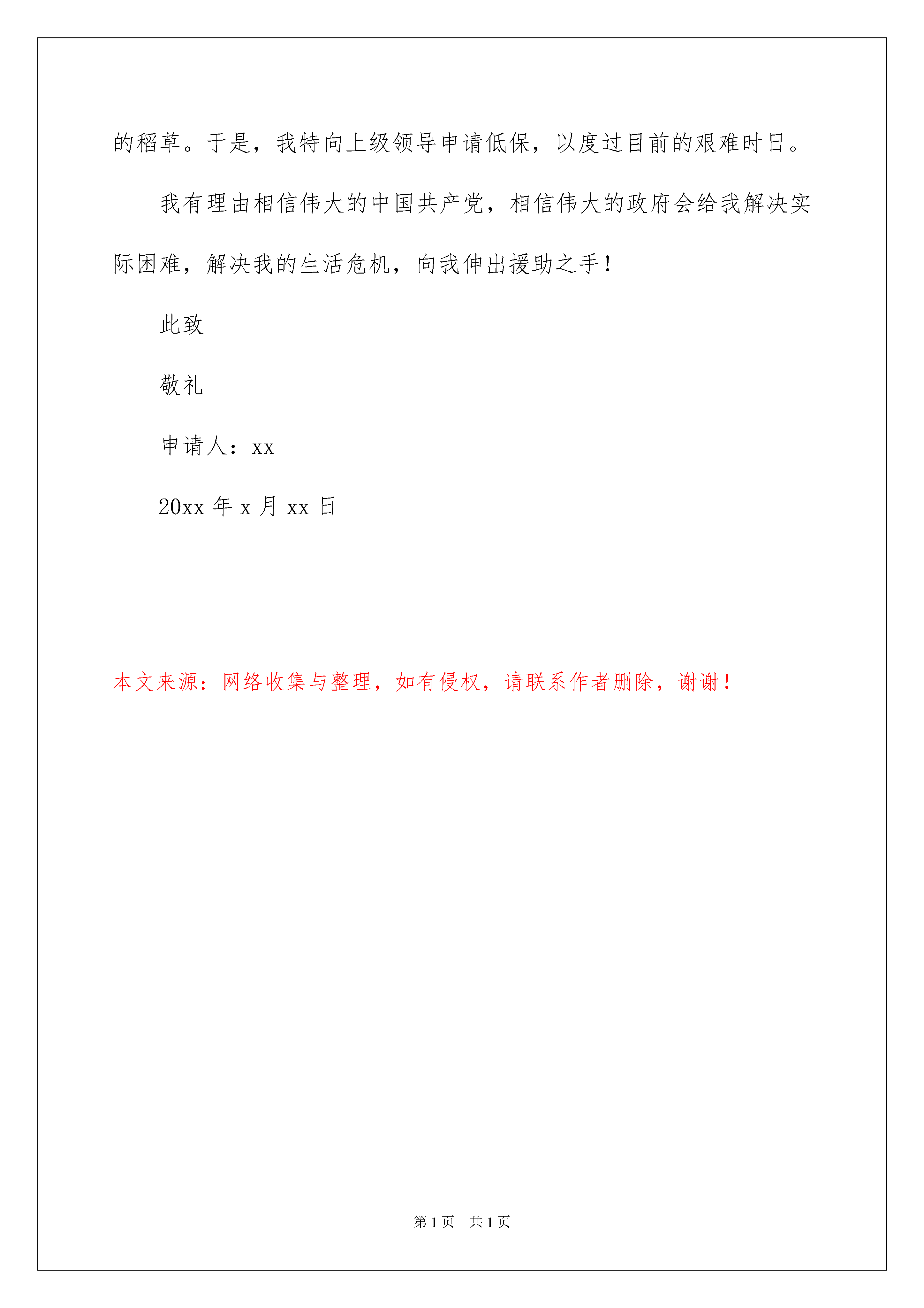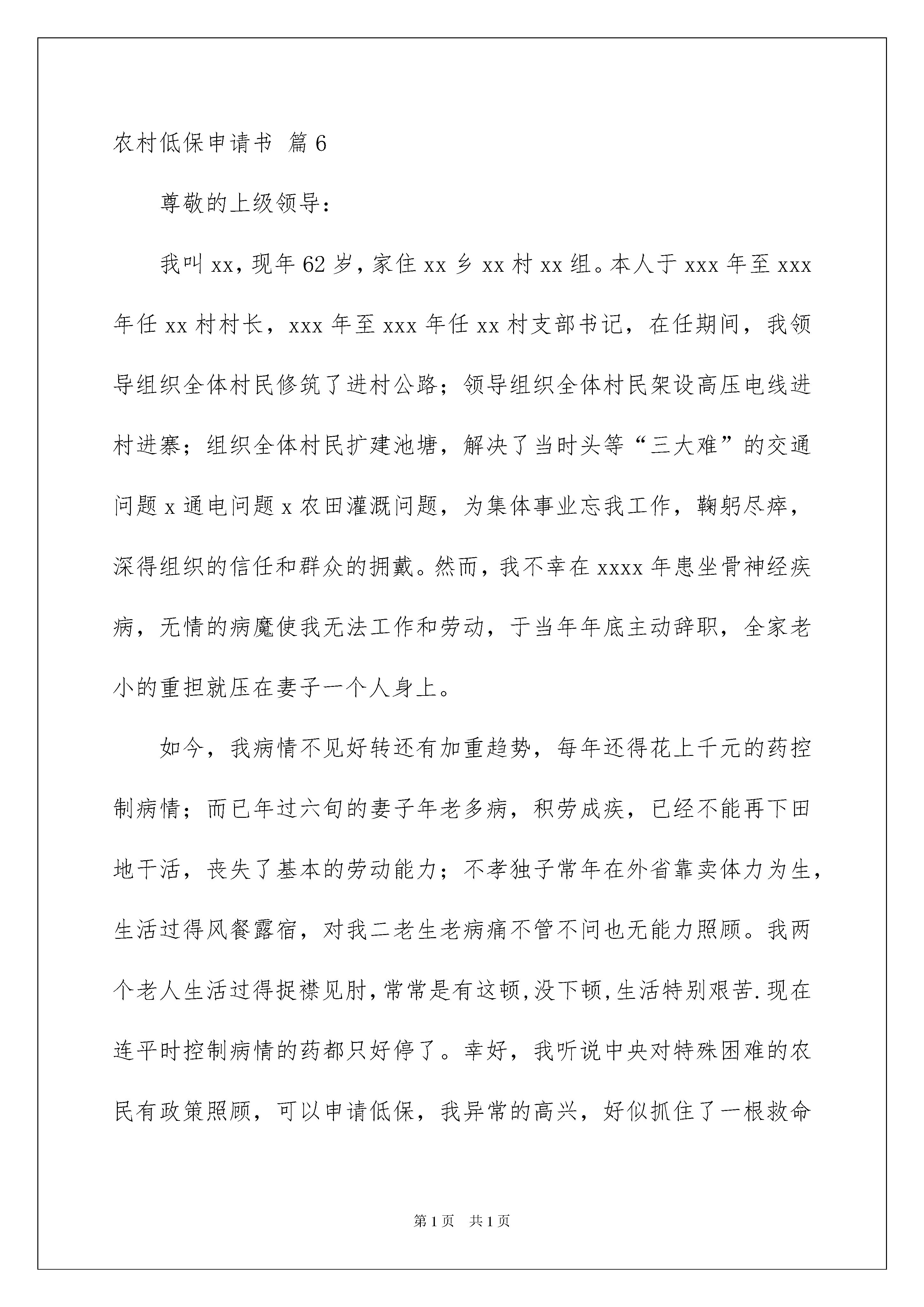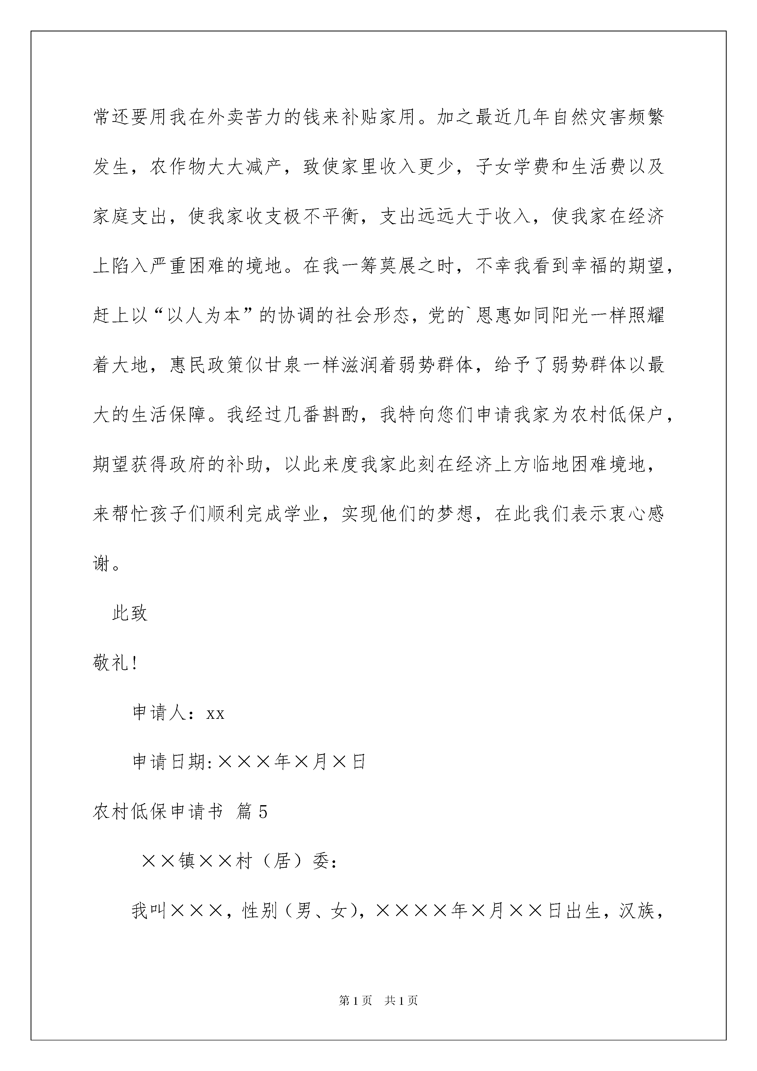 2022农村低保申请书集锦六篇农村低保申请书集锦六篇我们眼下的社会,申请书起到的作用越来越大,申请书是我们平时提出请求的一种书信。为了让您在写申请书中更加简单方便,以下是我帮大家整理的农村低保申请书6篇,仅供参考,大家一起来看看吧。农村低保申请书篇1敬的上级领导:我叫xxx,男,汉族,出生于1952年7月25日,今年61岁了,系Xx市Xx镇Xx村六组