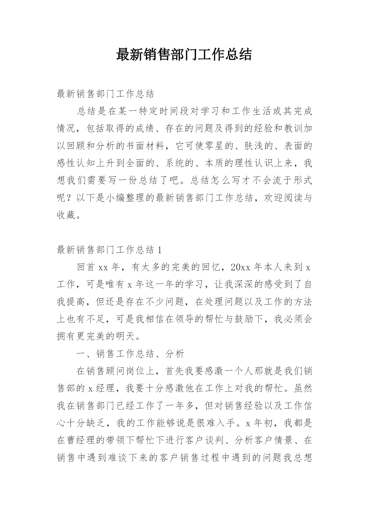 最新销售部门工作总结最新销售部门工作总结总结是在某一特定时间段对学习和工作生活或其完成情况,包括取得的成绩、存在的问题及得到的经验和教训加以回顾和分析的书面材料,它可使零星的、肤浅的、表面的感性认知上升到全面的、系统的、本质的理性认识上来,我想我们需要写一份总结了吧。总结怎么写才不会流于形式呢?以下是小编整理的最新销售部门工作总结,欢迎阅读与收藏。最新销售部门工作总结1回首xx年,有太多的完美的回忆,20xx年本人来到x工作,可是唯有x年这一年的学习,让我深深的感受到了自我提高,但还是存在不少问题,在处理