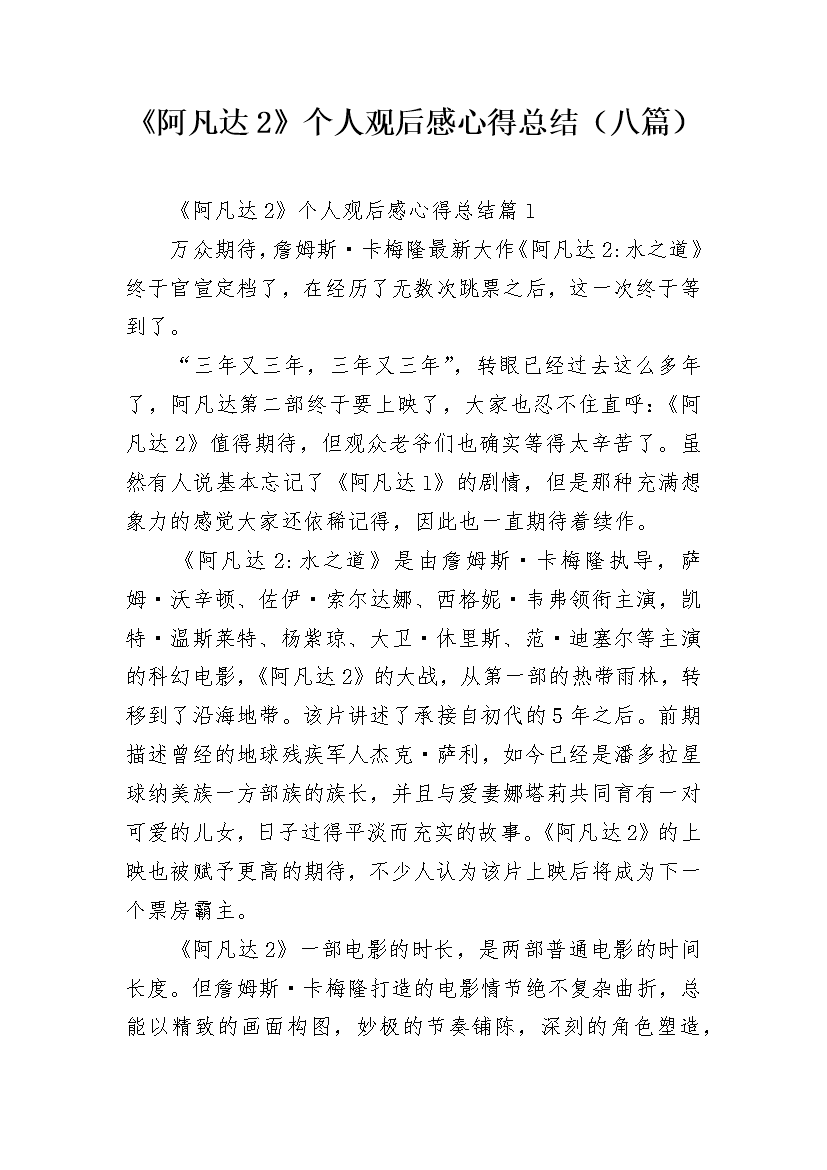《阿凡达2》个人观后感心得总结(八篇)《阿凡达2》个人观后感心得总结篇1万众期待,詹姆斯·卡梅隆最新大作《阿凡达2:水之道》终于官宣定档了,在经历了无数次跳票之后,这一次终于等到了。“三年又三年,三年又三年”,转眼已经过去这么多年了,阿凡达第二部终于要上映了,大家也忍不住直呼:《阿凡达2》值得期待,但观众老爷们也确实等得太辛苦了。虽然有人说基本忘记了《阿凡达1》的剧情,但是那种充满想象力的感觉大家还依稀记得,因此也一直期待着续作。《阿凡达2:水之道》是由詹姆斯·卡梅隆执导,萨姆·沃辛顿、佐伊·索尔达娜