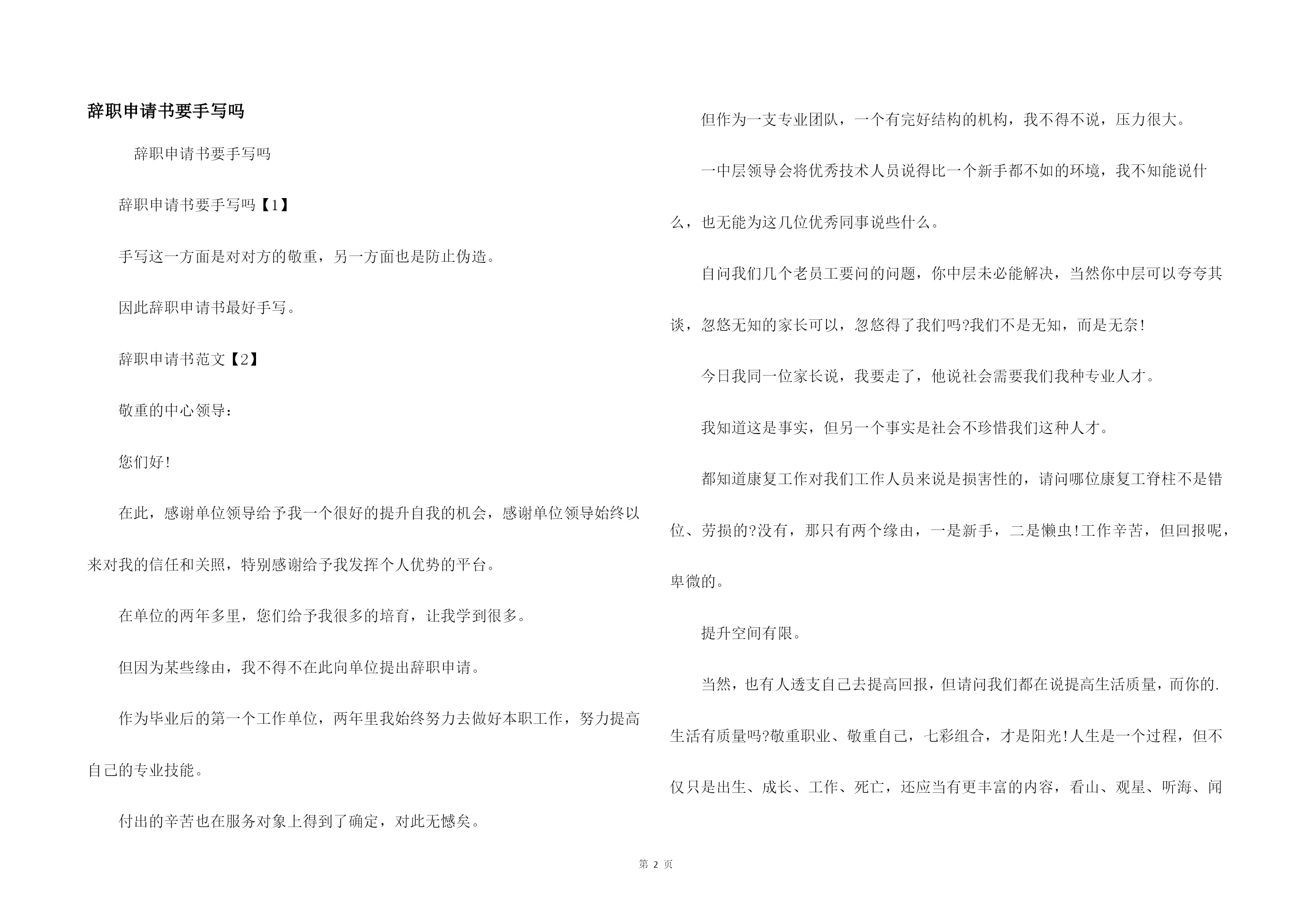辞职申请书要手写吗辞职申请书要手写吗【1】手写这一方面是对对方的尊重,另一方面也是防止伪造。因此辞职申请书最好手写。辞职申请书范文【2】敬爱的中心领导:您们好!在此,感谢单位领导给予我一个很好的提升自我的机会,感谢单位领导一直以来对我的信任和关照,特别感谢给予我发挥个人优势的平台。在单位的两年多里,您们给予我很多的培育,让我学到很多。但因为某些原因,我不得不在此向单位提出辞职申请。作为毕业后的第一个工作单位,两年里我一直努力去做好本职工作,努力提高自己的专业技能。付出的辛苦也在服务对象上得到了肯定,对此无