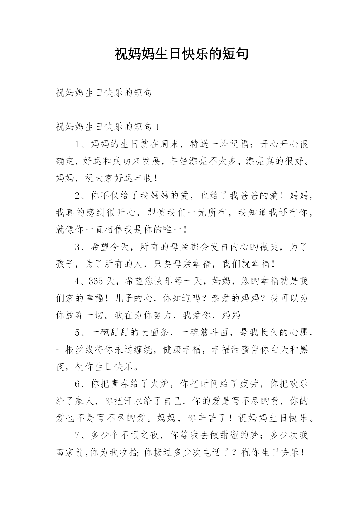 祝妈妈生日快乐的短句祝妈妈生日快乐的短句祝妈妈生日快乐的短句11、妈妈的生日就在周末,特送一堆祝福:开心开心很确定,好运和成功来发展,年轻漂亮不太多,漂亮真的很好。妈妈,祝大家好运丰收!2、你不仅给了我妈妈的爱,也给了我爸爸的爱!妈妈,我真的感到很开心,即使我们一无所有,我知道我还有你,就像你一直相信我是你的唯一!3、希望今天,所有的母亲都会发自内心的微笑,为了孩子,为了所有的人,只要母亲幸福,我们就幸福!4、365天,希望您快乐每一天,妈妈,您的幸福就是我们家的幸福!儿子的心,你知道吗?亲爱的妈妈?我可