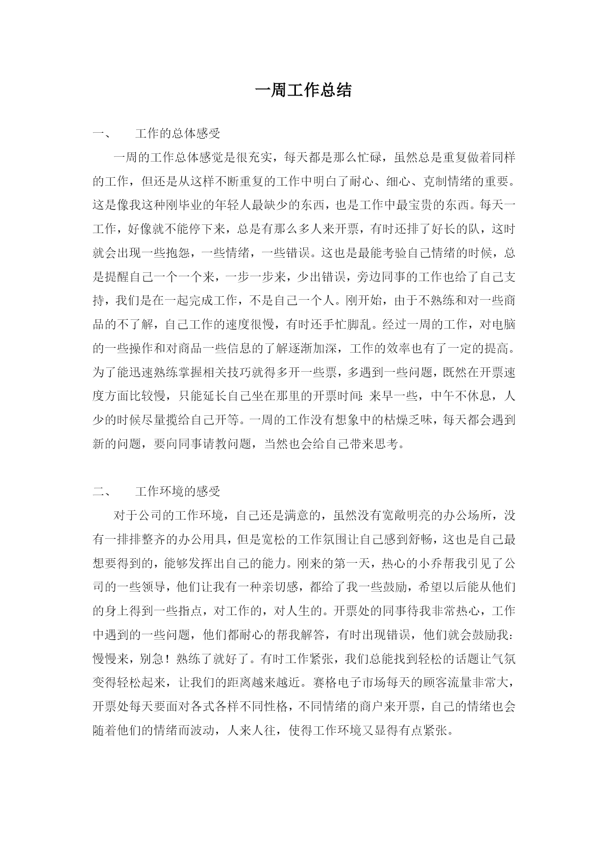 一周工作总结工作的总体感受一周的工作总体感觉是很充实,每天都是那么忙碌,虽然总是重复做着同样的工作,但还是从这样不断重复的工作中明白了耐心、细心、克制情绪的重要。这是像我这种刚毕业的年轻人最缺少的东西,也是工作中最宝贵的东西。每天一工作,好像就不能停下来,总是有那么多人来开票,有时还排了好长的队,这时就会出现一些抱怨,一些情绪,一些错误。这也是最能考验自己情绪的时候,总是提醒自己一个一个来,一步一步来,少出错误,旁边同事的工作也给了自己支持,我们是在一起完成工作,不是自己一个人。刚开始,由于不熟练和对一些