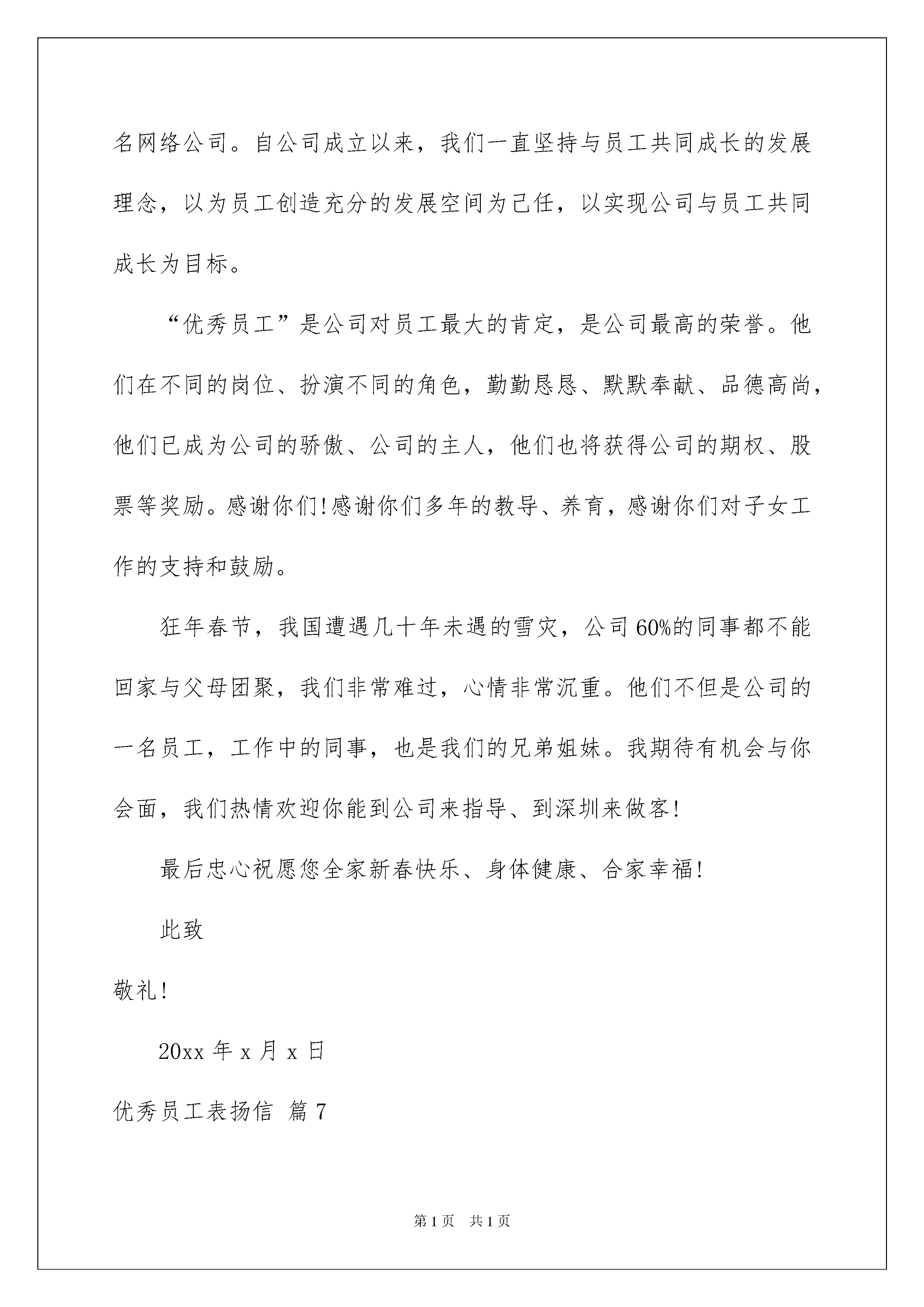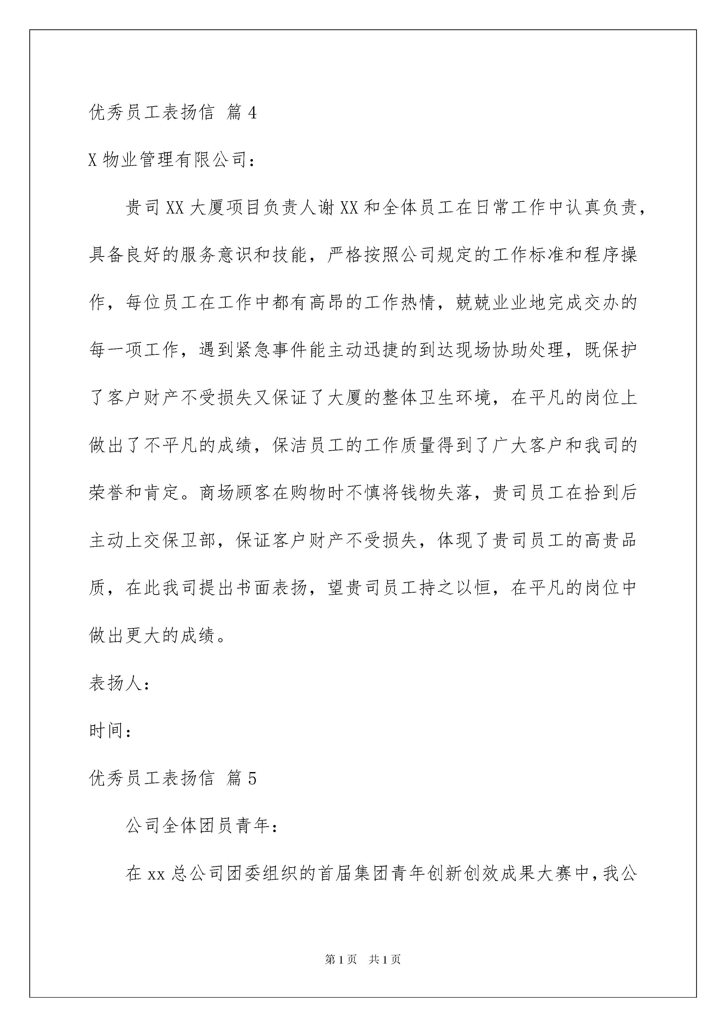2022优秀员工表扬信锦集八篇优秀员工表扬信锦集八篇在不断进步的时代,在很多情况下我们需要用到表扬信,表扬信具有发文的公开性的特点。那么一般表扬信是怎么写的呢?下面是我为大家整理的优秀员工表扬信8篇,希望对大家有所帮助。优秀员工表扬信篇17月初,售后员工曾建兵被派往唐山首钢京唐从事维保业务,工作期间,他把公司利益、客户利益置于最高位置,每日兢兢业业、