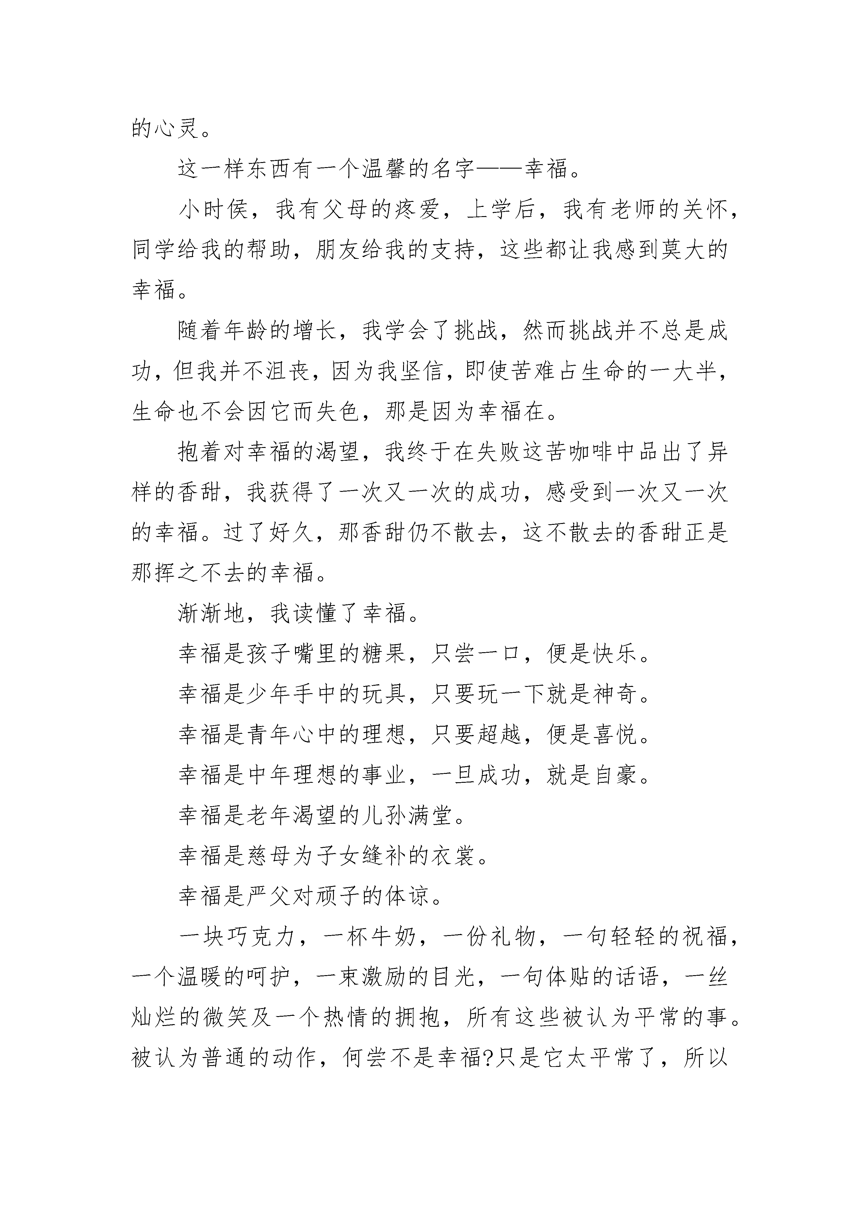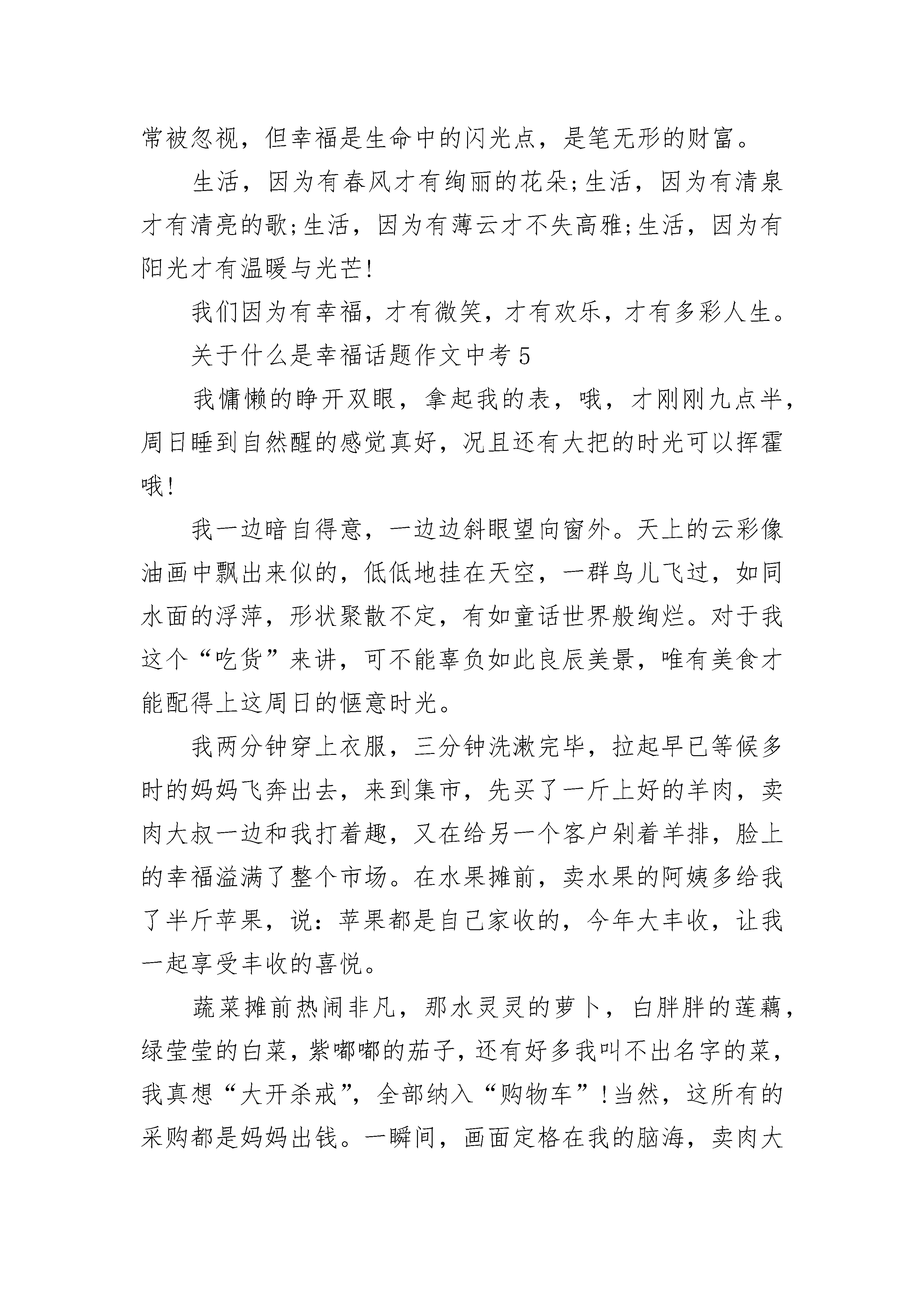 幸福是什么为话题的中考作文幸福,那是什么样的一种滋味?是令人甜蜜的,还是令人回味无穷的……为了寻找幸福,我乘上了幸福直通车。我在自己的生日里找到了幸福。同学们为我祝贺、为我高兴,为我歌唱。有的请我和他们玩游戏,有的请我和她们跳舞,那载歌载舞的屋子里闪烁出童年幸福的光芒。然后,大家一起聚餐,我望着那热乎乎的白饭,顿时,我又体会到了新的幸福。在农民伯伯的稻米田里,我找到了幸福,望着那金灿灿的稻米苗,那丰收的景象,那饱满的果实,是谁让它们那么的自豪,正是那辛勤的农民,他们不知又付出了多少汗水和多少心血啊!创造了