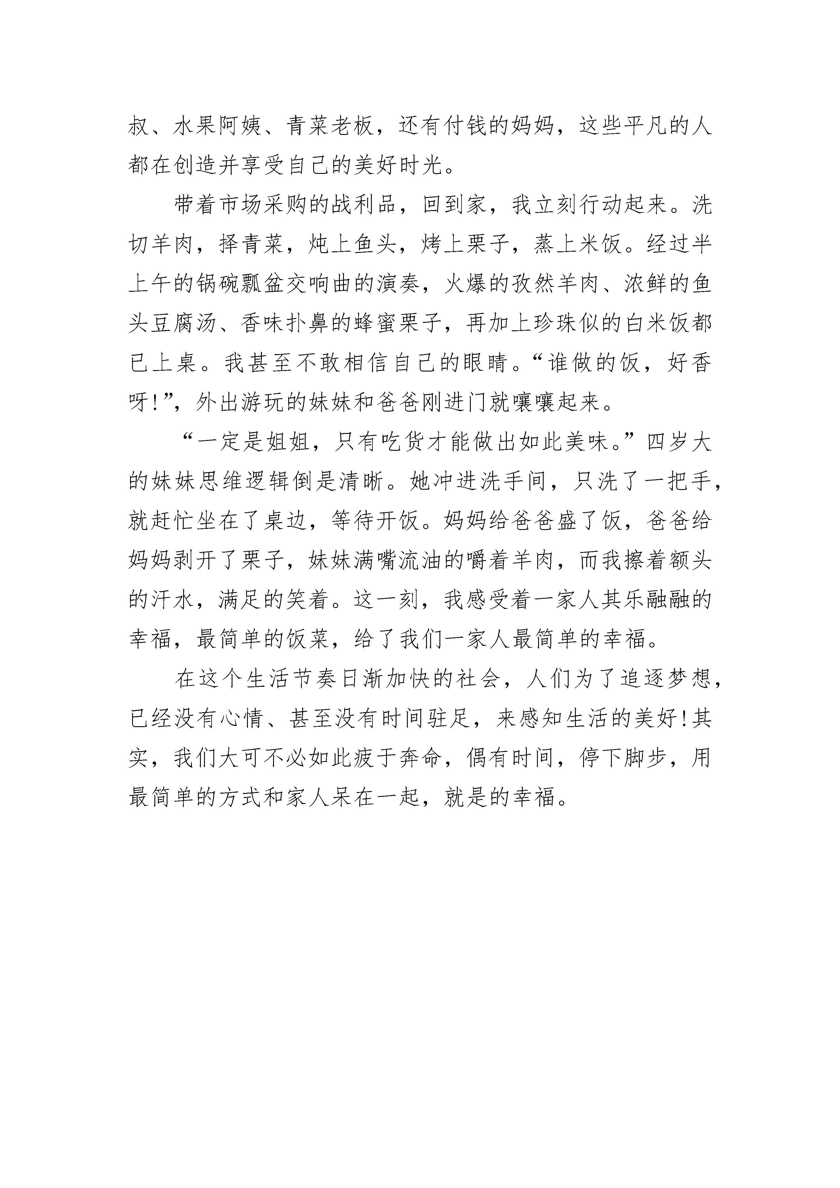 有关于幸福是什么话题作文明月皎皎,流星点点,幸福藏在柔美的清辉中;清风徐徐,花香阵阵,幸福藏在甜美的馥郁中;皓日朗朗,清波漾漾,幸福藏在荡漾的涟漪中。幸福是什么?它是成功时的鲜花与掌声,是满足时的笑容与回味,是放下荣誉的淡泊与沉静。幸福,真的很简单。幸福尽在此生,知足便是天堂。能够抛下三十功名尘与土,是一种幸福。你会在忘却成功中与自己的灵魂对话,不会沉浸与享受在功名的光环下,至殝至善,追求更为卓越的自我。有时,放下不一定是舍弃,而是另一种更广阔的拥有,拥抱着简单的幸福,莫言大师在获诺贝尔文学奖后多次被问及