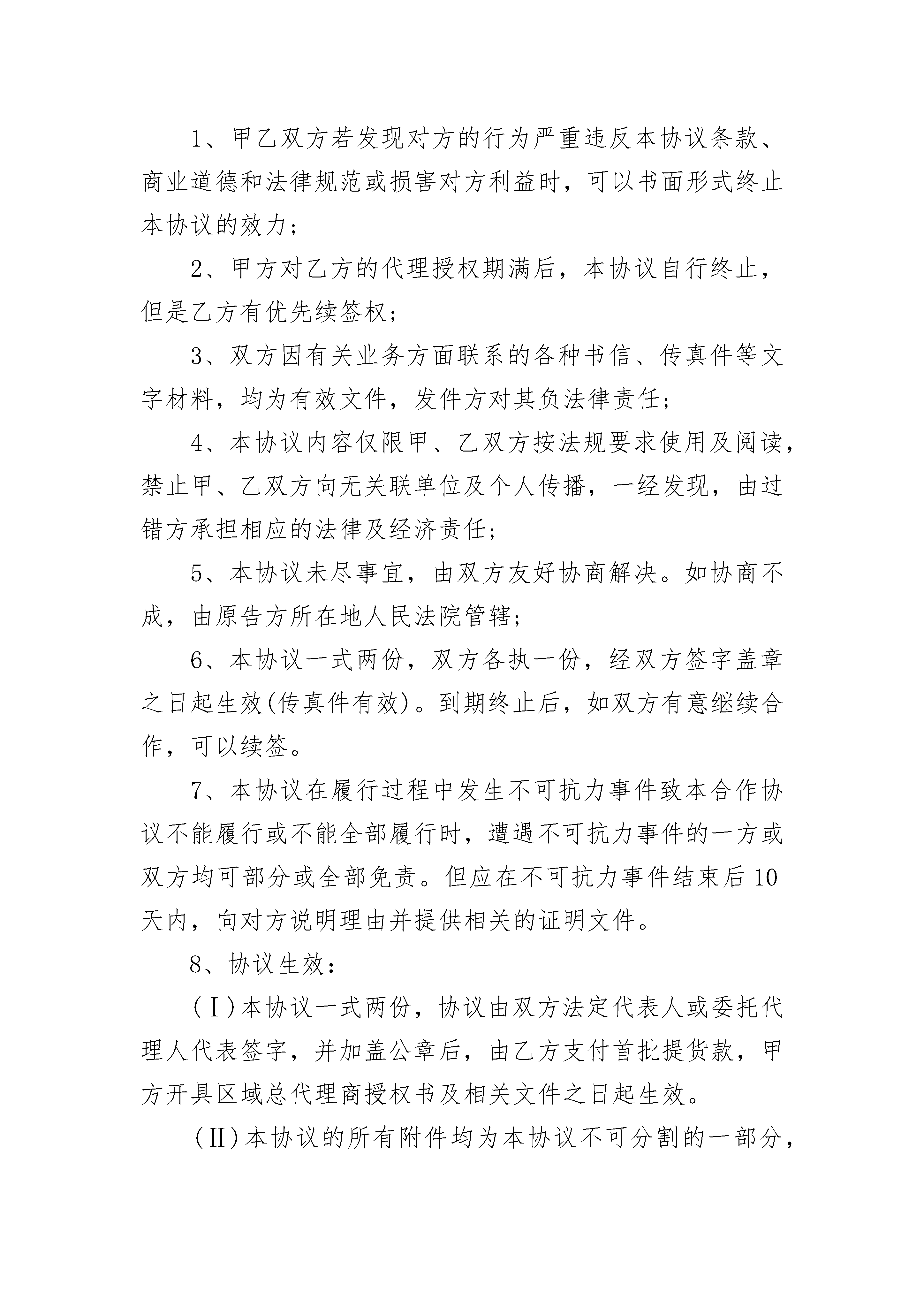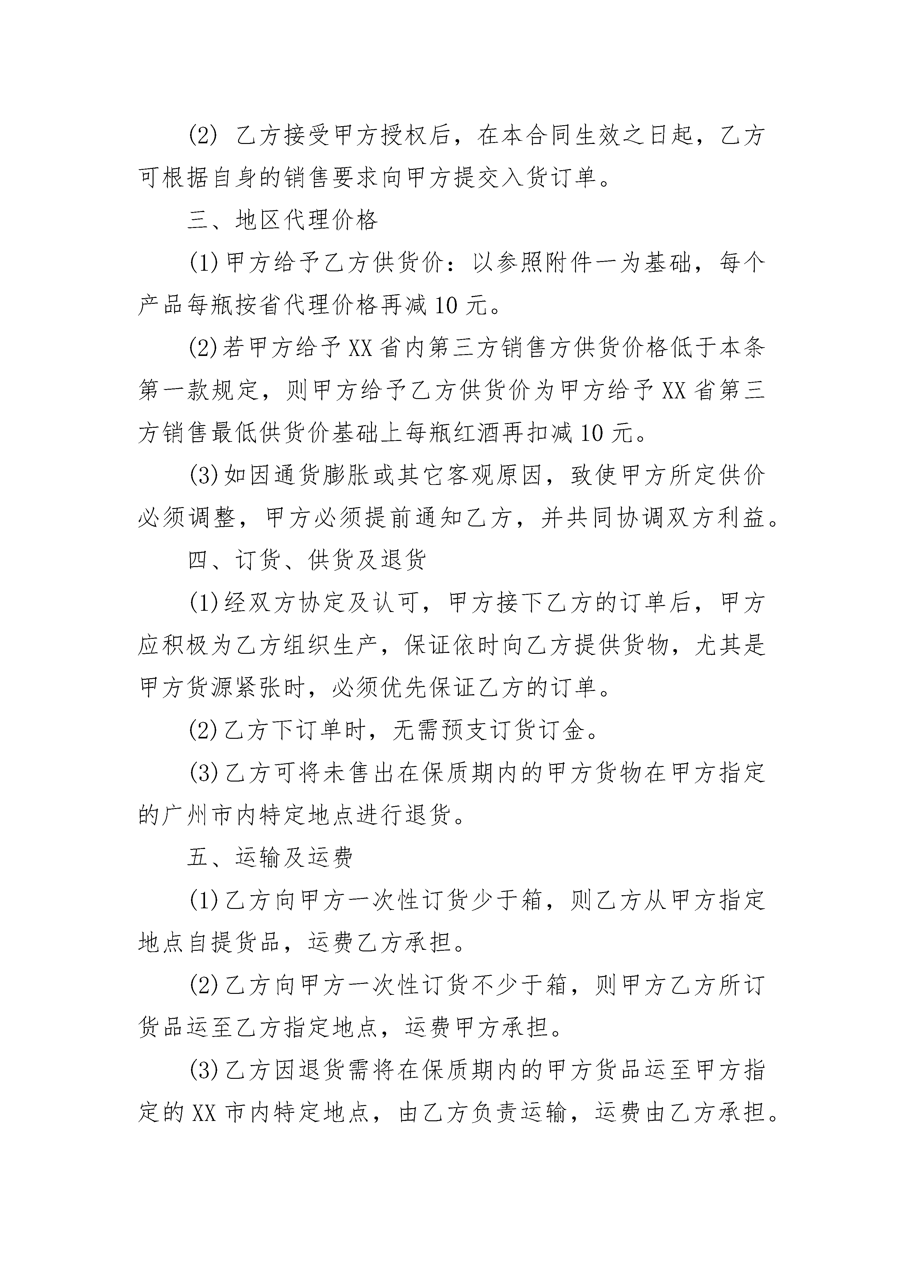 此资料由网络收集而来如有侵权请告知上传者立即删除。资料共分享我们负责传递知识。12酒总代理合同书酒总代理是一种新的产品销售方式酒总代理合同书怎么写呢?以下是在范文网小编为大家整理的酒总代理合同书范文感谢您的阅读。酒总代理合同书范文1甲方:住址:法定代表人:乙方:根据《中华人民共和国合同法》及有关法律规定为促进甲乙双方的商务合作在平等自愿、互惠互利的基础上就甲方授权乙方代理销售甲方生产的所有酒系列广东省区域总代理商事宜现达成如下协议双方必须共同遵守。一、乙方的义务、区域和代理期