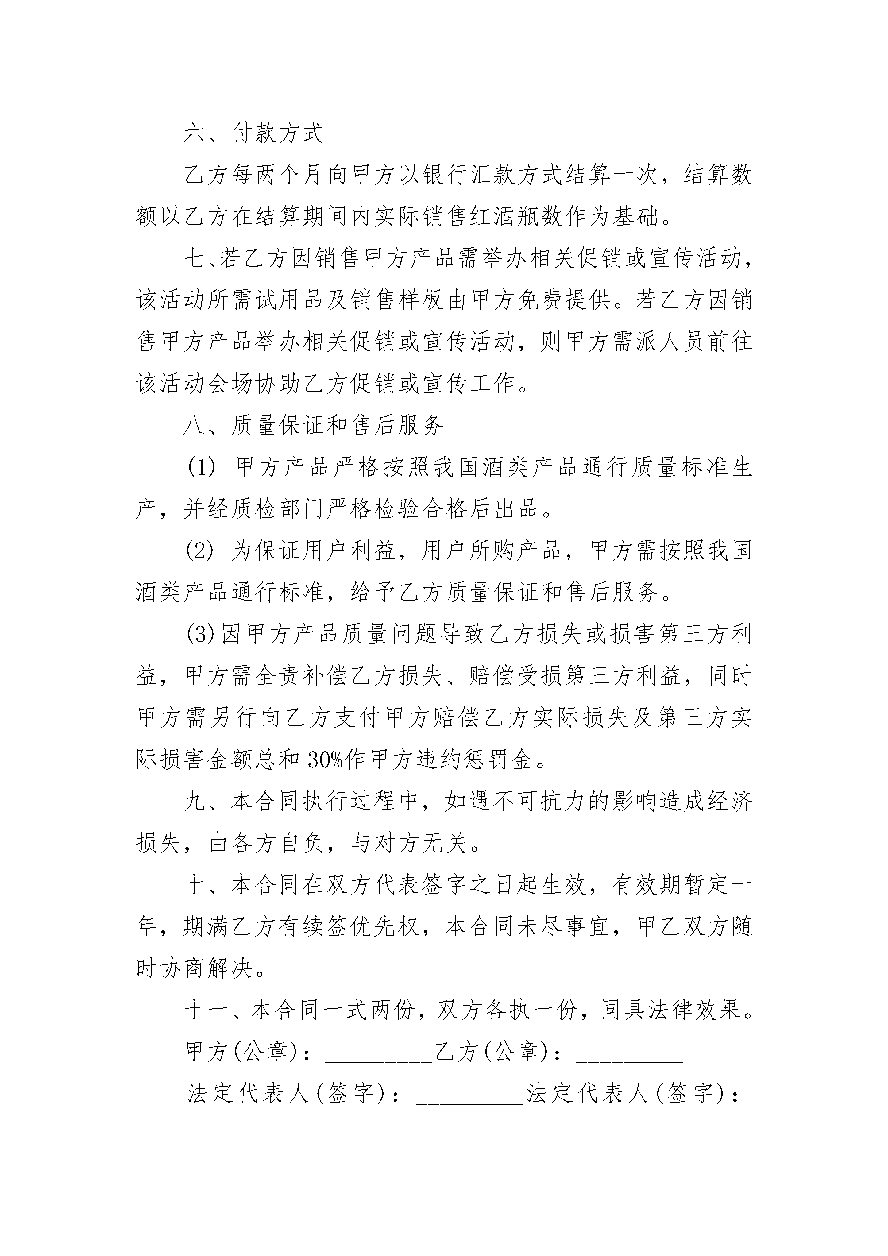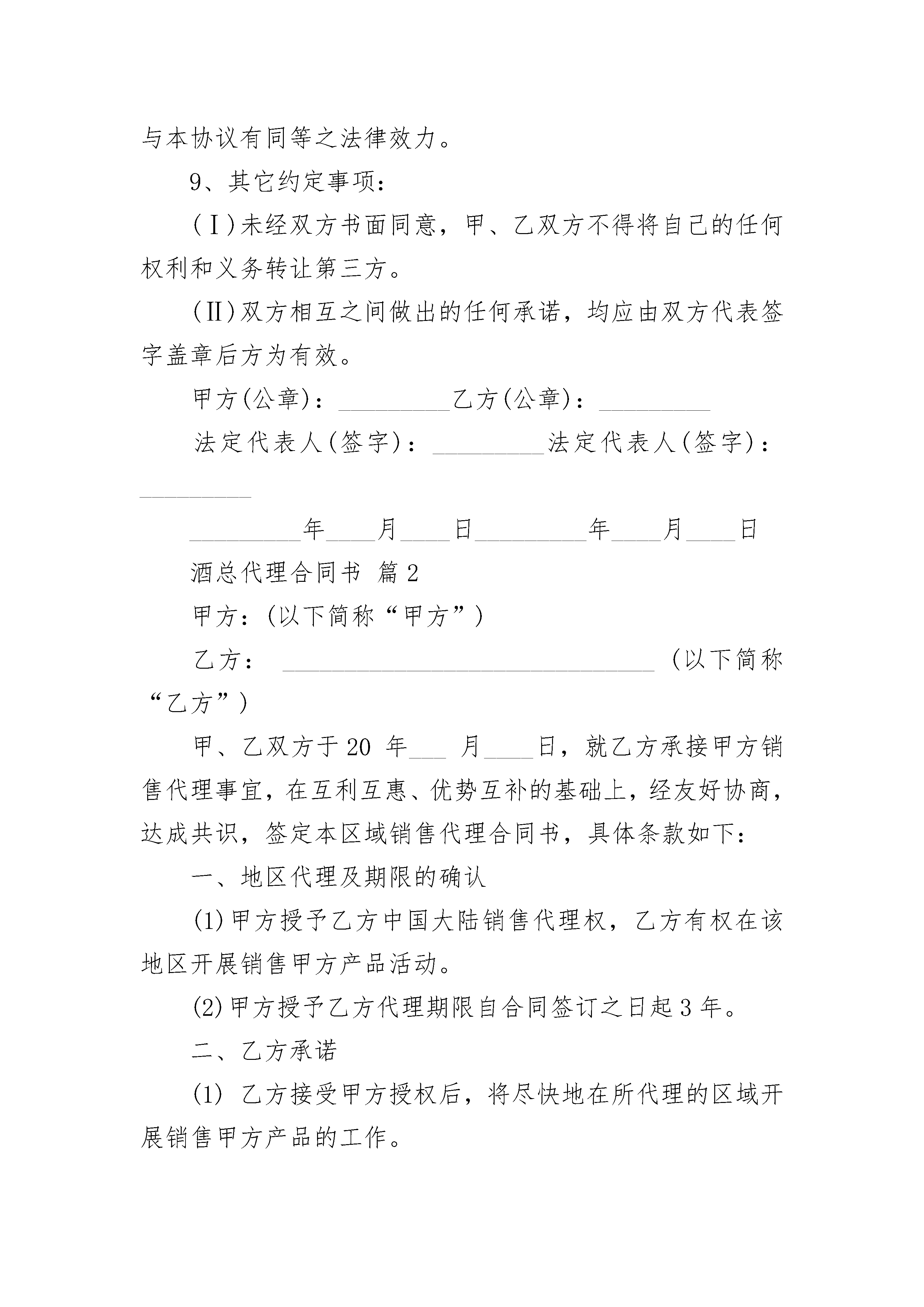 酒总代理合同书酒总代理合同书(通用15篇)酒总代理合同书篇1白酒总代理合同书甲方:_________乙方:_________一、甲方授权乙方限在_________省_________市(县、区)区域内作为甲方产品的独家经销商,甲方不再向另家供货,从而保证乙方独家销售权。二、业务办理方式:现款现货,货到先付款后提货。运输交货方式:代运制交货(只限长途)。乙方提货额达_________元。甲方负责组织货源。三、甲方按各不同品种瓶、盒上明确标明的产品执行标准保证产品质量。四、乙方对销售困难的任何________