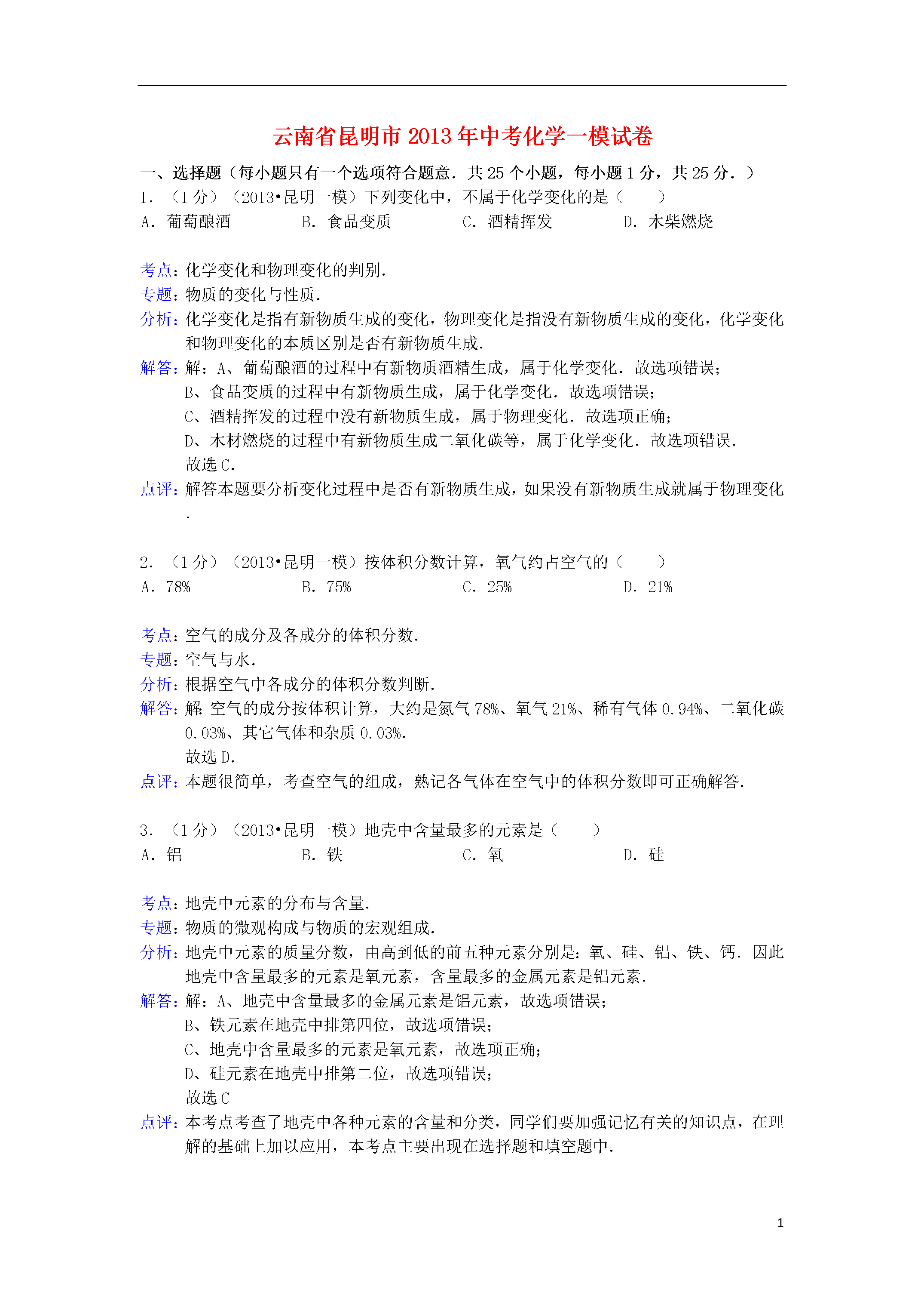 云南省昆明市2013年中考化学一模试卷一、选择题(每小题只有一个选项符合题意.共25个小题,每小题1分,共25分.)1.(1分)(2013•昆明一模)下列变化中,不属于化学变化的是()A.葡萄酿酒B.食品变质C.酒精挥发D.木柴燃烧考点:化学变化和物理变化的判别.专题:物质的变化与性质.分析:化学变化是指有新物质生成的变化,物理变化是指没有新物质生成的变化,化学变化和物理变化的本质区别是否有新物质生成.解答:解:A、葡萄酿酒的过程中有新物质酒精生成,属于化学变化.故选项错误;B、食品变质的过程中有新物质生