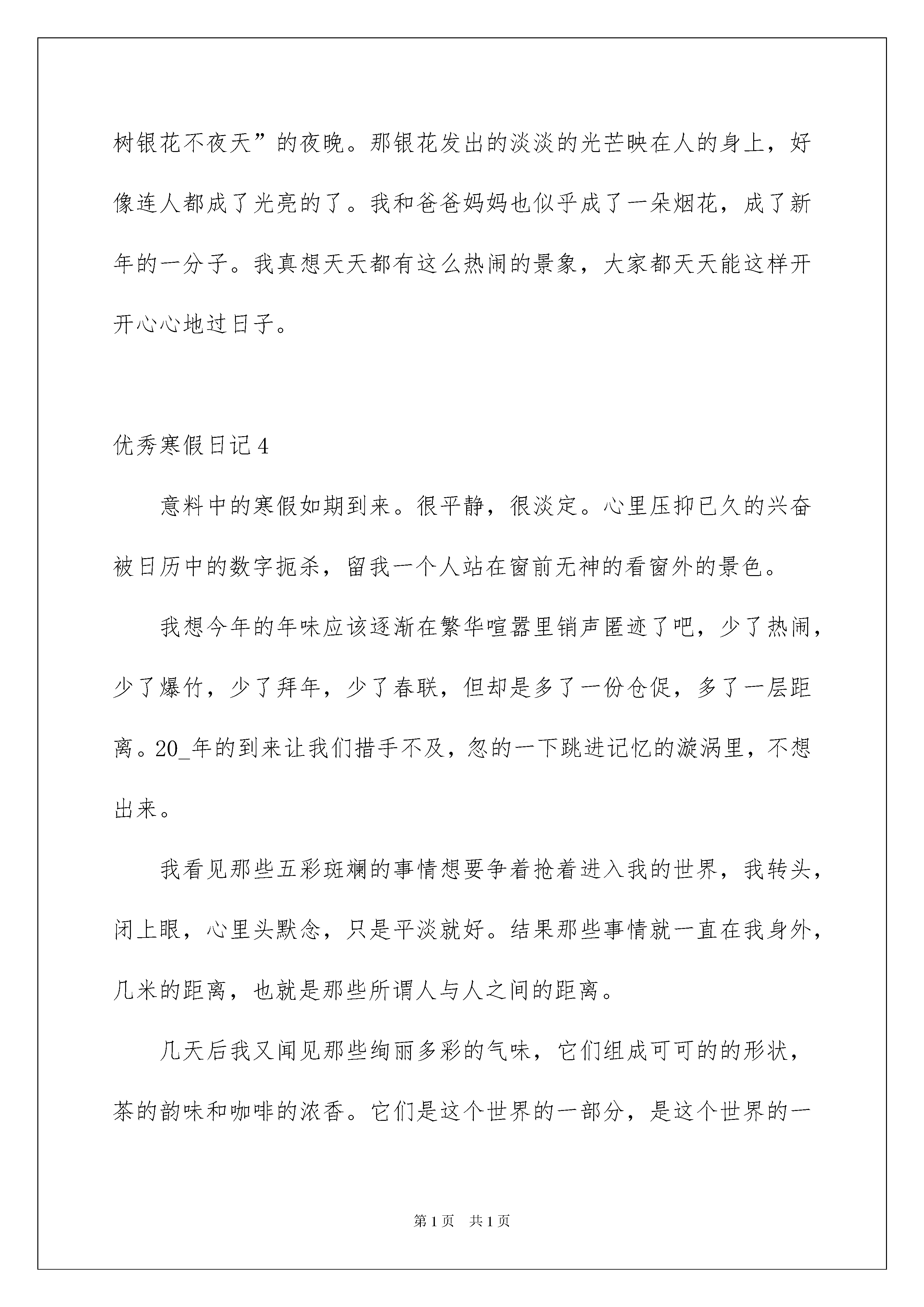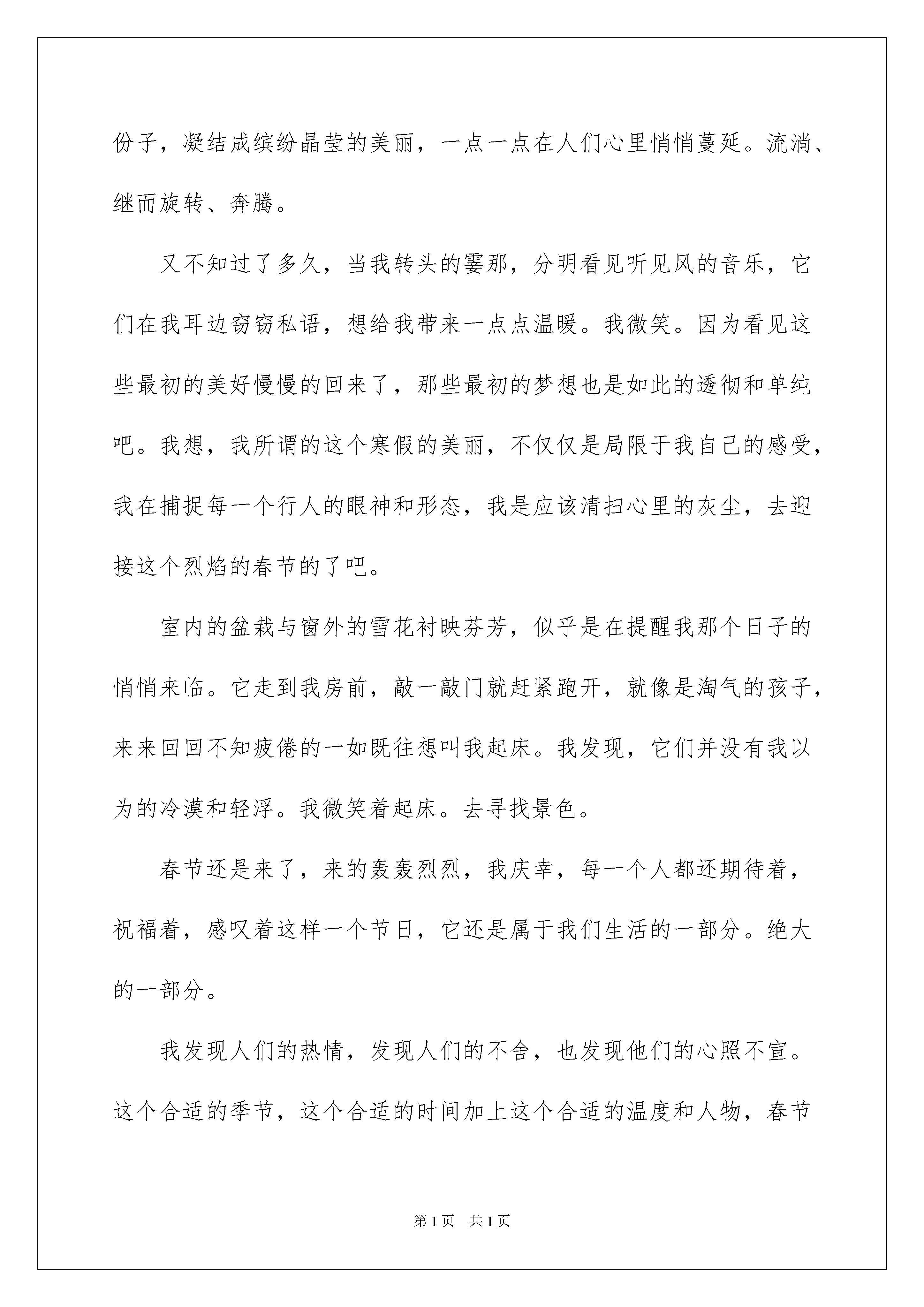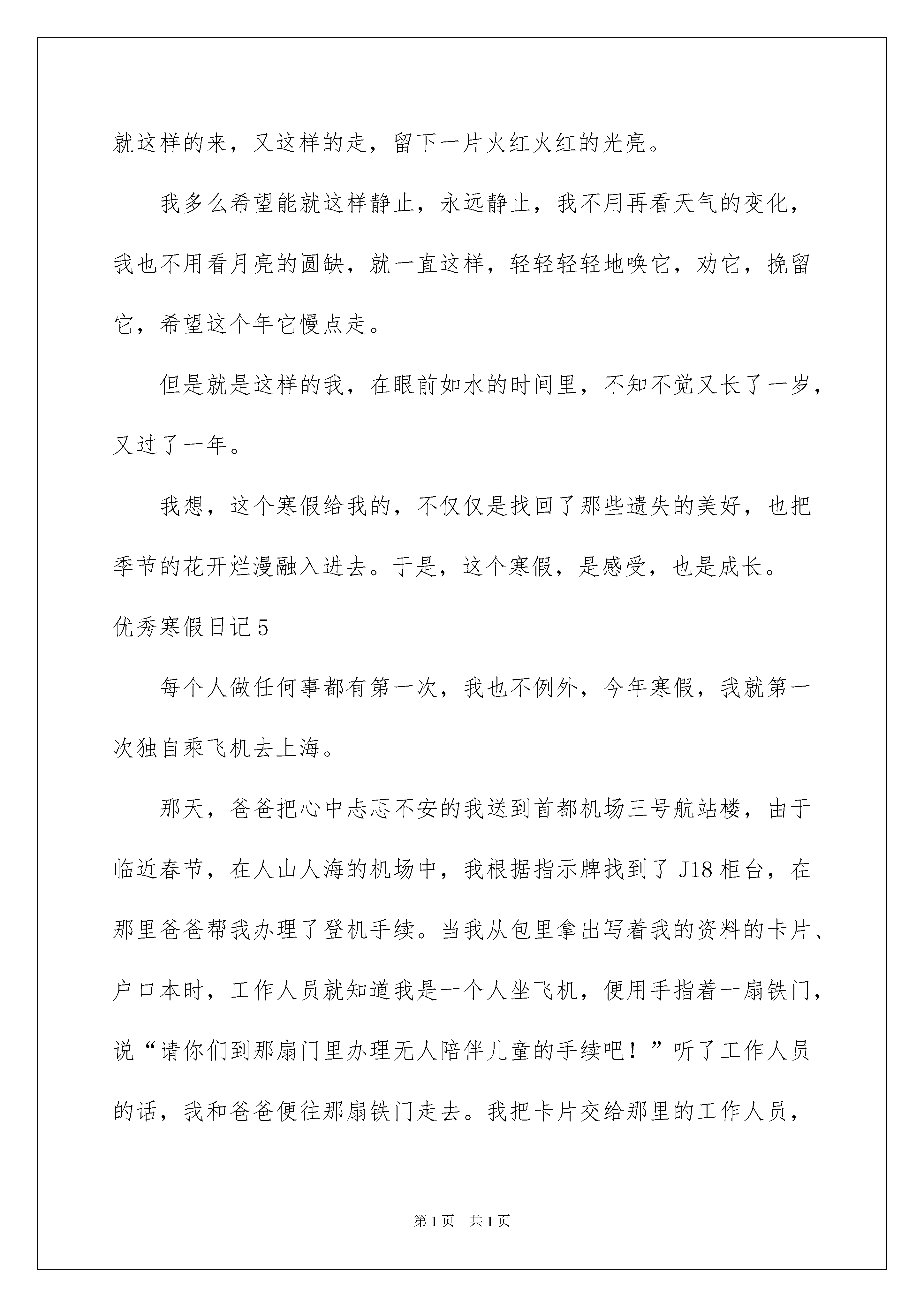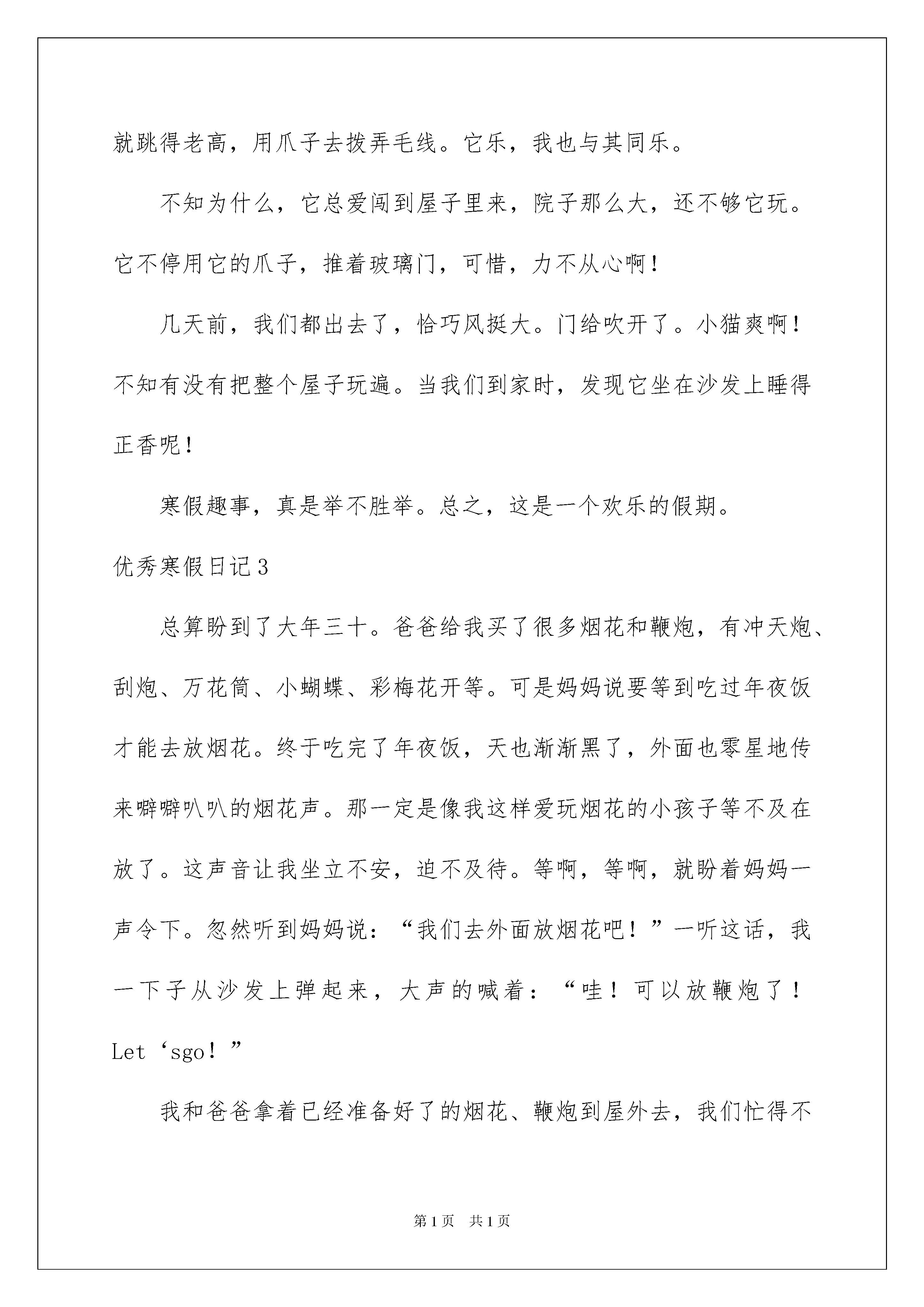 2022优秀寒假日记优秀寒假日记时间过得真快,一天又过去了,相信大家这一天里都收获颇丰吧,这时候十分有必须要写一篇日记了。快来参考日记是怎么写的吧,以下是我精心整理的优秀寒假日记,欢迎大家借鉴与参考,希望对大家有所帮助。优秀寒假日记1我们现在已经是生了,很久没去过,之:。基本上都忘记幼儿园的了。今天我们又回到了幼儿园。刚到有幼儿园,我们差点都迷路了。似乎有点陌生。到了幼儿园,发现们都没什么。我发现自己的个子还算高的呢。我们一起打打闹闹,拍了照片和录像。后来,我们回到了原先的教室。现在有很多中班的同学在做手工。我们摸了摸那里摆放的玩具,不舍的放手,专题作文。接下里,我们表演了节目。都是一年级的内容:诗歌朗诵。很快,幼儿园的生活又结束了,我们很不舍的离开了幼儿园。2月7日-去西湖游玩星期天,我和去西湖游玩。我们看到那边人来人往,塞满了整个西湖。有很多唱戏的人,还看到了很多乐器。有二胡,锣鼓等等。还有人在那里打牌。我们走过了几座桥,桥很陡,我们走的很小心。多出来走走也是身体么!2月12日去外婆家今天我们去外婆家。我们是走的是杭金衢高速公路。路真长啊!也很好。车子还没停下,外公和弟弟还有小白(狗狗)已经在路上迎接我们了。到了外婆家,我就开始和小白(狗狗),弟弟玩耍了。我们玩积木、吹气球、还玩了机关枪。还放起了烟花,烟花非常美丽。我都舍不得松手了。这里真是太好玩了。都不想回家了。2月13日大年三十今天是大年三十。大人们从早就开始忙了。妈妈和外婆一直在厨房忙着为大家准备一顿丰富的晚餐,也就是年夜饭。外公在贴门联。我看到他们是把福字倒着贴,是为了表示福到了!姨父跟着我们放烟花。大人都很忙,小孩却嘻嘻哈哈的玩耍。4点左右,我们开始放鞭炮了,非常响亮,非常美丽。小孩都戴上了帽。放完鞭炮,我们拜了祖宗。然后就开始享受美味的年夜饭了。我最喜欢的是金华的糖糕,软软的,甜甜的,真好吃。还有一些金华特产,我都叫不出名字。大家都很开心,很。金华真热闹啊!2月14日堆人早上起床,我发现外面白茫茫的一片。下雪了!啊,雪真大啊,只可惜别来来往往的人踩坏了。院子里我雪被外公外婆扫成了一堆。吃完早饭,外公堆了个雪人。还给他带上了帽子,穿了衣服。真像个小人,我感觉今天非常快乐!2月28日节生活今天是元宵节,也就是正月十五。妈妈说,过了元宵过年也就结束了。也不能在放烟花了。晚上7点,我们出去看烟花,到处都是烟花,格外漂亮。我们还买了一个老虎的灯笼。回到家,吃了一碗甜甜的汤圆。优秀寒假日记2一个快乐而短暂的寒假悄悄地从我们的身边溜走,我们又迎来了一个新的学期,发生在寒假的趣事就像天空中的星星,数不胜数,是我心头不可抹杀的一件件往事。每一颗星星都闪闪发亮,每一件往事都刻骨铭心。一、看云、看水、看梯田,人间仙境南尖岩朋友曾经告诉我,丽水范围内的经典景点,在南尖岩都可以看到,那里简直就是丽水风光的集锦。果真如此?在这个寒假,终于让我有机会仔细地品味了南尖岩。云海是一特色,极为壮观。海拔1400多米,要看云海不须再登山,只需耐心地等待。这里的云雾来无影去无踪,千变万化,让人难以捉摸。山顶染上一层霞光,山腰绕着片片白云,真是天上人间,如入仙境。当太阳将要升起的一刹那,天空忽然染上一层红霞,只持续了几秒钟,我赶快揿下了相机的快门。不久云海慢慢退去,远处的山上现出几幢房子——便应了“白云生处有人家”的意境。值得一提的是这里的竹海也很有特色。数千亩延绵不断的竹林,既青翠单纯,又多姿多彩。只要你注意观察,一年四季都有好景色。这里还有块高山湿地,里面有个小小的高山湖,有个很好听的名字叫“瑶池”,不知有什么来历和传说。瑶池的奇妙处在于水中长了许多树木,还有碧绿的水草。这种奇观好像在九寨沟才能看到吧。难怪两位上海来的摄影家,架起相机迟迟不肯走,连夸这里是丽水的九寨沟。这里的梯田也确实值得一看。主要还在于这里的农民特别善于精耕细作,早早地开始备耕犁田,水面如镜,田埂似绳,是诗还是画?是水墨、木刻、油画还是水彩?二、与猫同乐从前,我养过一只小兔子,可是没过多久,就死了,后来,我便没敢养会令人生感情的动物,因为我怕它受伤,怕它生病,更怕它离开我……但半年前,妈妈抱来一只好可爱的小猫,它的毛黄白相间,显得颇有层次感,还有那炯炯双目,怎能让人不喜欢?因为对它的喜爱,超过了害怕,于是我养了它。听说它最喜欢玩毛线球,于是有一天我把家翻了个遍,找到了一小卷,逗它玩。我总会把毛线球举得很高,然后左右不停地晃动,它就跳得老高,用爪子去拨弄毛线。它乐,我也与其同乐。不知为什么,它总爱闯到屋子里来,院子那么大,还不够它玩。它不停用它的爪子,推着玻璃门,可惜,力不从