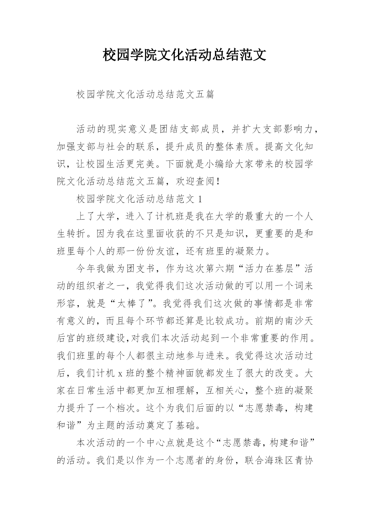 校园学院文化活动总结范文校园学院文化活动总结范文五篇活动的现实意义是团结支部成员,并扩大支部影响力,加强支部与社会的联系,提升成员的整体素质。提高文化知识,让校园生活更完美。下面就是小编给大家带来的校园学院文化活动总结范文五篇,欢迎查阅!校园学院文化活动总结范文1上了大学,进入了计机班是我在大学的最重大的一个人生转折。因为我在这里面收获的不只是知识,更重要的是和班里每个人的那一份份友谊,还有班里的凝聚力。今年我做为团支书,作为这次第六期“活力在基层”活动的组织者之一,我觉得我们这次活动做的可以用一个词来形