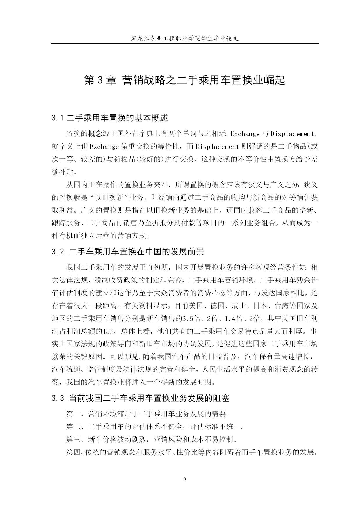 毕业论文汽车4S店运营模式之营销战略黑龙江农业工程职业学院学生毕业论文PAGEII黑龙江农业工程职业学院学生毕业论文PAGEI摘要本论文是在服务营销理论指导下,通过对乘用车市场现状的分析,根据乘用车销售的特点,探讨汽车4S店的发展模式,剖析汽车4S店现营销模式中所存在的漏洞,进而提出在服务营销的基础上,拓展二手车市场在4S店中的地位,使企业增加收益的同时,更有效地带动二手乘用车行业的发展。关键词:汽车4S店;服务营销;二手车置换;黑龙江农业工程职业学院学生毕业论文